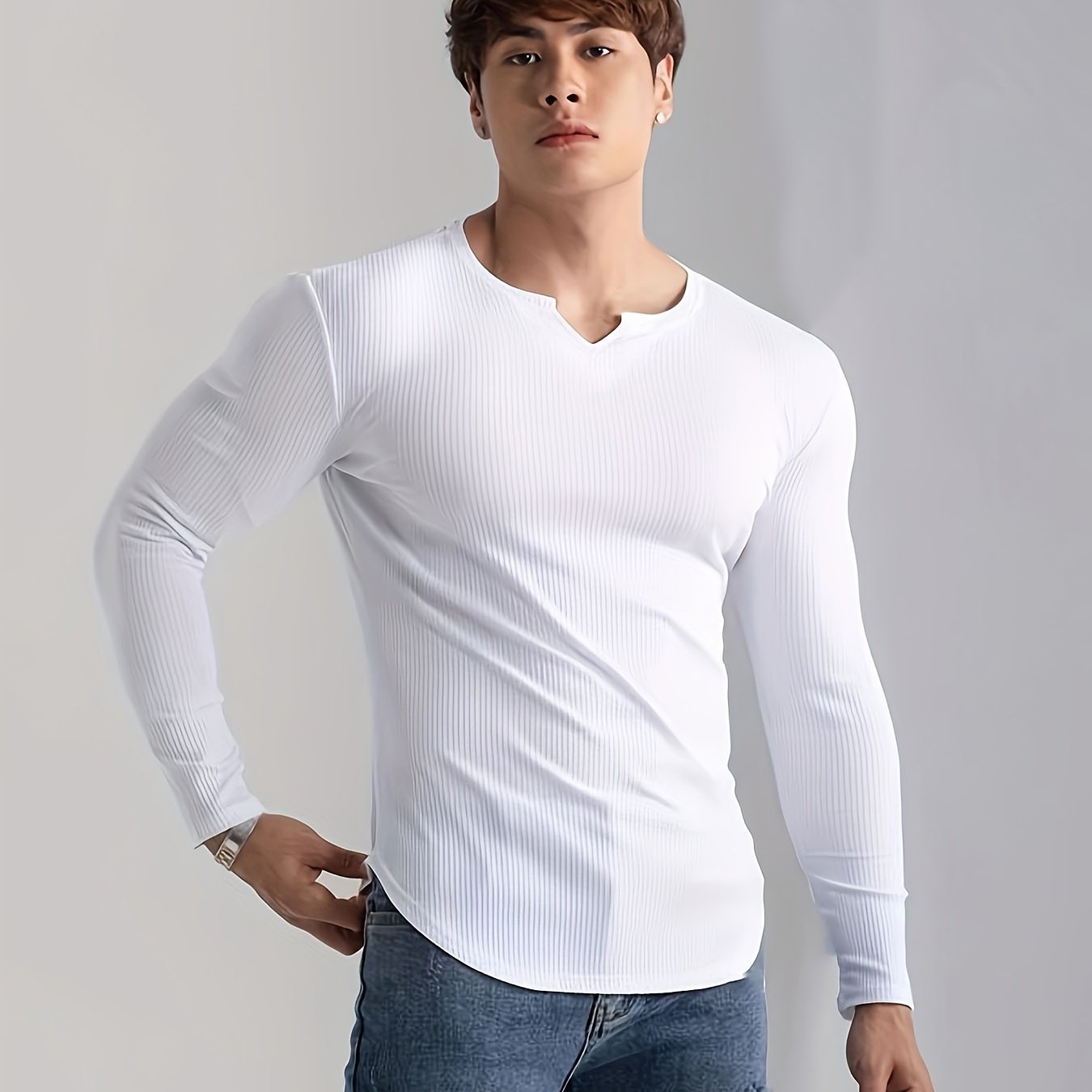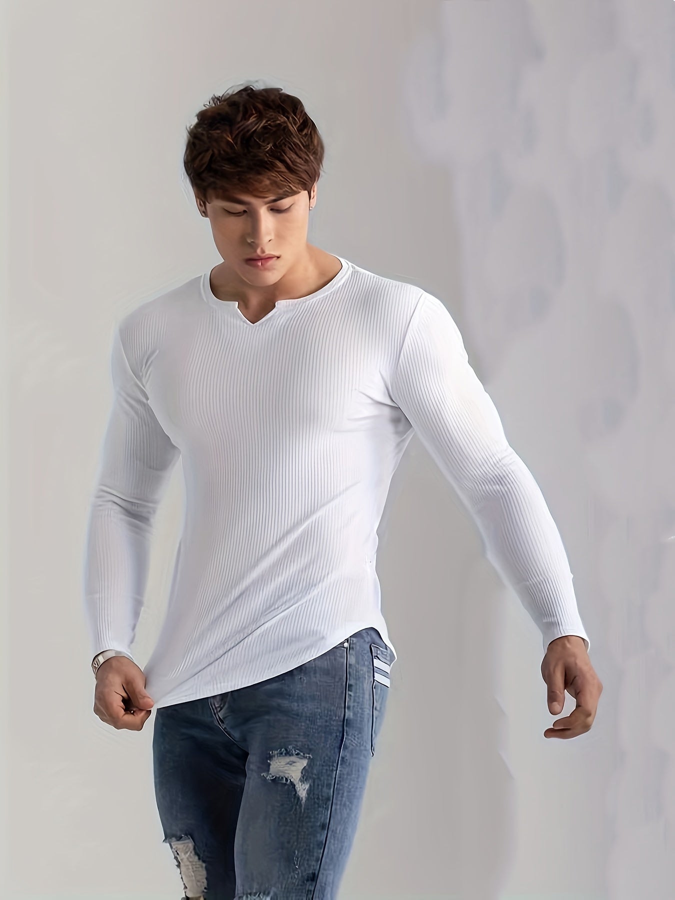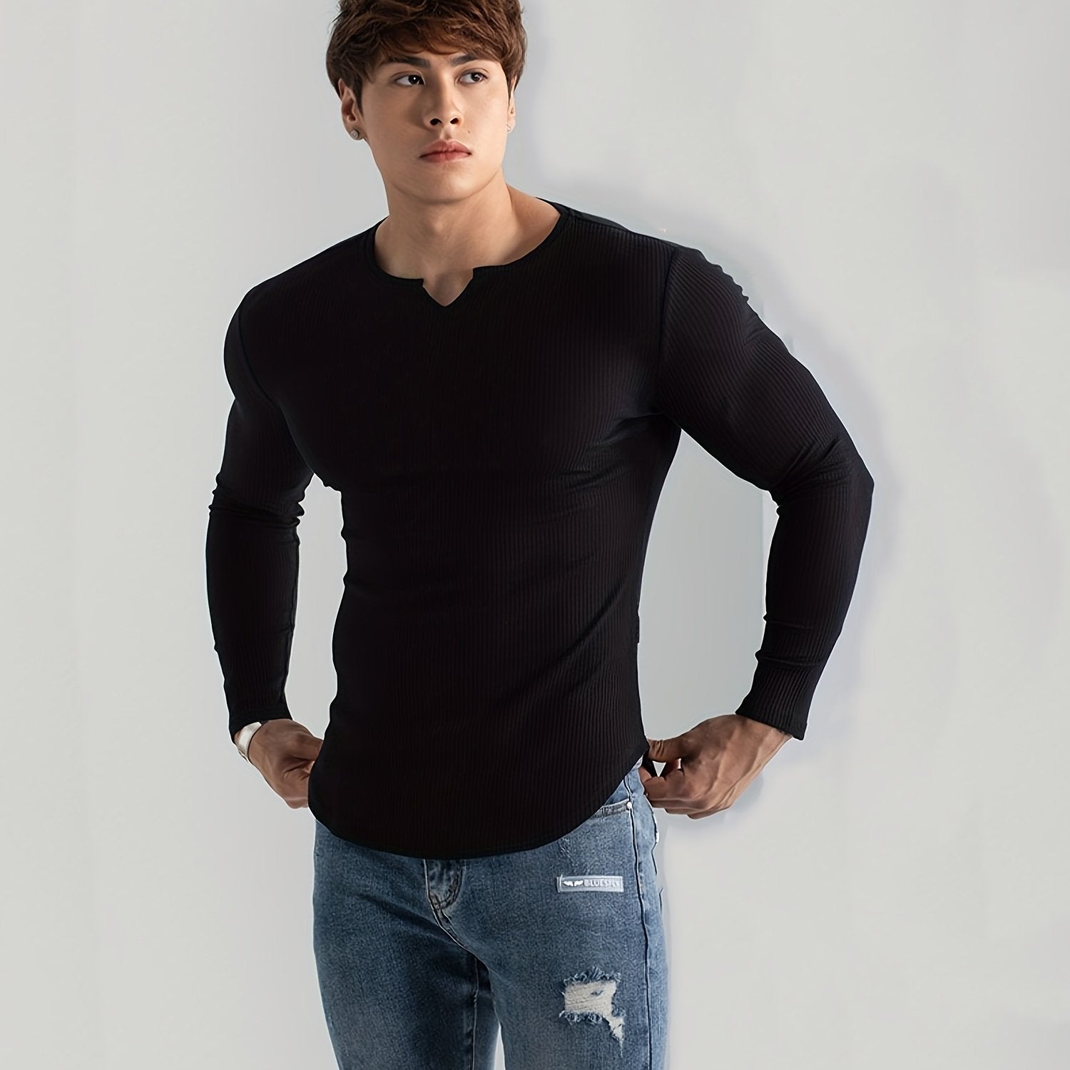 Erkaklar uchun bir rangli uzun qo'lqonli V-yuqa futbolka, bahor va kuzda ochiq havoda qulay va norasmiy kiyim uchun.