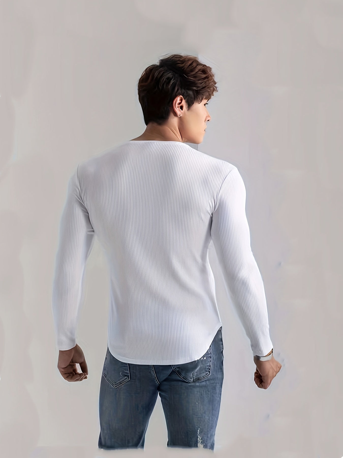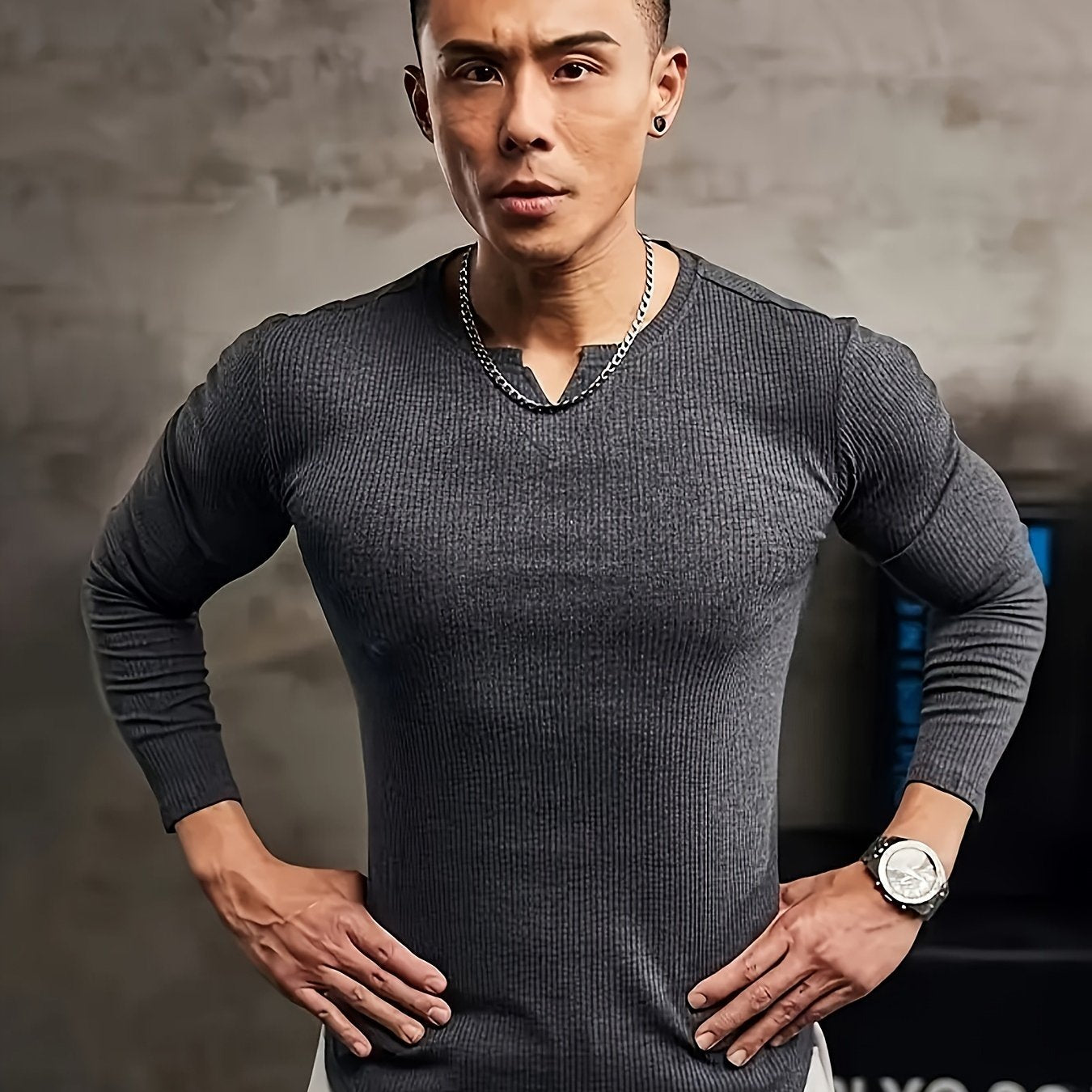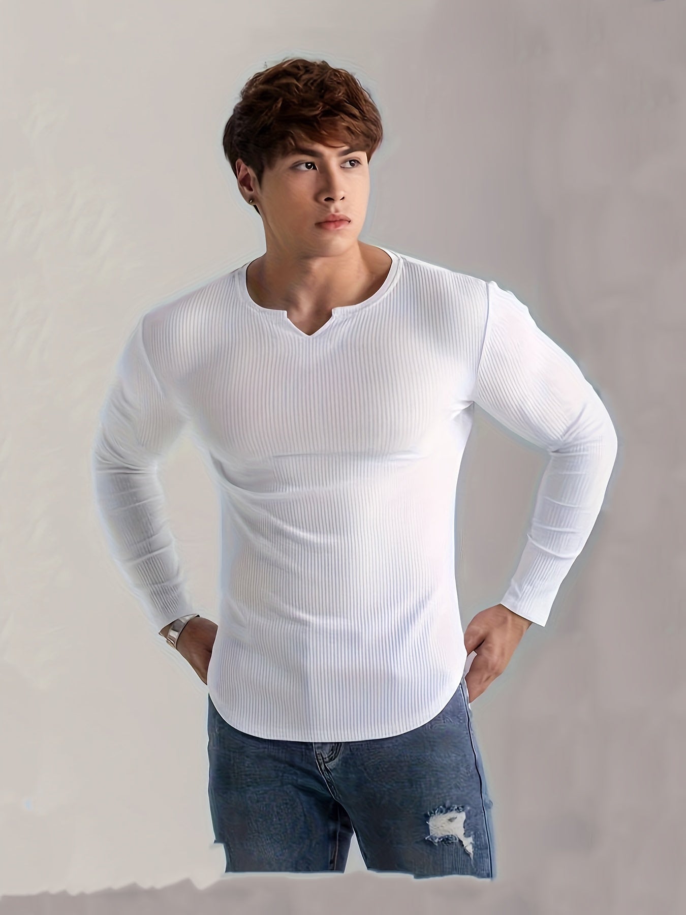 Erkaklar uchun bir rangli uzun qo'lqonli V-yuqa futbolka, bahor va kuzda ochiq havoda qulay va norasmiy kiyim uchun.
