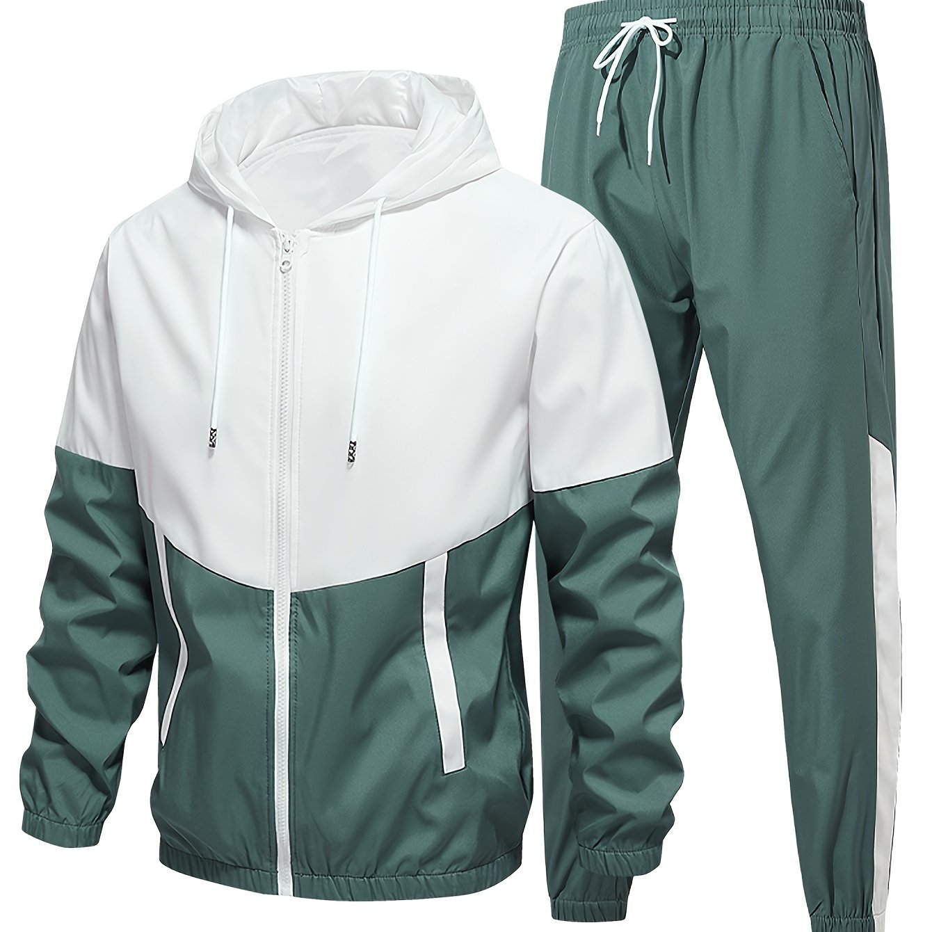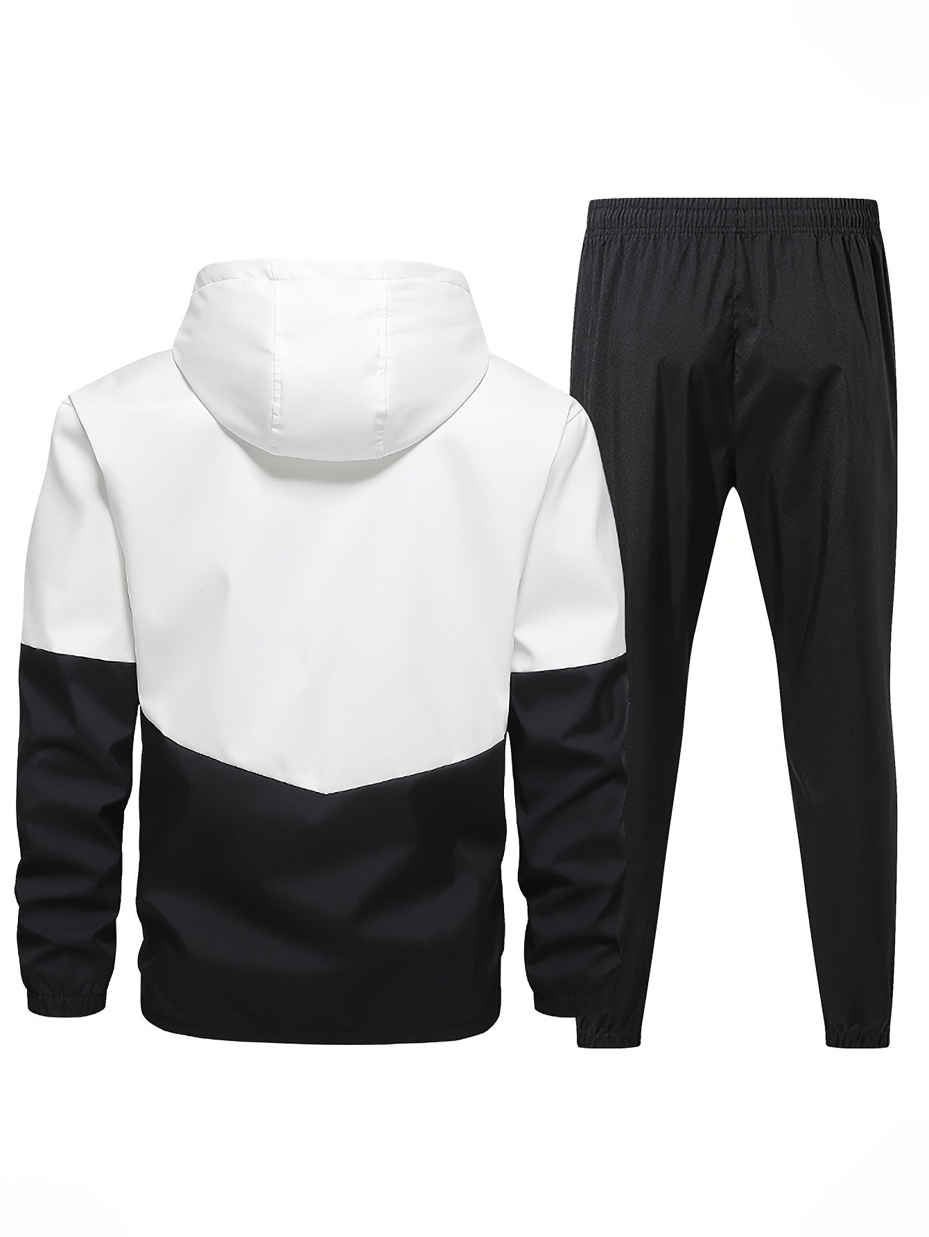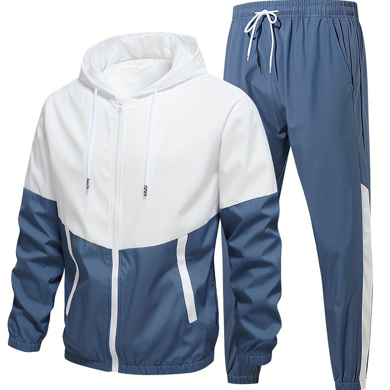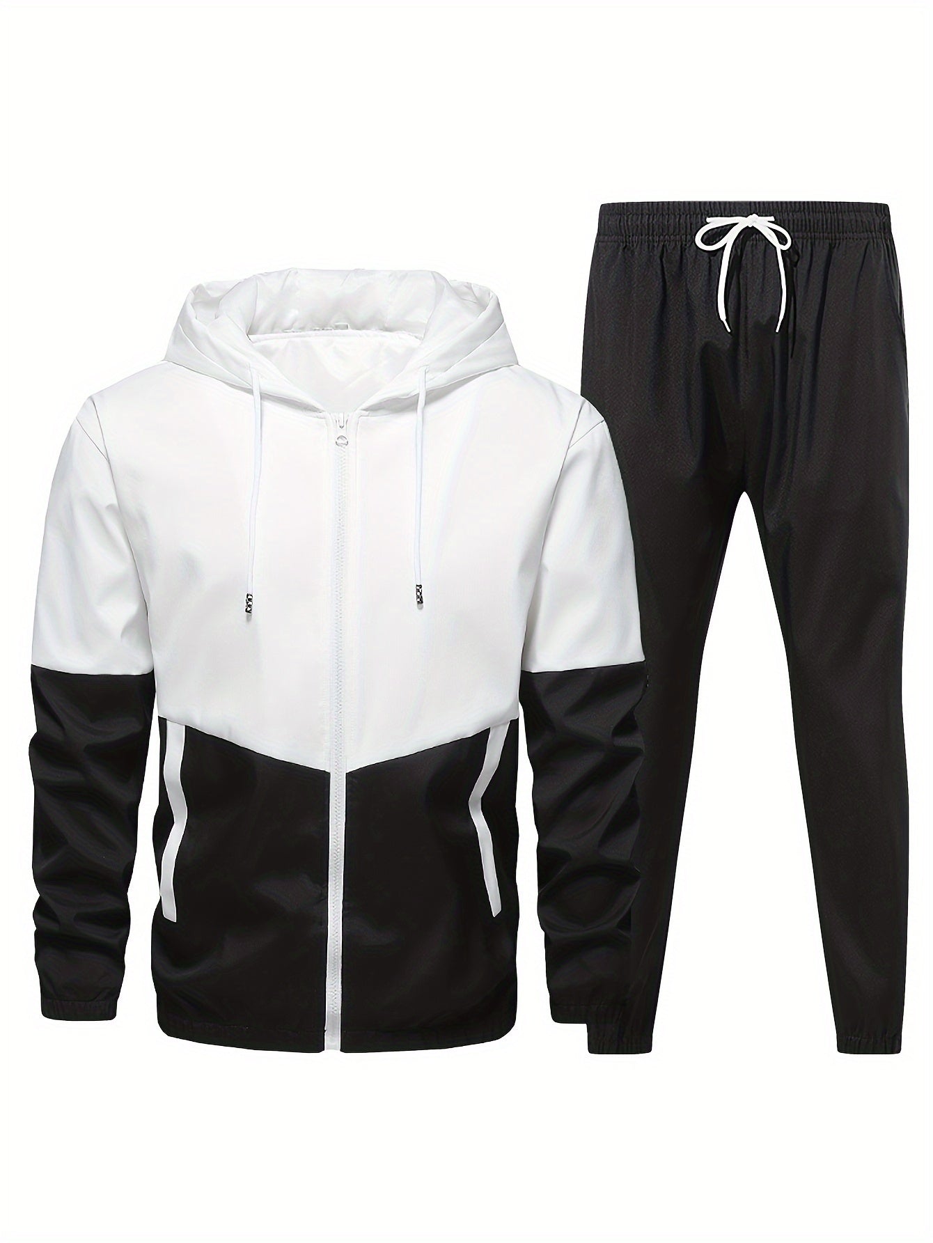 Yoz, kuz va qish mavsumi uchun kapüşonli kurtka, shortlar va shimlardan iborat erkaklar sport tasodifiy kostyumi, rang blokirovkasi bilan juft uslubida.