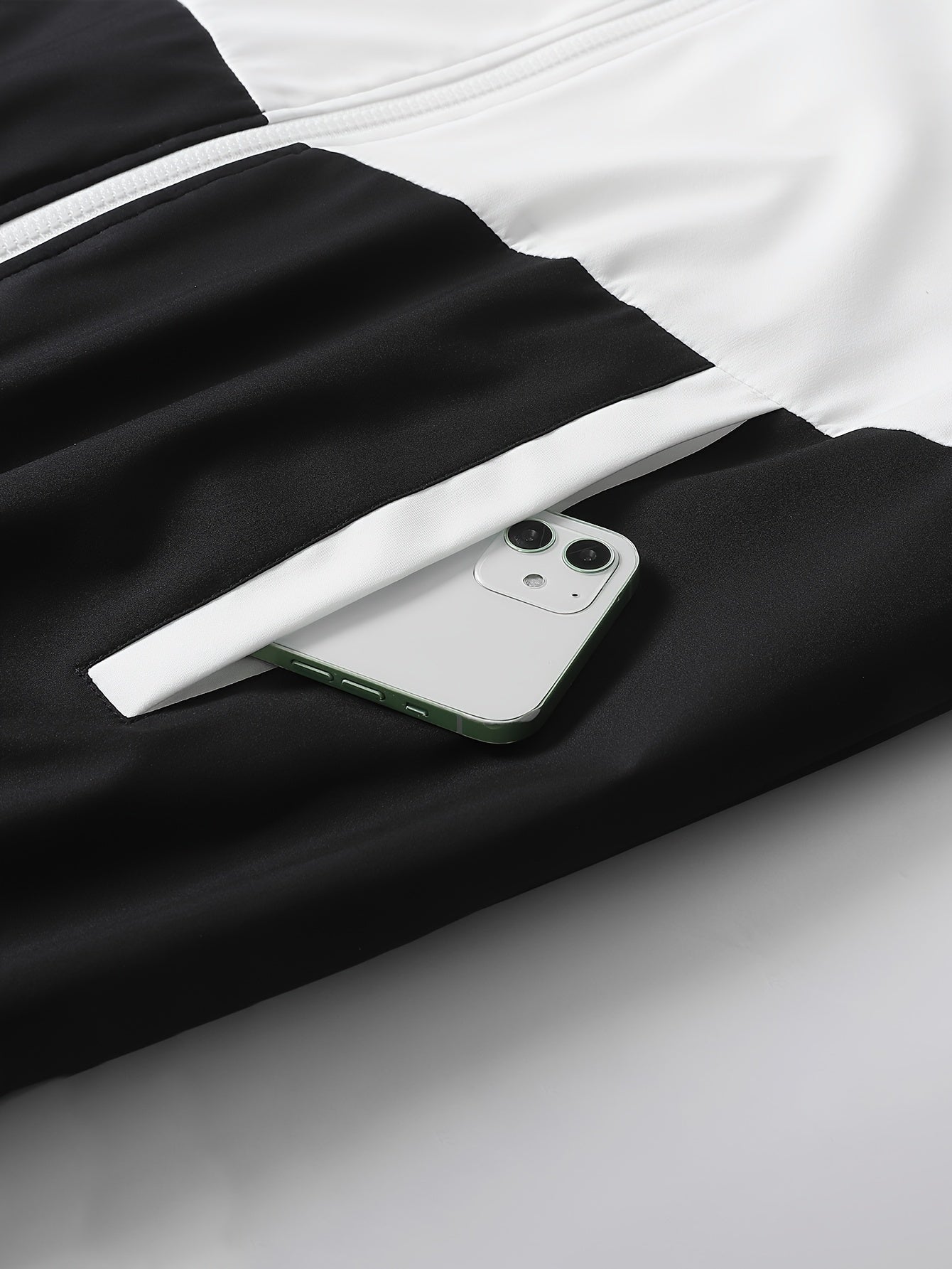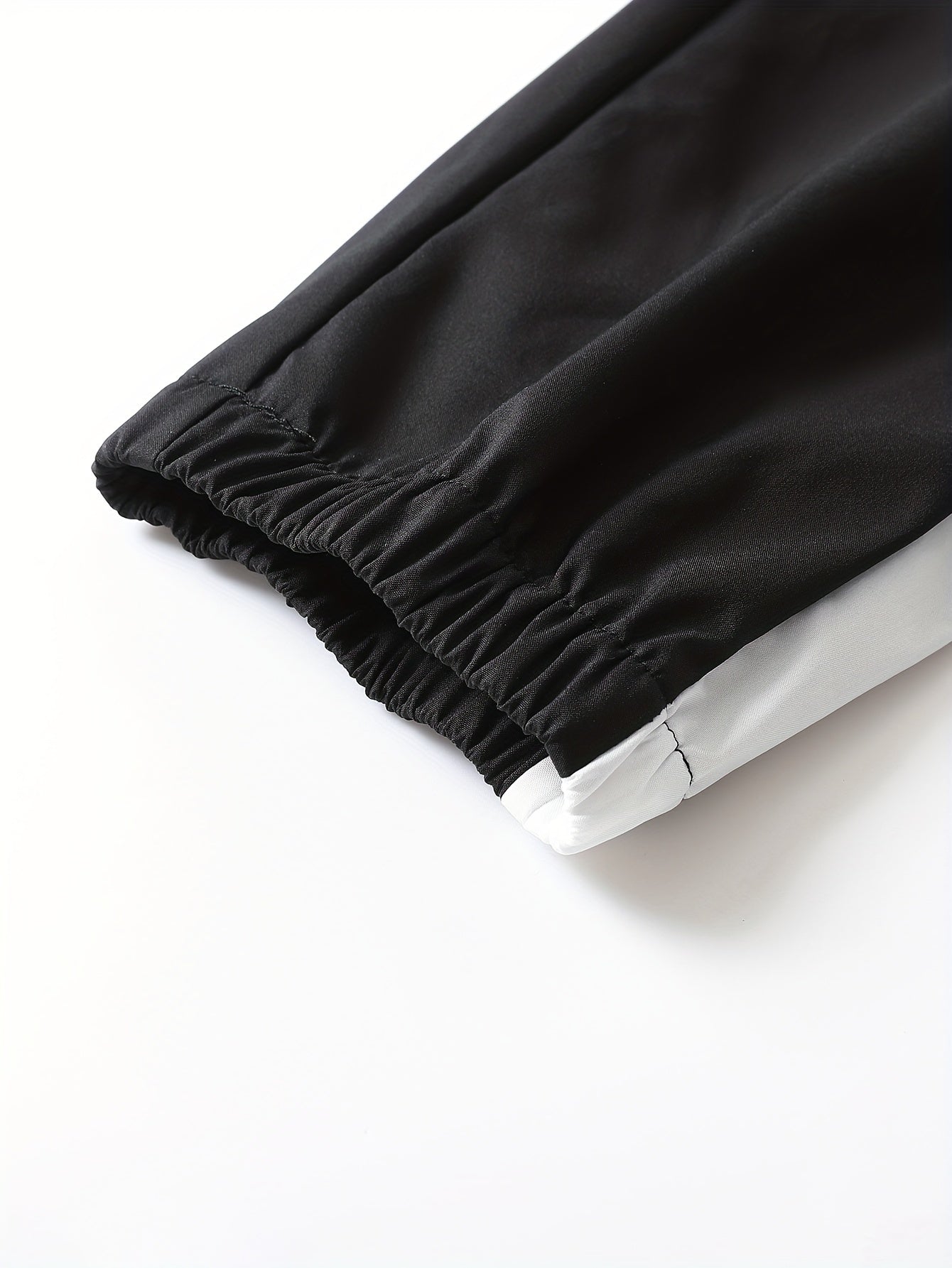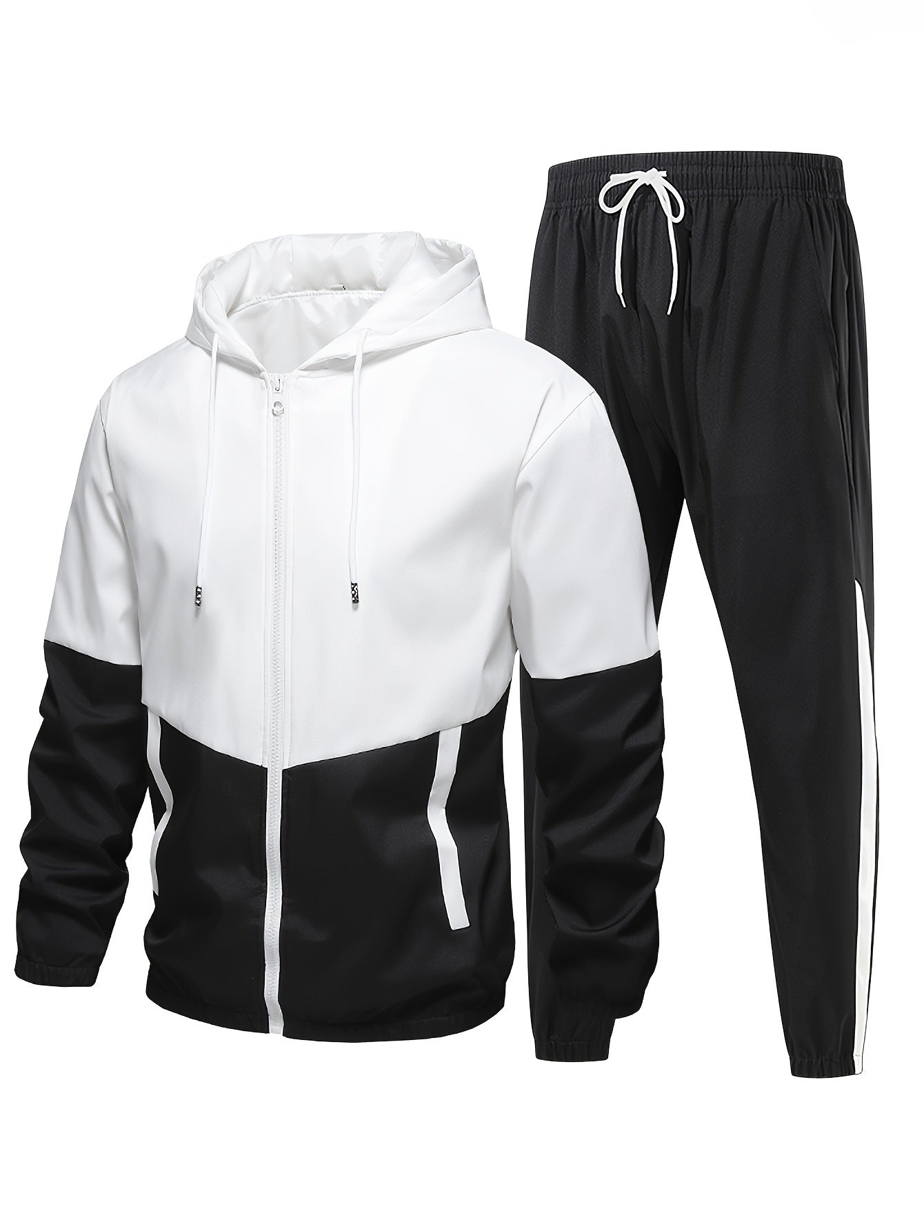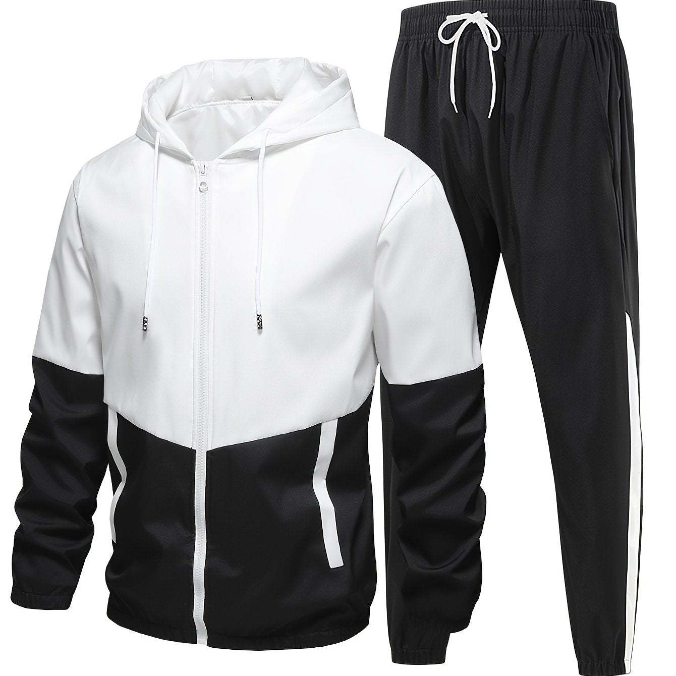 Yoz, kuz va qish mavsumi uchun kapüşonli kurtka, shortlar va shimlardan iborat erkaklar sport tasodifiy kostyumi, rang blokirovkasi bilan juft uslubida.