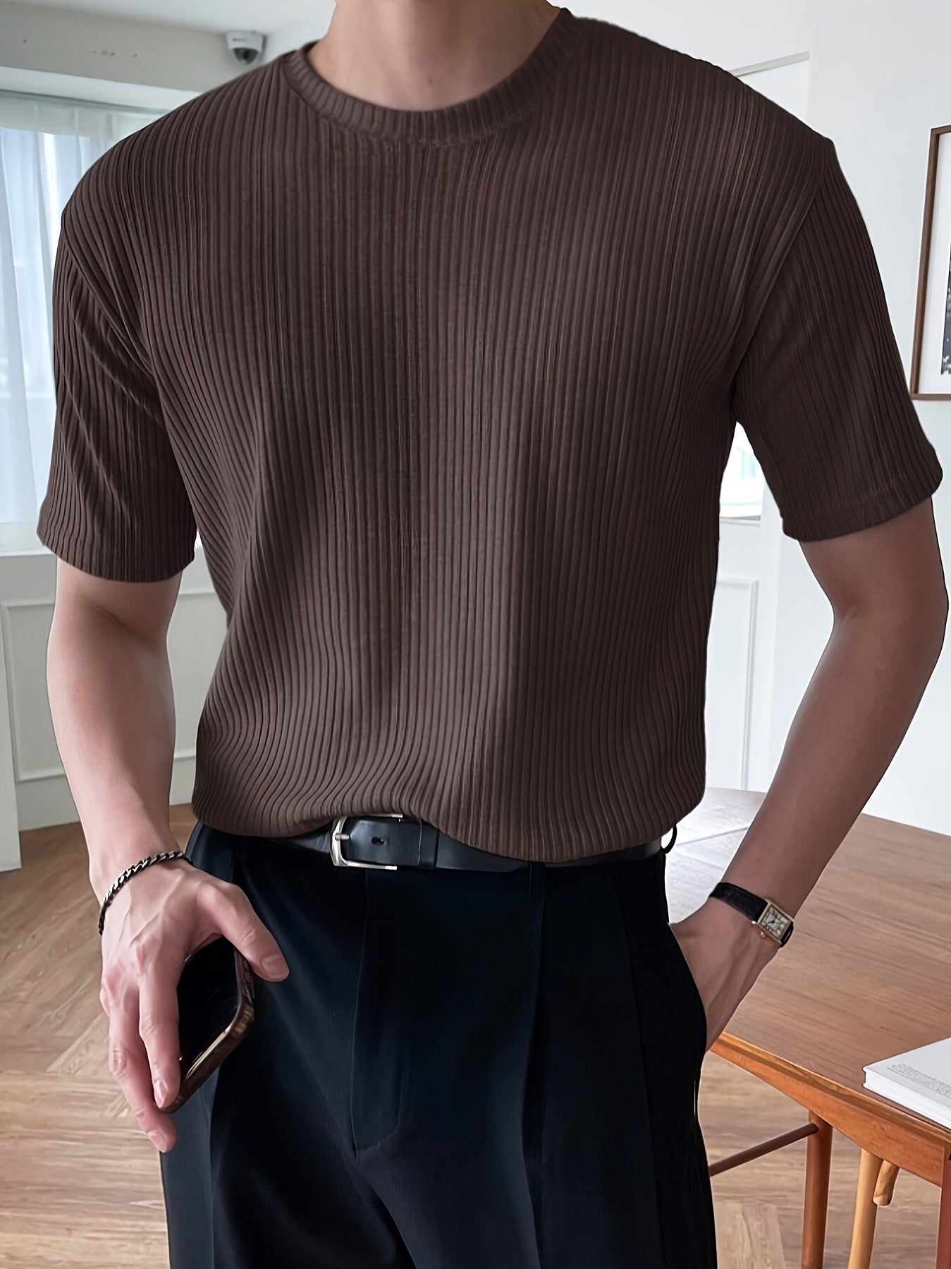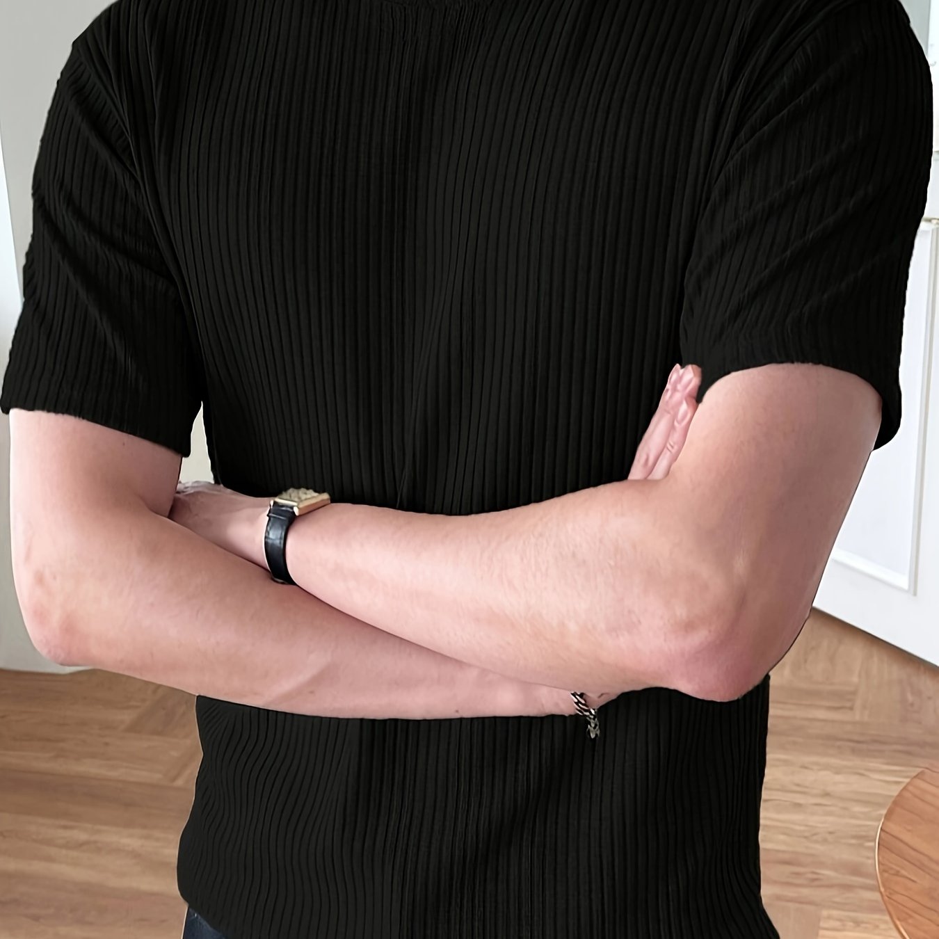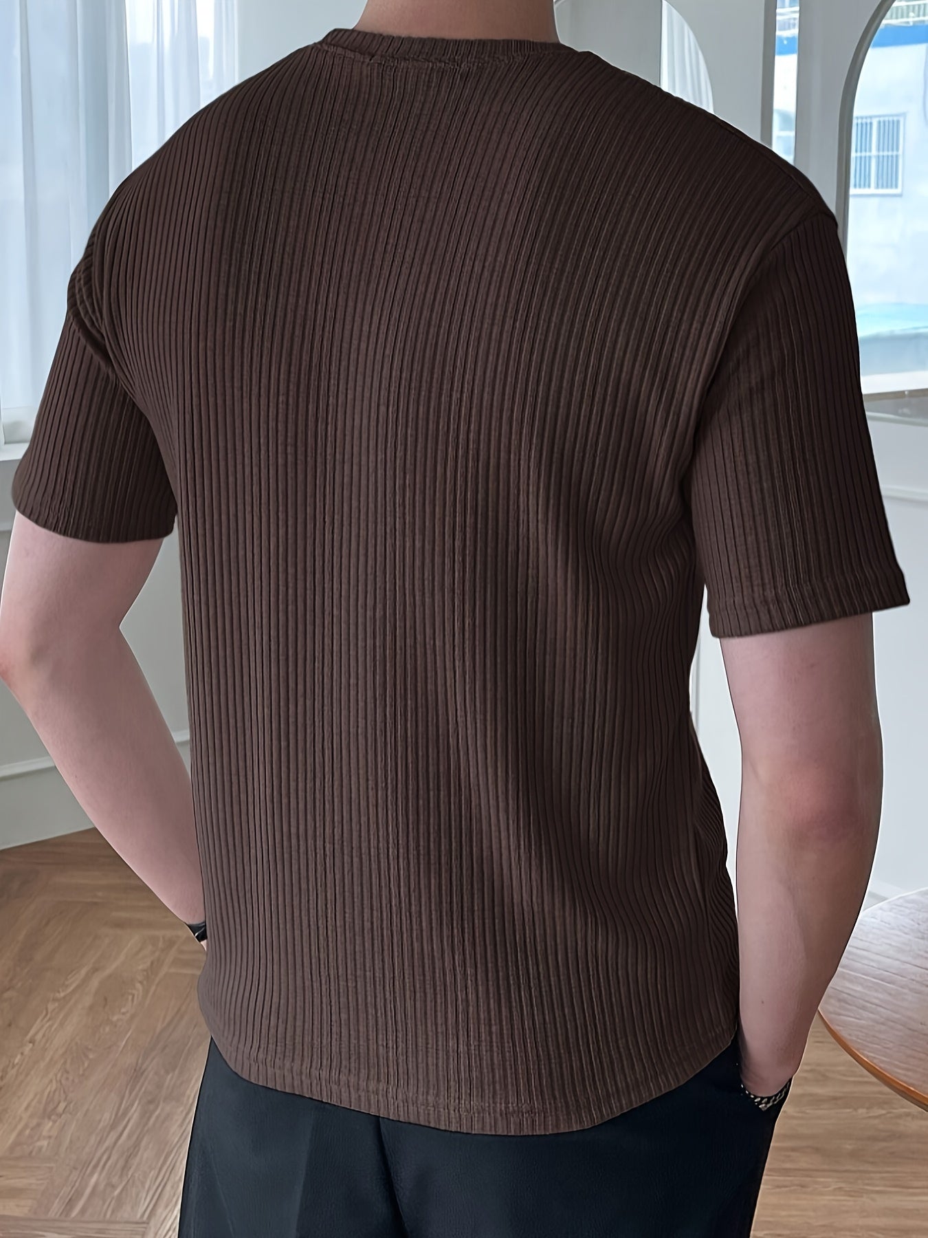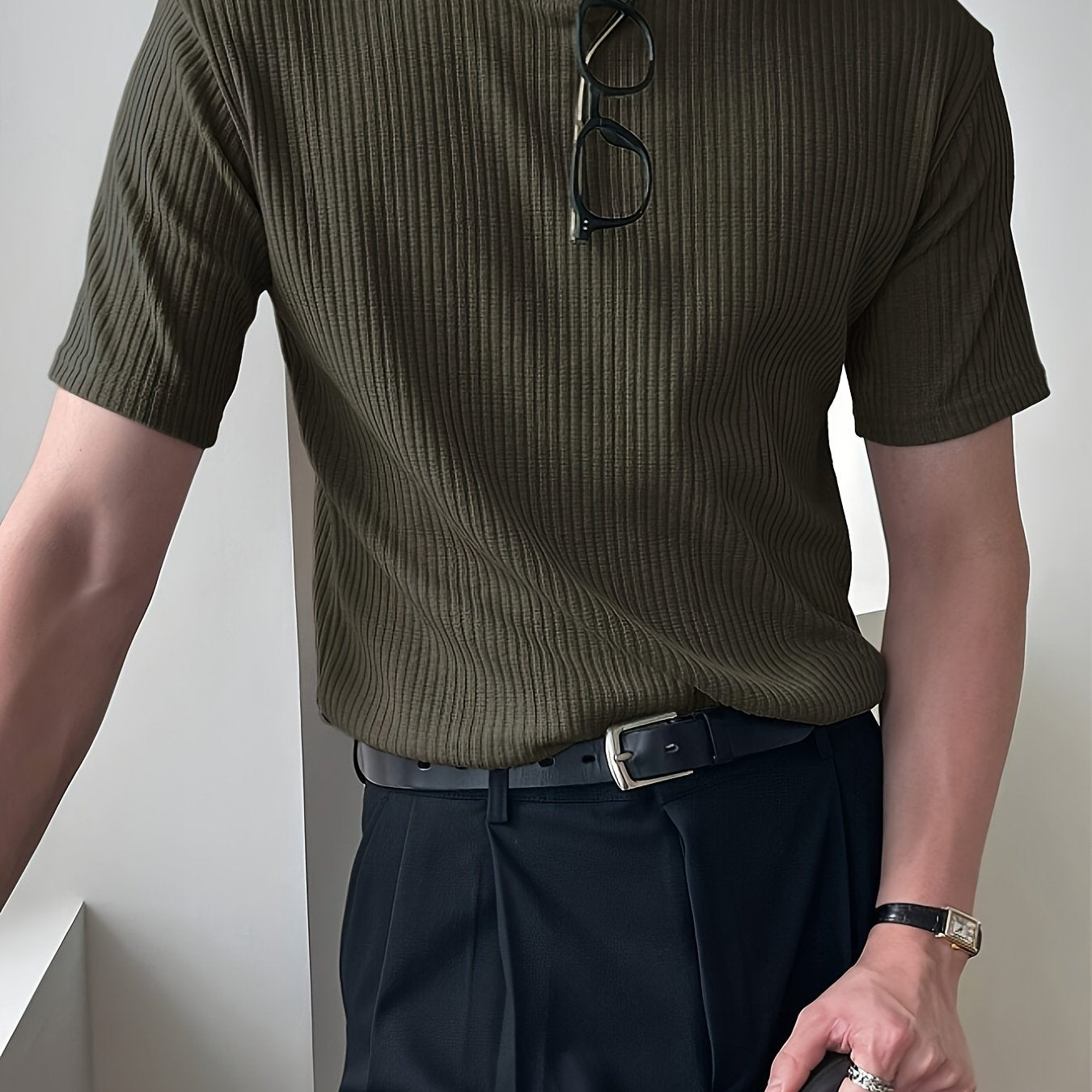 Erkaklar uchun zamonaviy va havo o'tkazuvchi yozgi futbolka, yumshoq bo'yin va qisqa yenglar bilan, bir rangda, kundalik va ochiq havoda kiyish uchun mukammal.