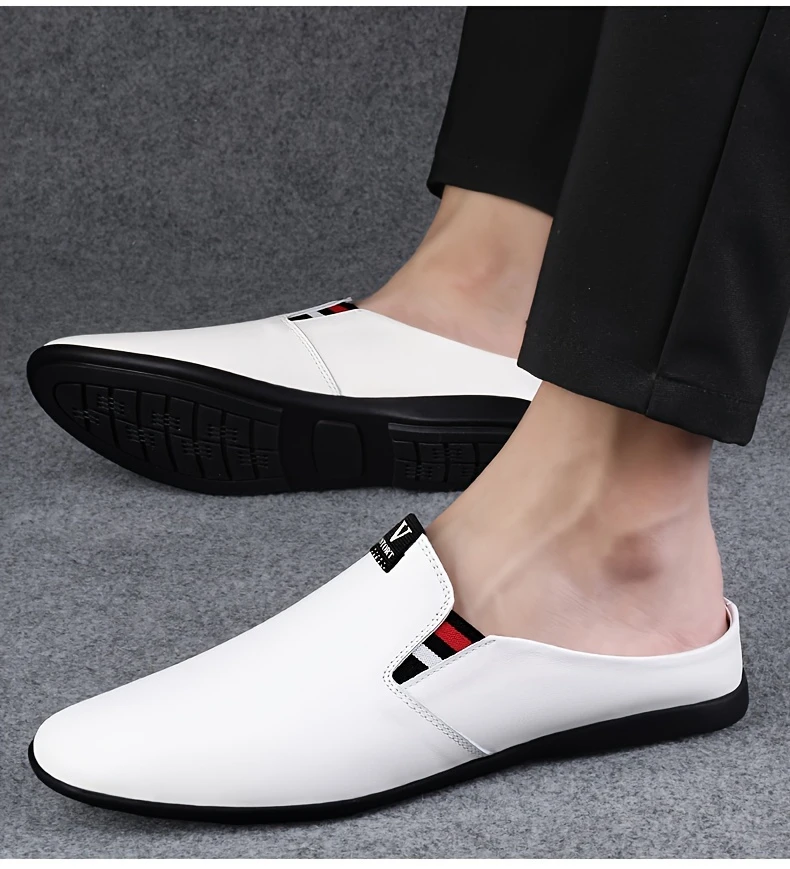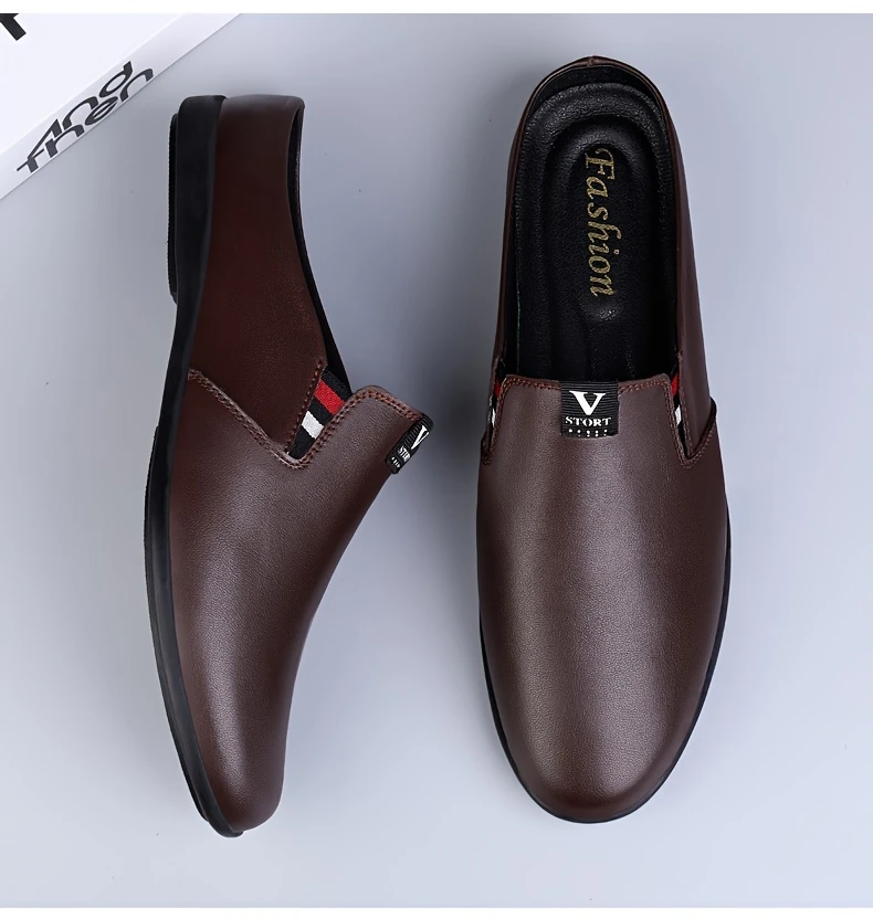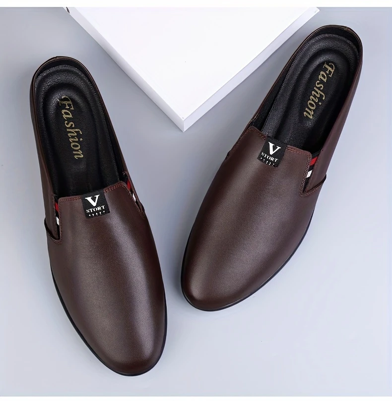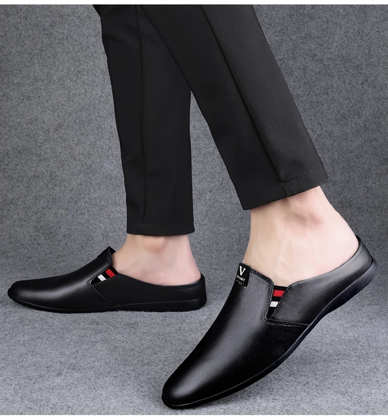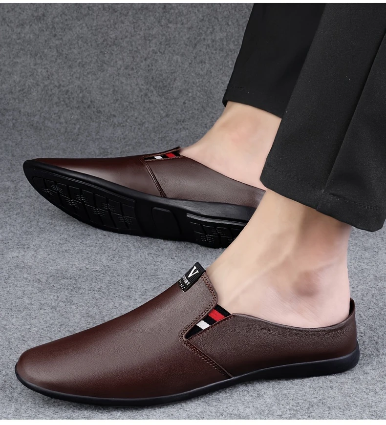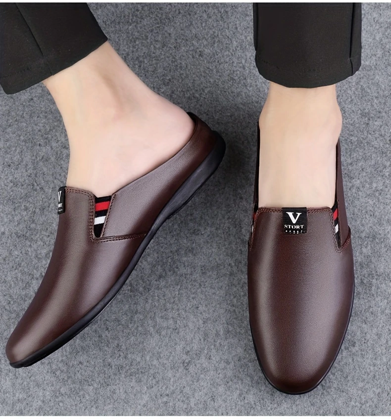 Erkaklar uchun yozgi slip-on mules, nafas oladigan bo'lak teridan yuqori qismi, sirpanmaydigan kauchuk taglik, qulay PU ichki astar, dumaloq barmoq dizayni, tasodifiy kiyimlar uchun tasodifiy uslub.
