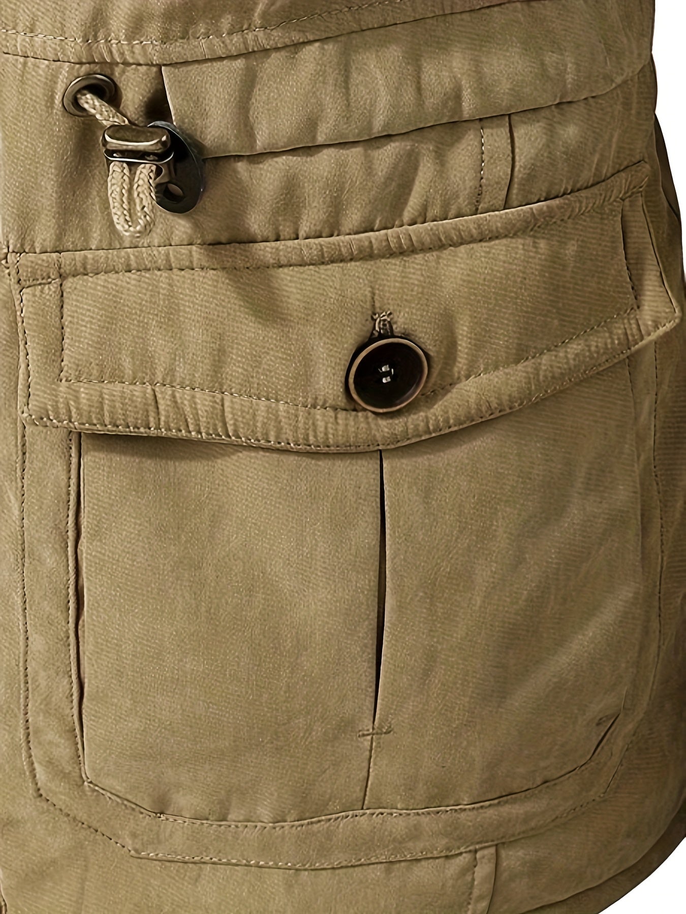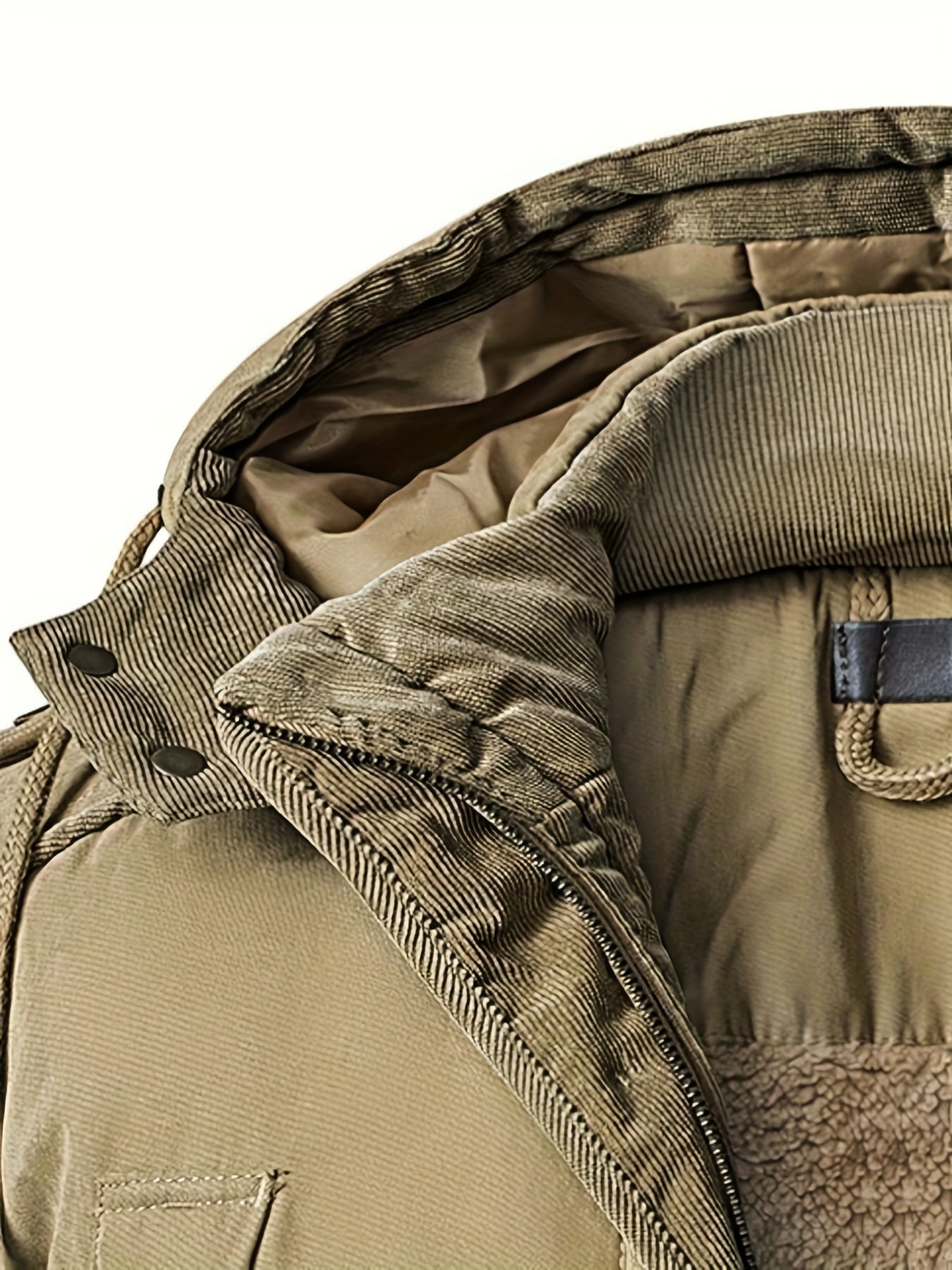 Erkaklar uchun qalin kapüşonli qish palto, bir nechta cho'ntaklar bilan