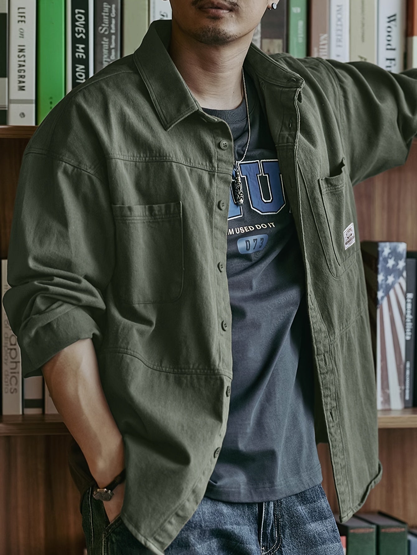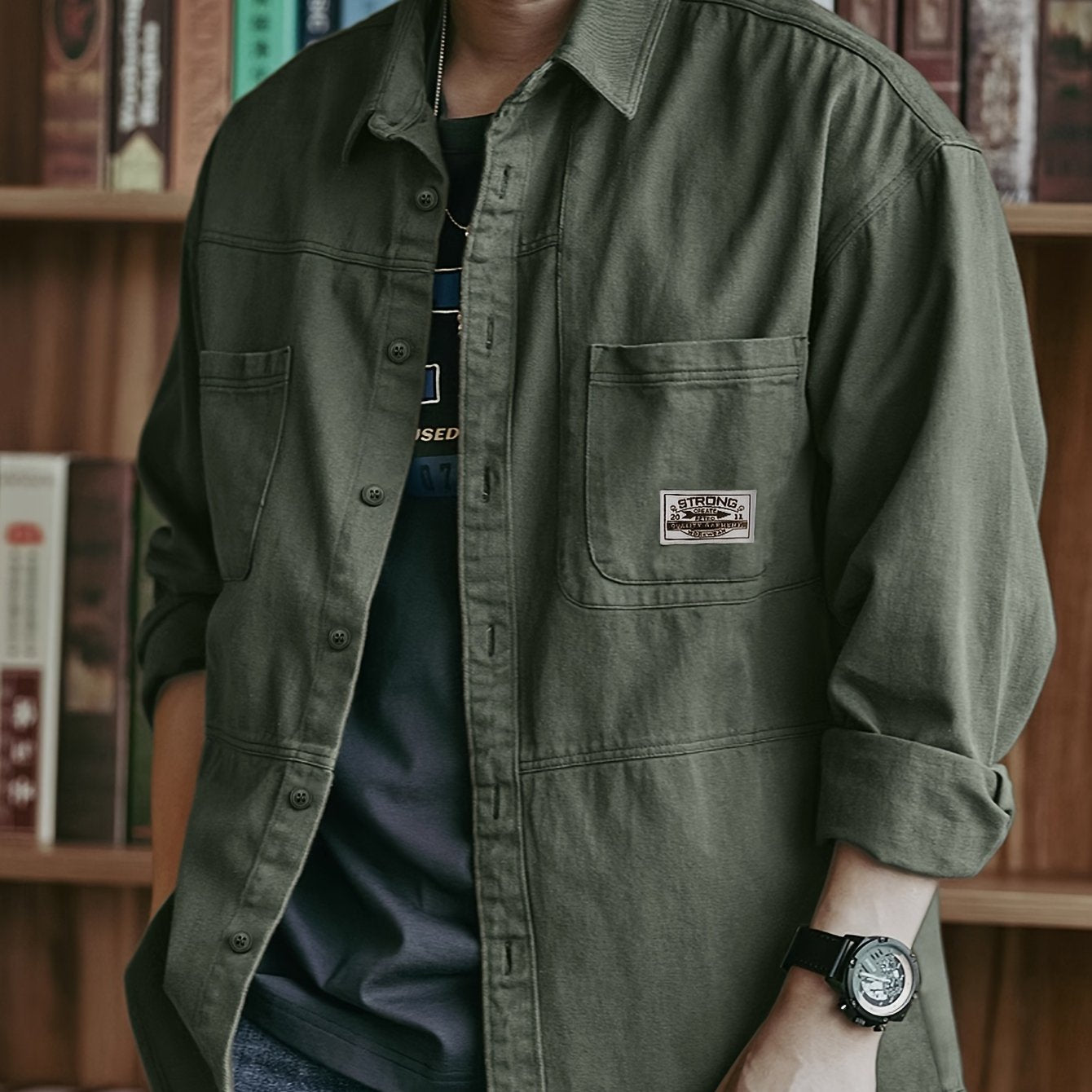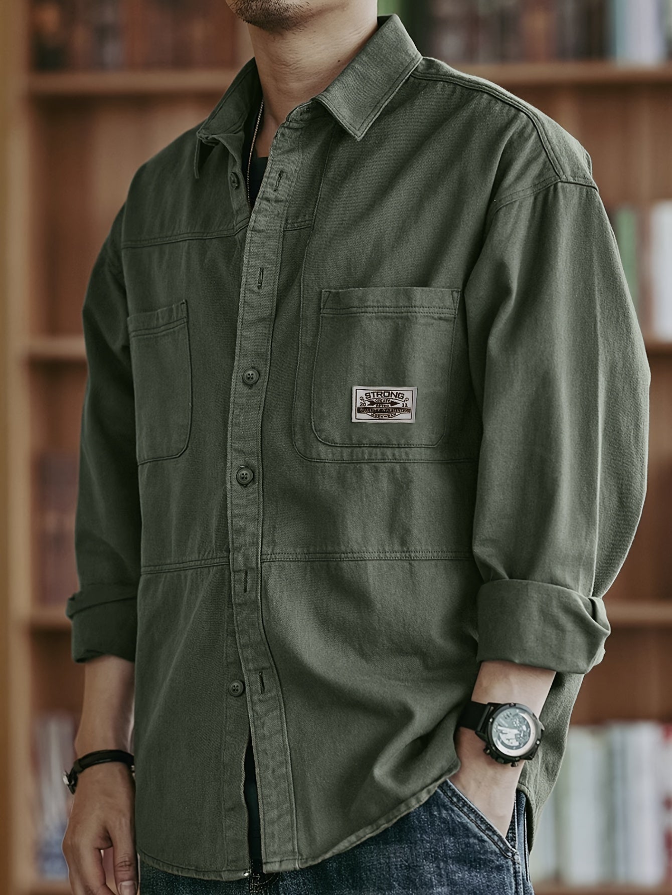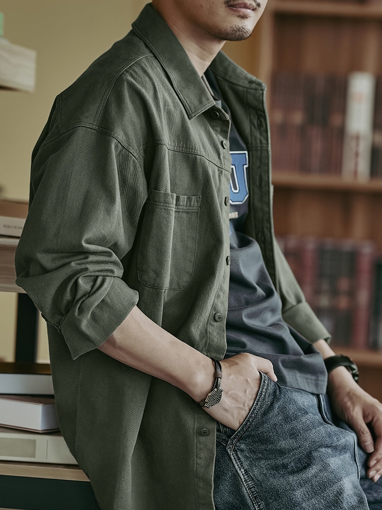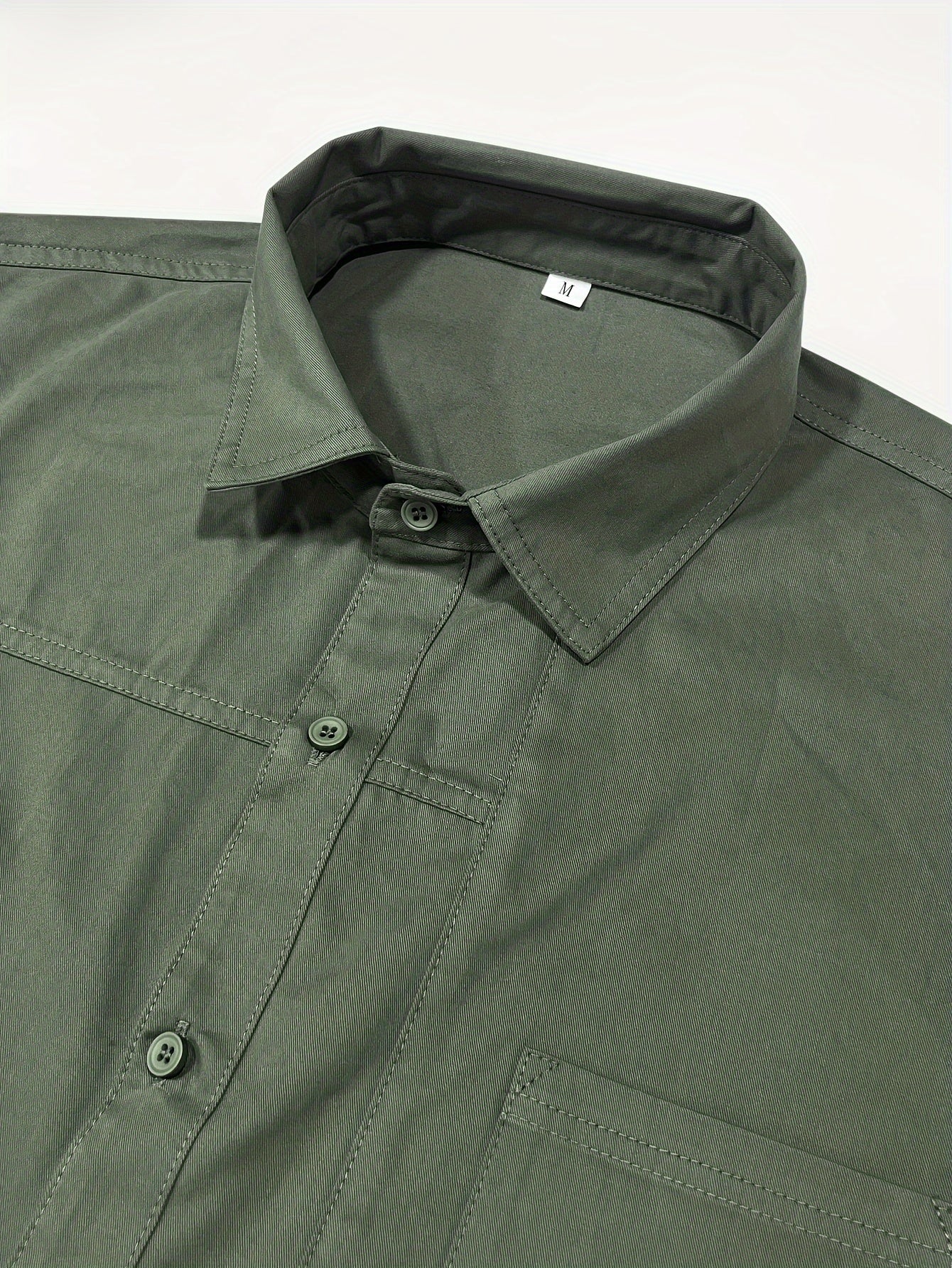 Erkaklar uchun vintage uslubidagi tasodifiy paxta tugmachali ko'ylak, keng kesim, cho'ntaklar, yaka, va ko'ylak yenglari bilan. Bahor/kovakda kundalik kiyim, ish va dam olish uchun ideal.