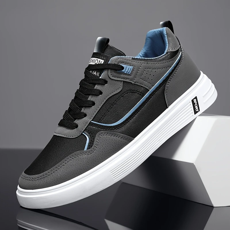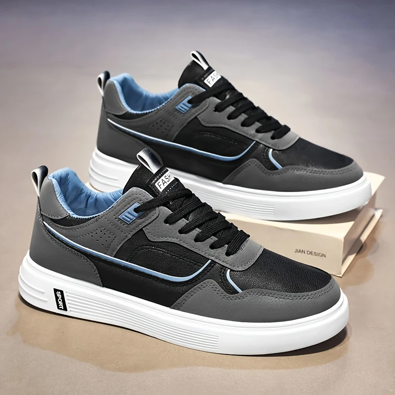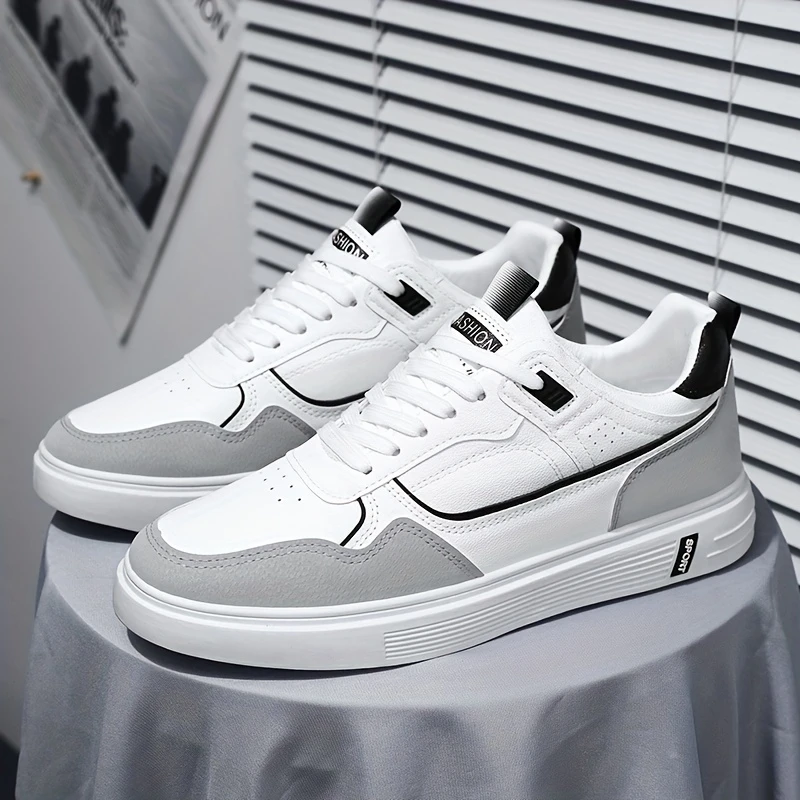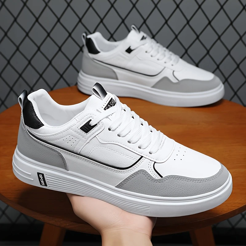 Erkaklar uchun oq tasodifiy sport krossovkalari, nafas oladigan PU ustki qismi, mato astari va PVC tagligi bilan, piyoda yurish, ochiq havoda faoliyatlar va barcha mavsumlarda kundalik kiyim uchun mukammal.