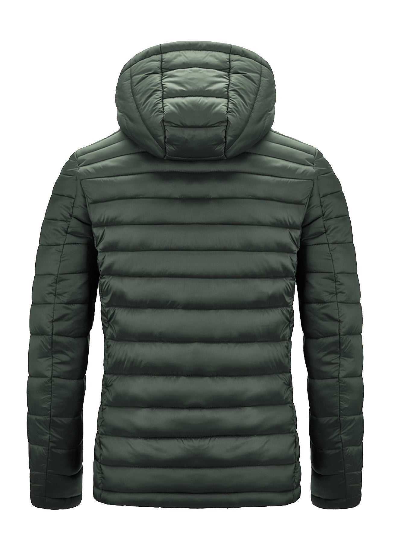 Erkaklar uchun qishki kapüşonli kurtka, yashil va to'q sariq fermuarli cho'ntaklar bilan, iliq naylon-poliester aralashmasidan tayyorlangan. To'liq fermuarsiz dizayn, ribbed bilak qismi va qulaylik uchun tikilgan izolyatsiya xususiyatlariga ega.