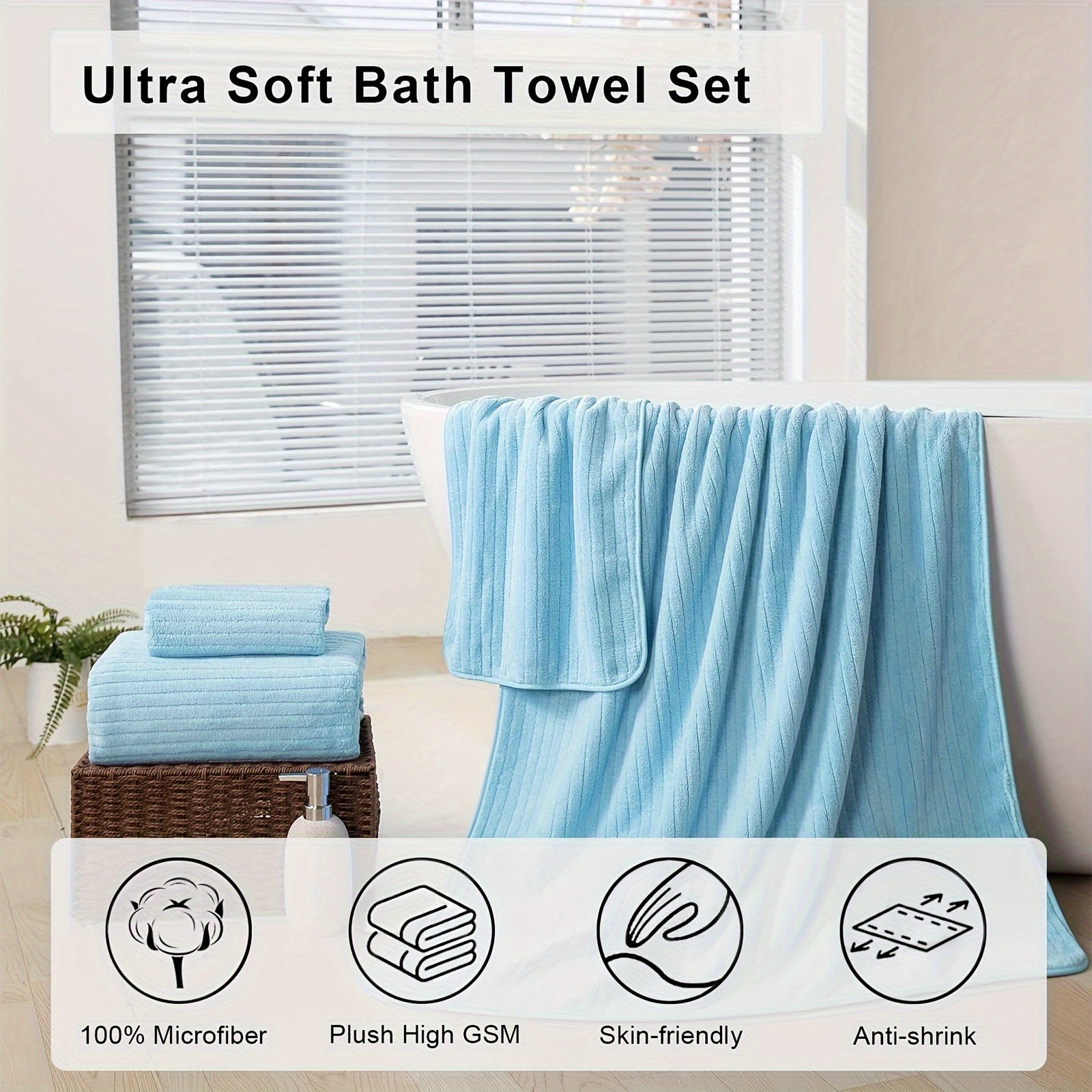 Mikrofiber sochiq to'plami 2 ta hammom varaqasi va 6 ta hammom sochiqdan iborat, kulrang, pushti va ko'k chiziqlar bilan. Tez quriydigan va yuqori darajada namni so'radigan, dush, plyaj, spa va sport zalida foydalanish uchun.