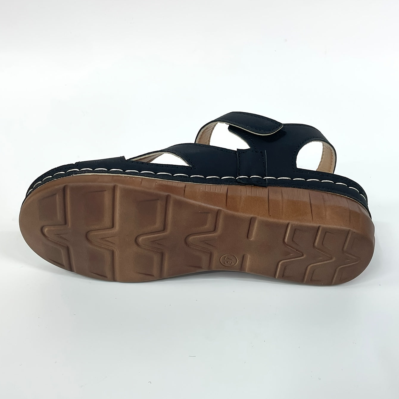Minimalist qora wedge sandallar, ochiq barmoq T-strap dizayni va qopqoq bilan. Havo o'tkazuvchan PU yuqori qismi va ichki qismi, tasodifiy plyaj kiyimlari uchun mukammal rangli o'rta balandlikdagi wedge.