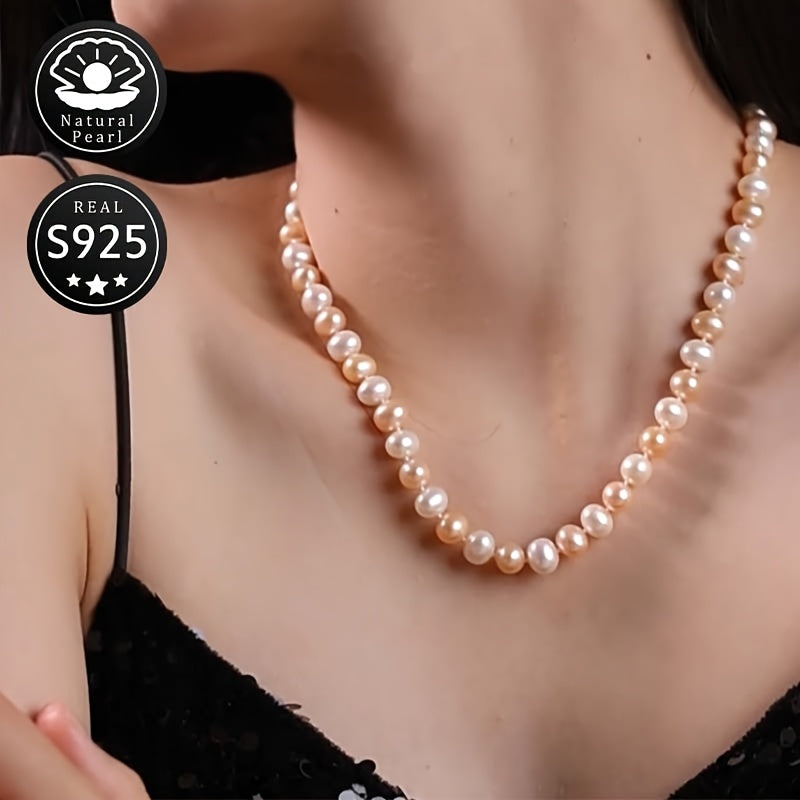 MUFAN Vintage Sexy Style Tabiiy Shirin Suv Marvarid Zanjiri - S925 Kumush, 8-9mm, Iyul Tug'ilgan Kuni To'pi - Sovg'a Qutisi Kiritilgan - Kundalik Kiymak va Sovg'a Berish Uchun Ideal - Ayollar Uchun Har Mavsumli Zargarlik
