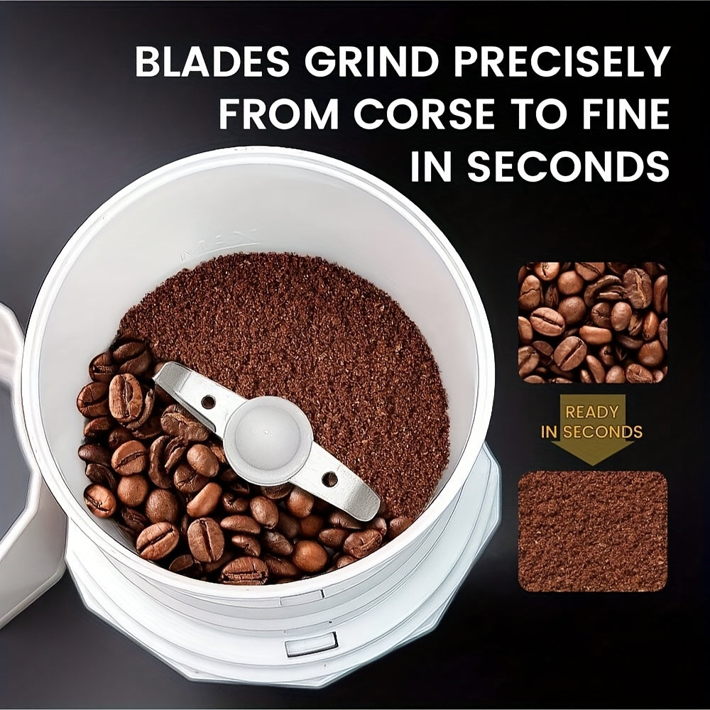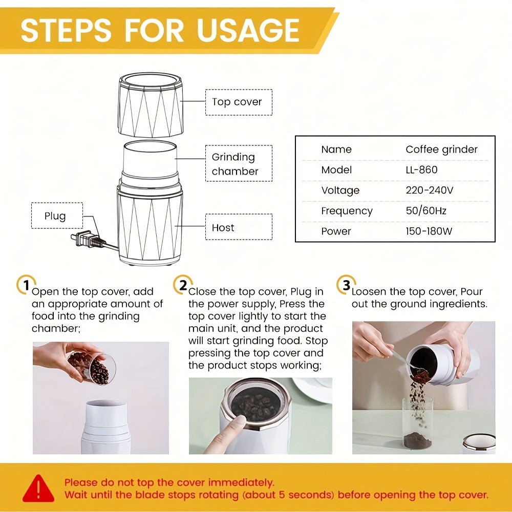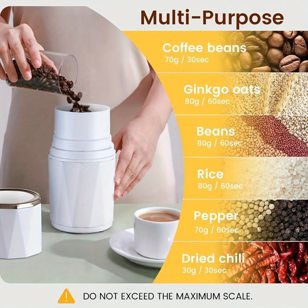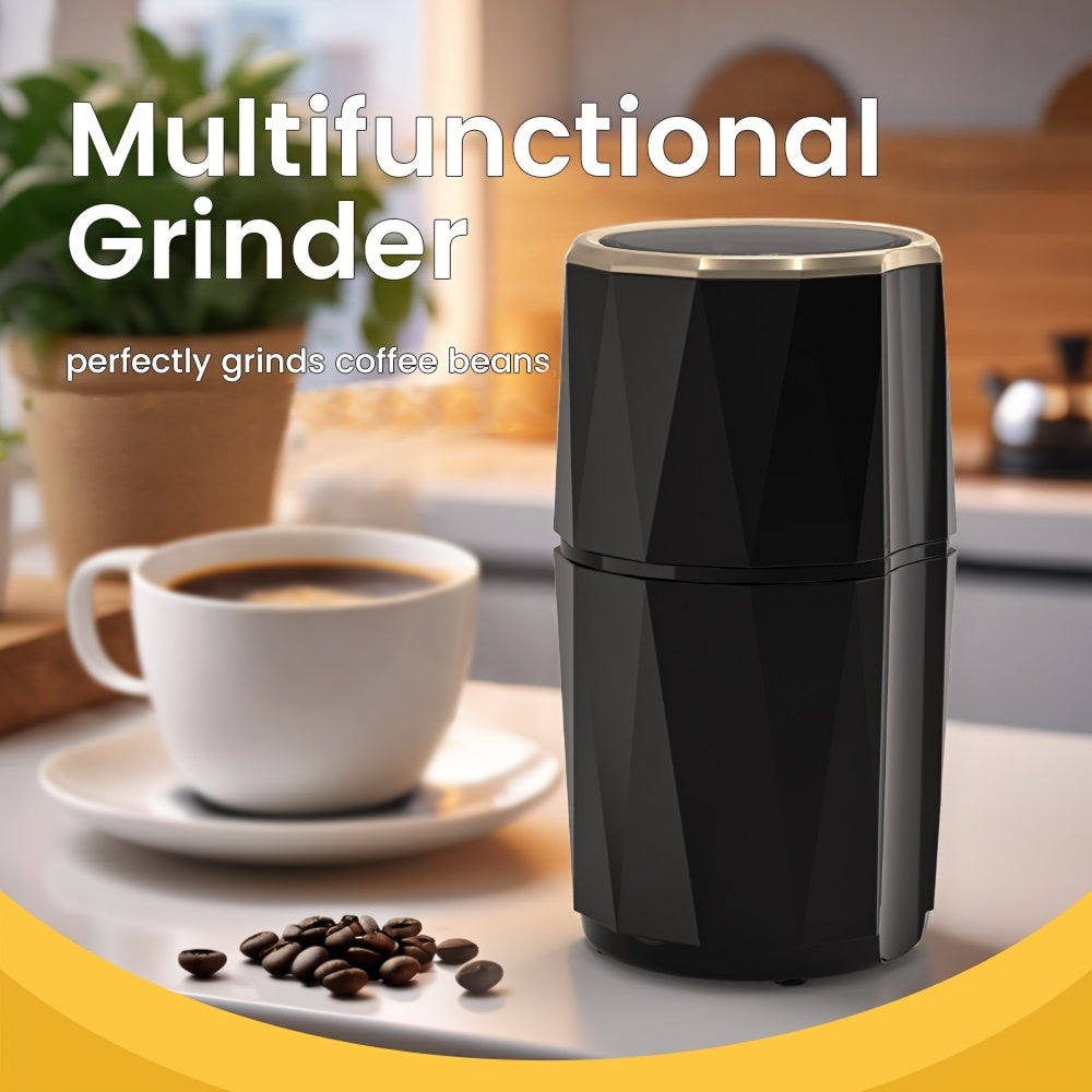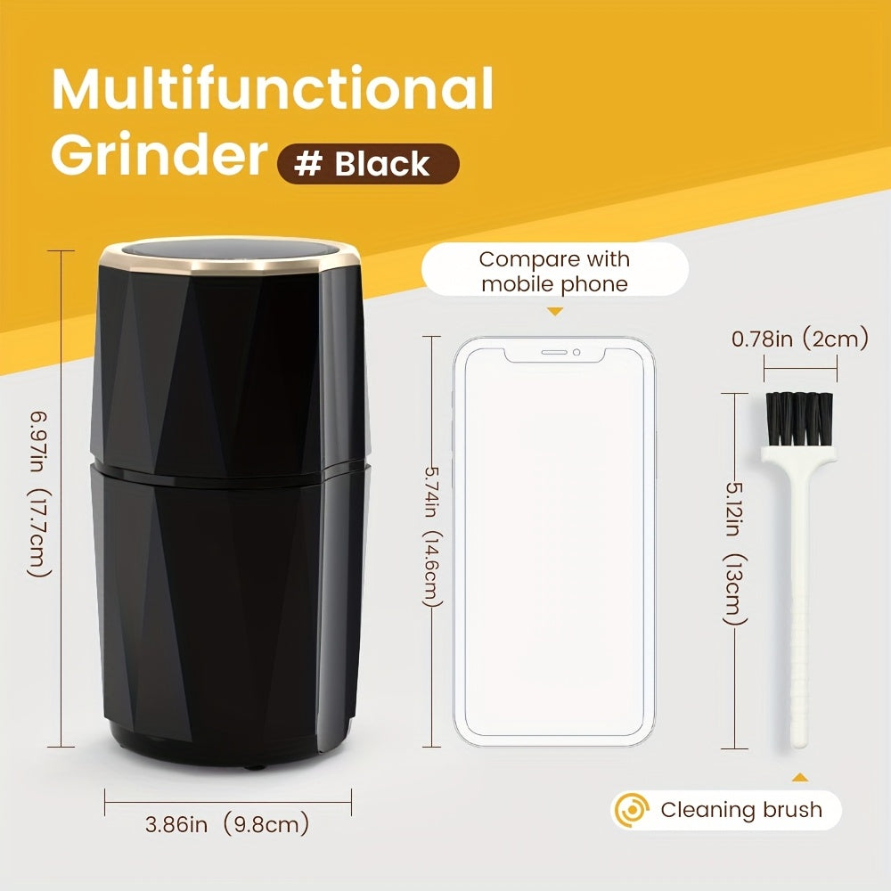 Kofe donalari, ziravorlar, yong‘oqlar va chili qalampirlari uchun ko‘p funksiyali elektr maydalagich, zanglamaydigan po‘latdan yasalgan pichoq bilan. Zamonaviy qora dizaynda oson bir bosish bilan ishlash.