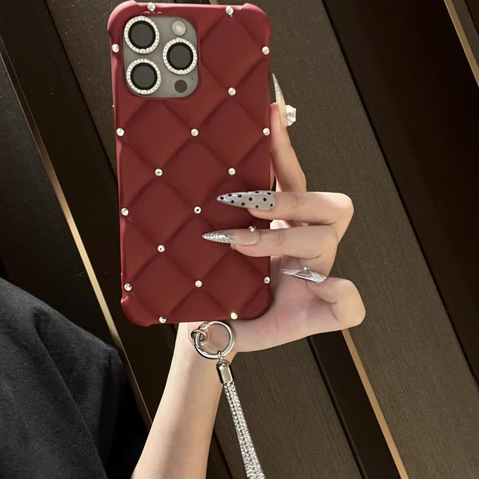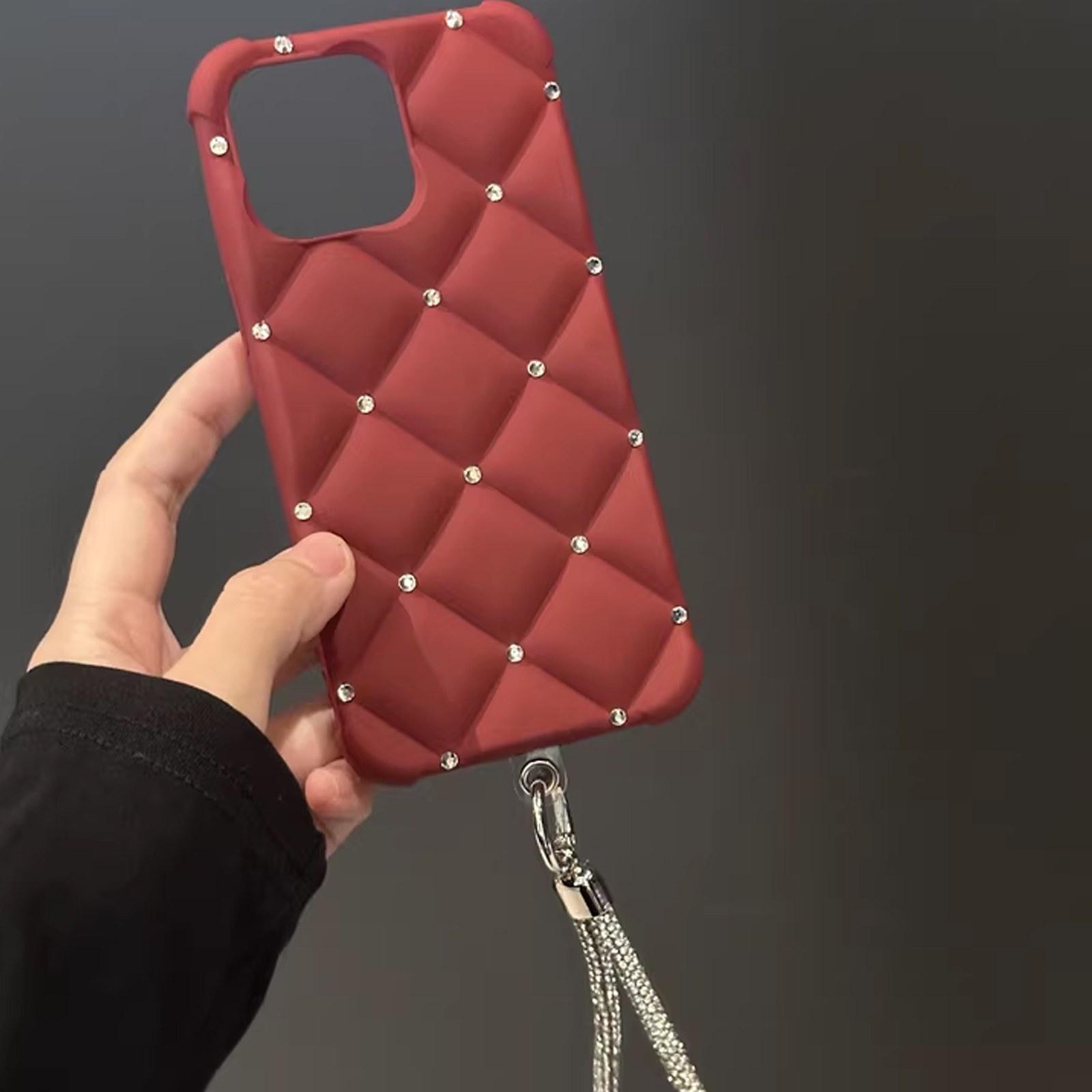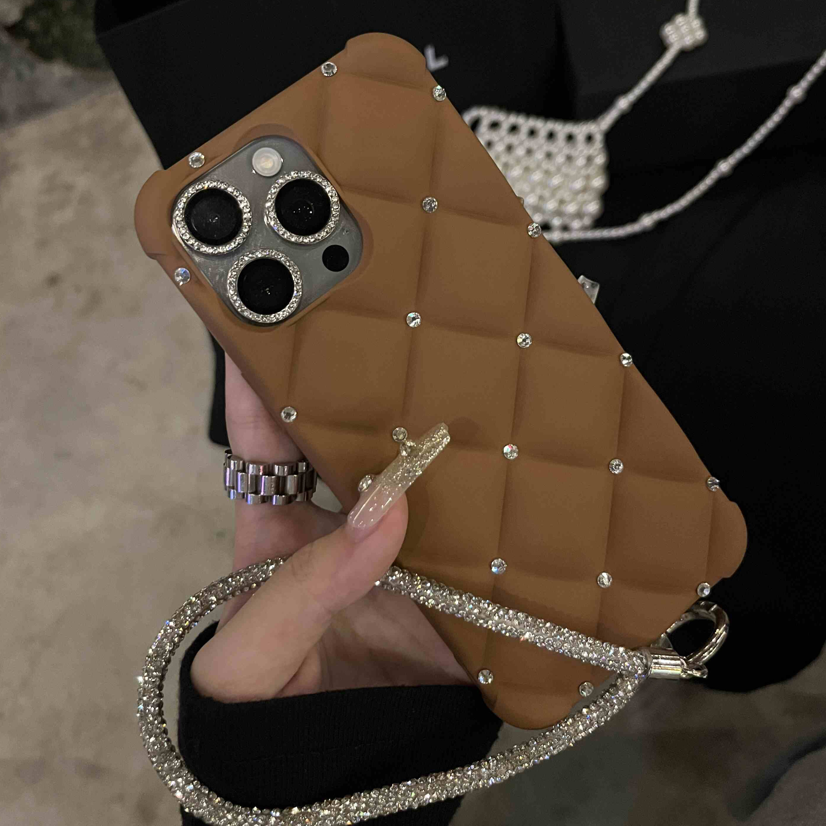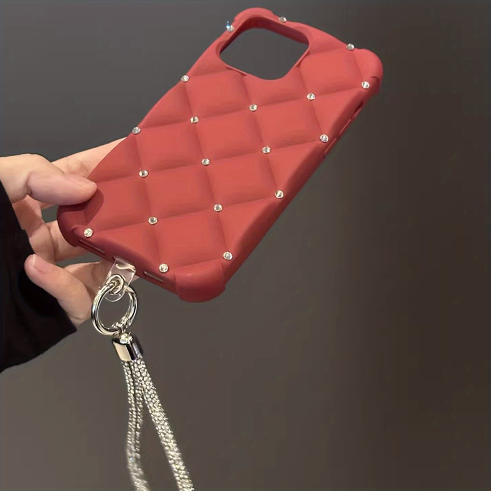 Yangi zamonaviy teriga o'xshash ayollar uslubidagi telefon qopqog'i, yuqori sifatli rhinestone tafsilotlari bilan, Apple iPhone'lar uchun mos keladi. To'liq rhinestone bilaguzuk va to'rt burchakli tushishdan himoya dizayni mavjud. Mukammal sifatida