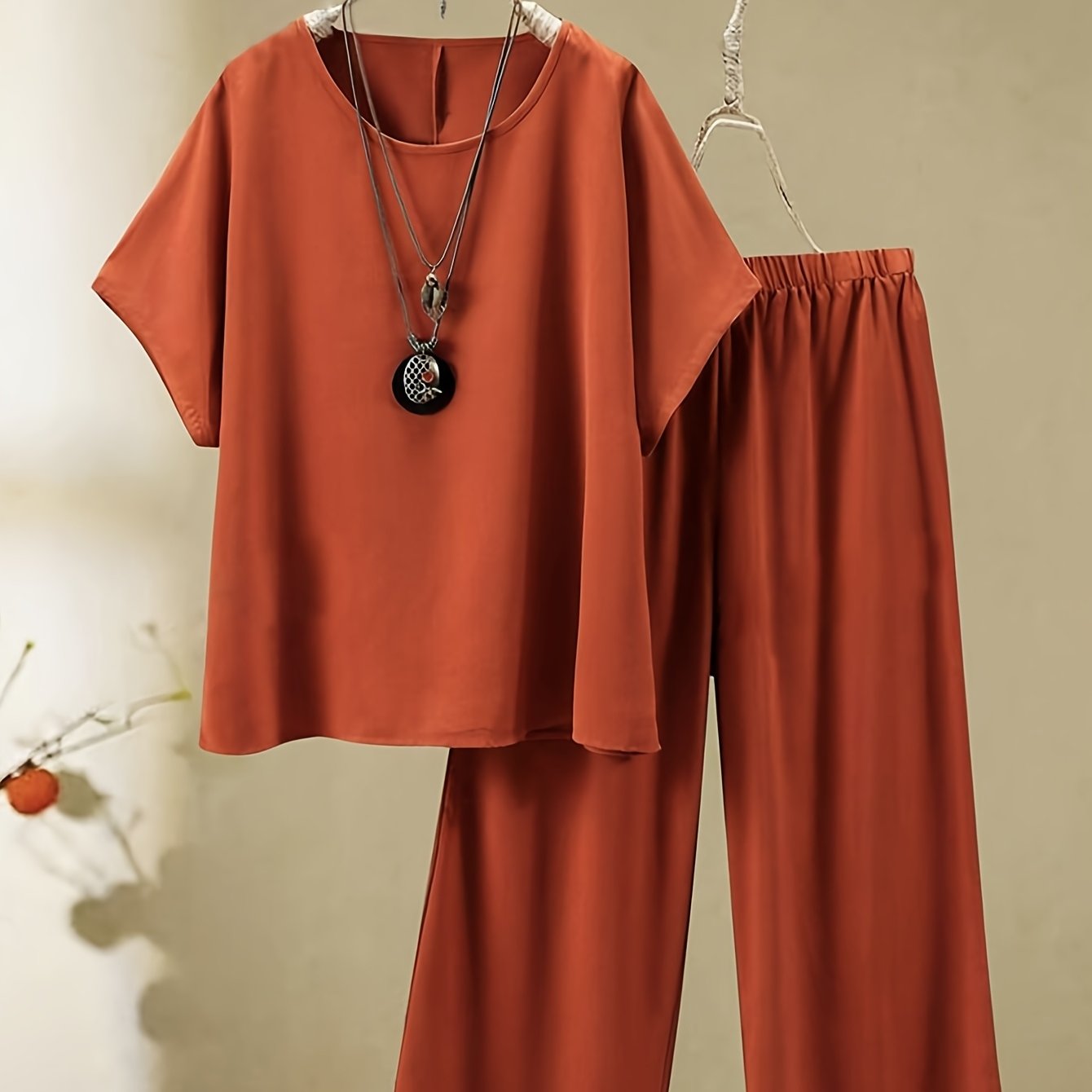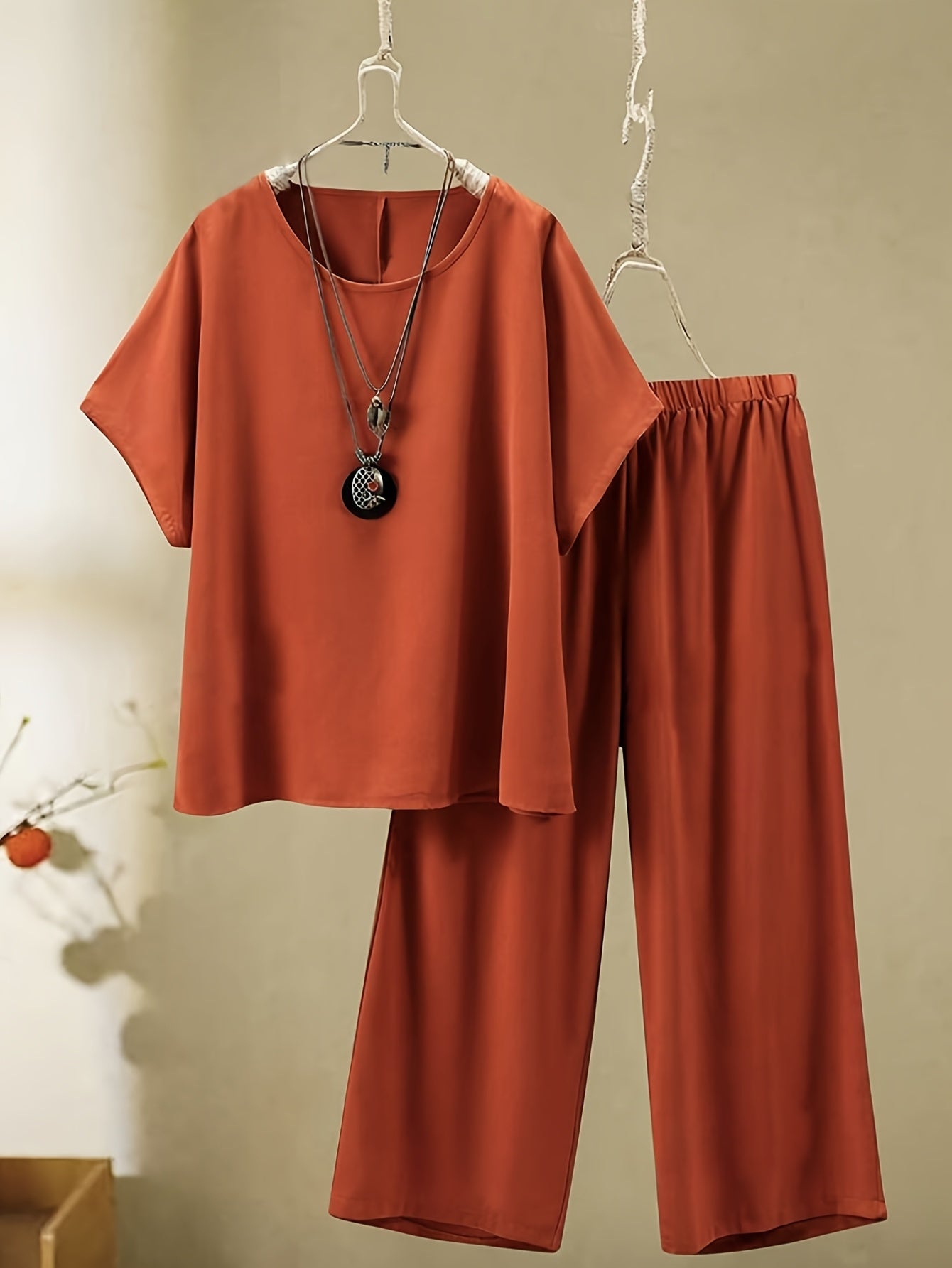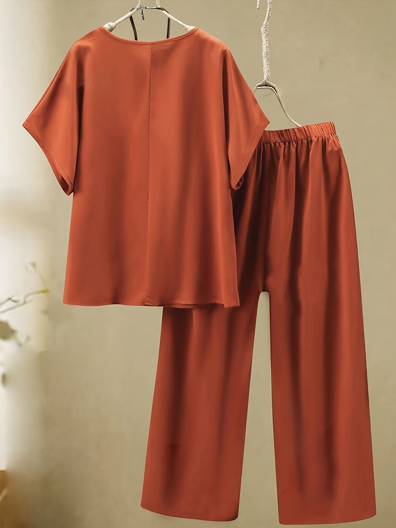 Yangi plussayz ta'til to'plami yumaloq bo'yinli, qisqa yengli bluzka va yumshoq, mustahkam matodan tayyorlangan uzun shimlarni o'z ichiga oladi, ayollar uchun mukammal.
