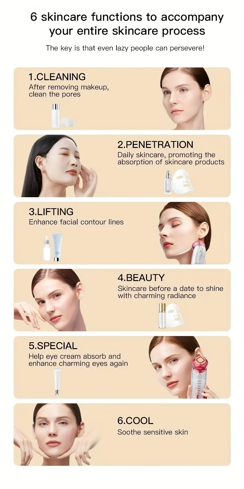 Yangi mahsulot taqdimoti: yangi texnologiyadan foydalangan holda samarali teri parvarishi uchun 6 ta ish rejimiga ega ko'p funksiyali uy go'zallik qurilmasi.