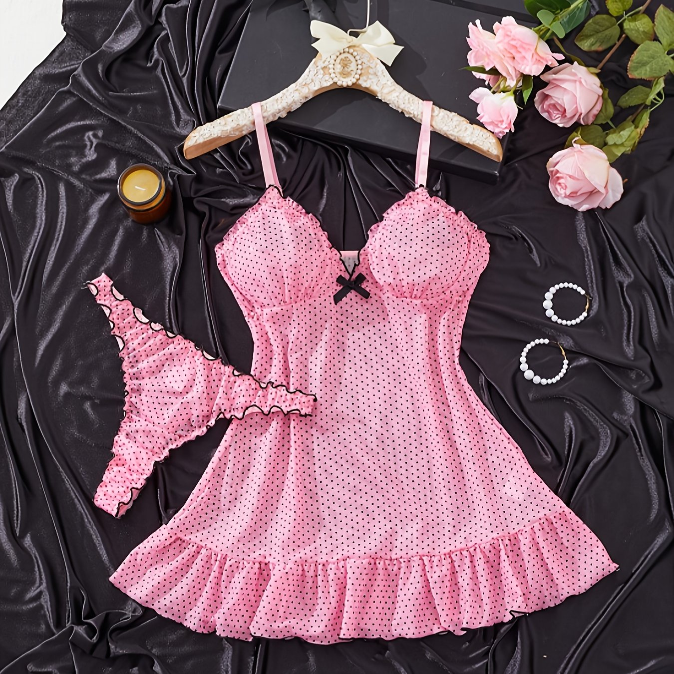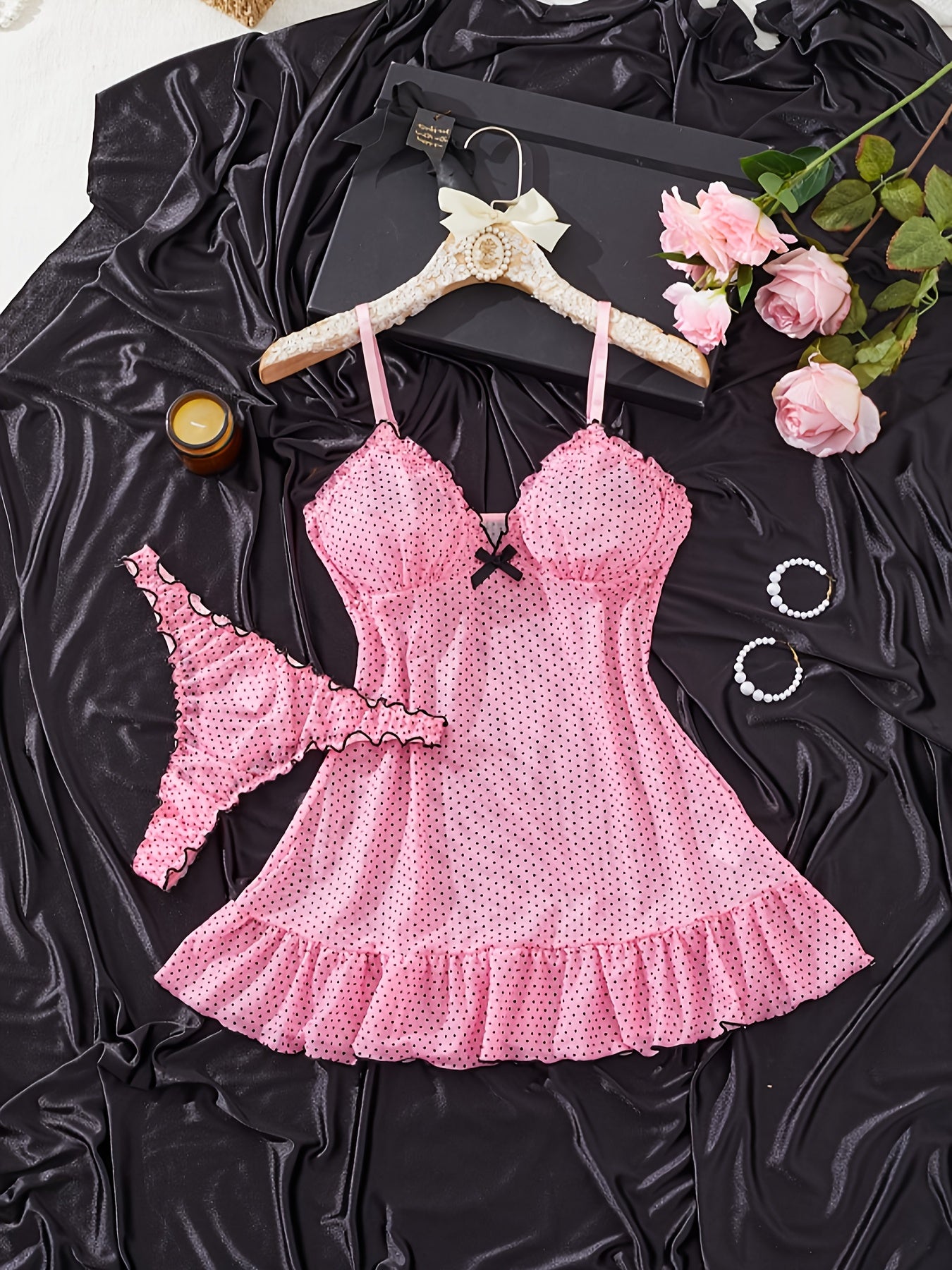 Yangi jozibali ko'rinadigan nuqta kamonli suspender yubka, uchburchak ichki kiyim, pijama va uyqu yubkasi to'plami.