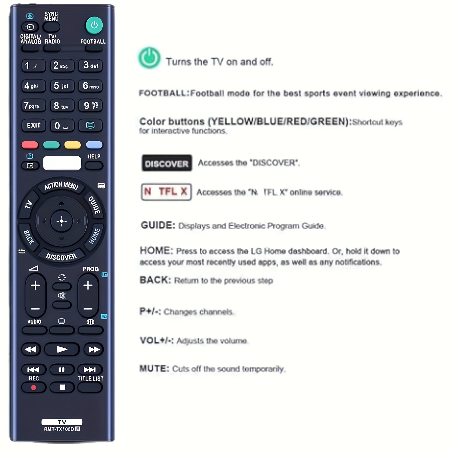 NOVAGLORY RMT-TX100D Sony Bravia Smart TV modellari uchun almashtirish masofadan boshqarish pulti. Simsiz va batareyalar bilan ishlaydi, batareyalar kiritilmagan.