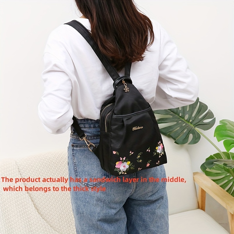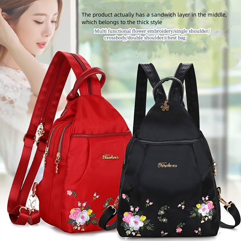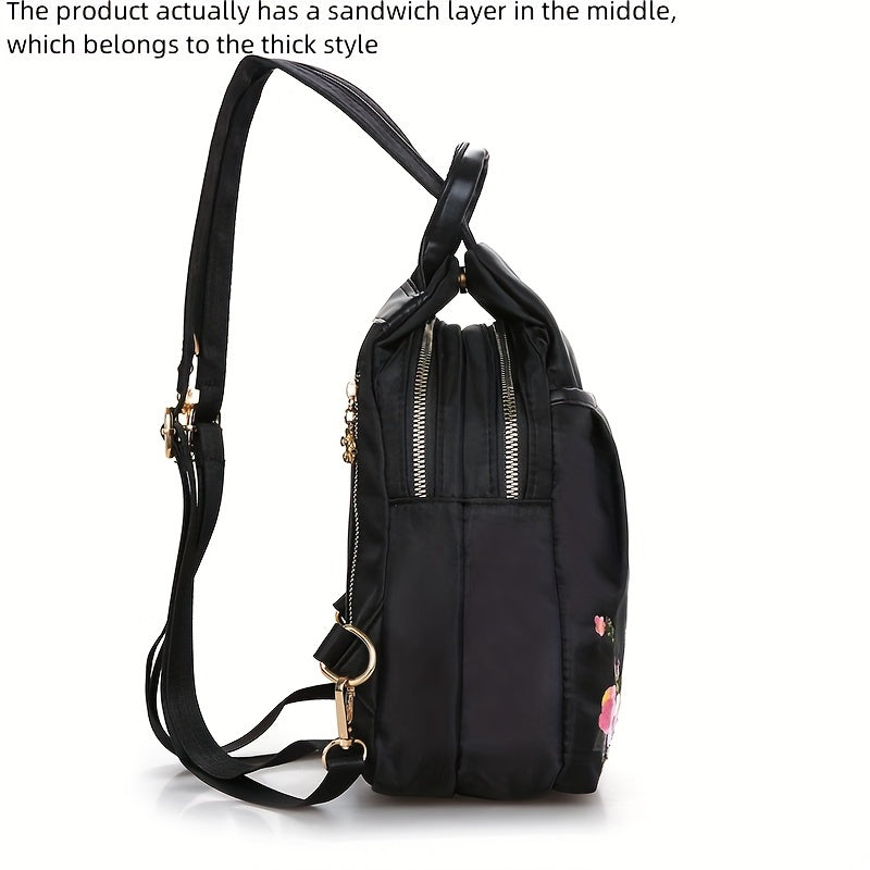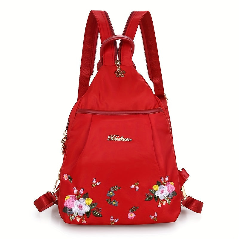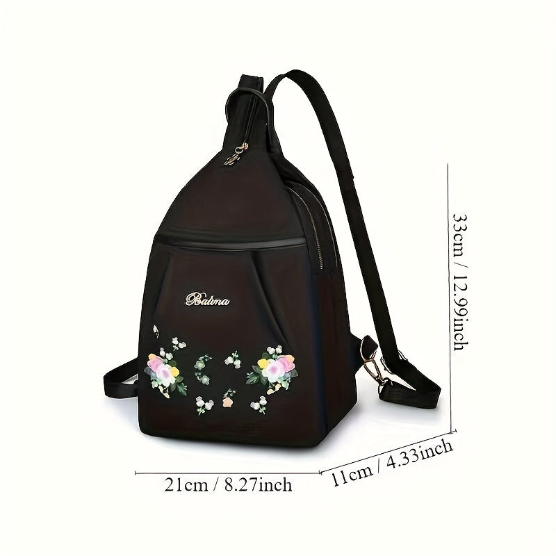 Nylon ayollar uchun ruksak, gullar bilan tikilgan, sozlanadigan kamarlar, qulaylik uchun qalin g'ovak qatlam, va zip yopilishi. Sayohat, ta'til, telefon, kalitlar va hamyon saqlash uchun ideal. Mavjud bo'lgan