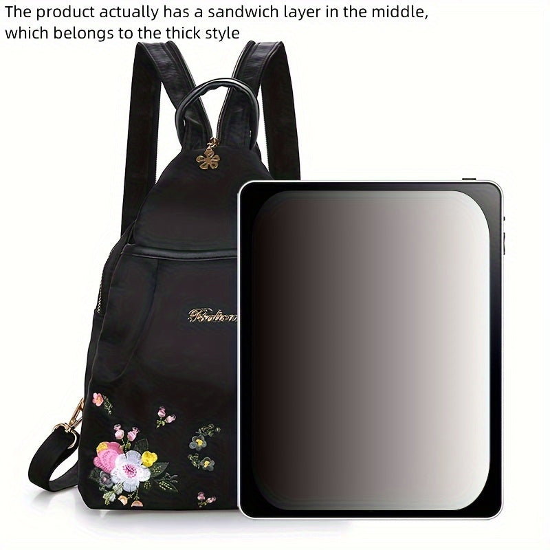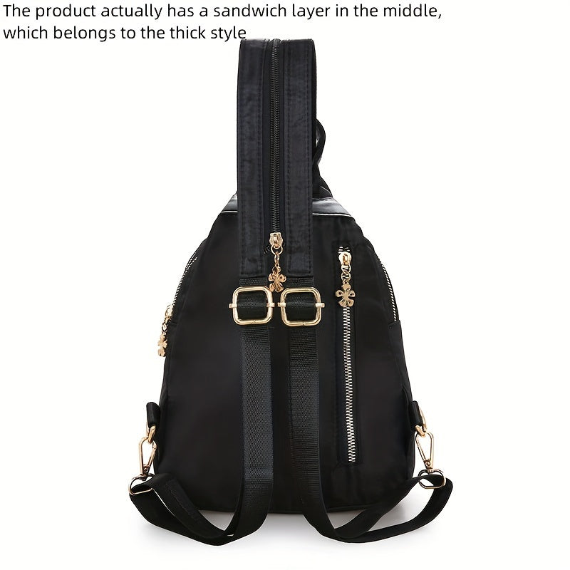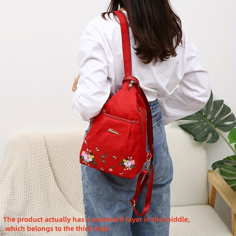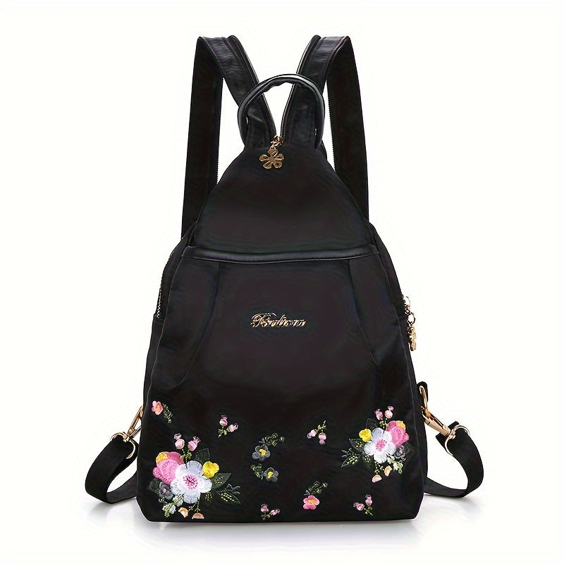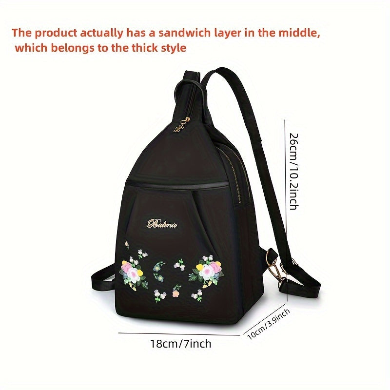 Nylon ayollar uchun ruksak, gullar bilan tikilgan, sozlanadigan kamarlar, qulaylik uchun qalin g'ovak qatlam, va zip yopilishi. Sayohat, ta'til, telefon, kalitlar va hamyon saqlash uchun ideal. Mavjud bo'lgan