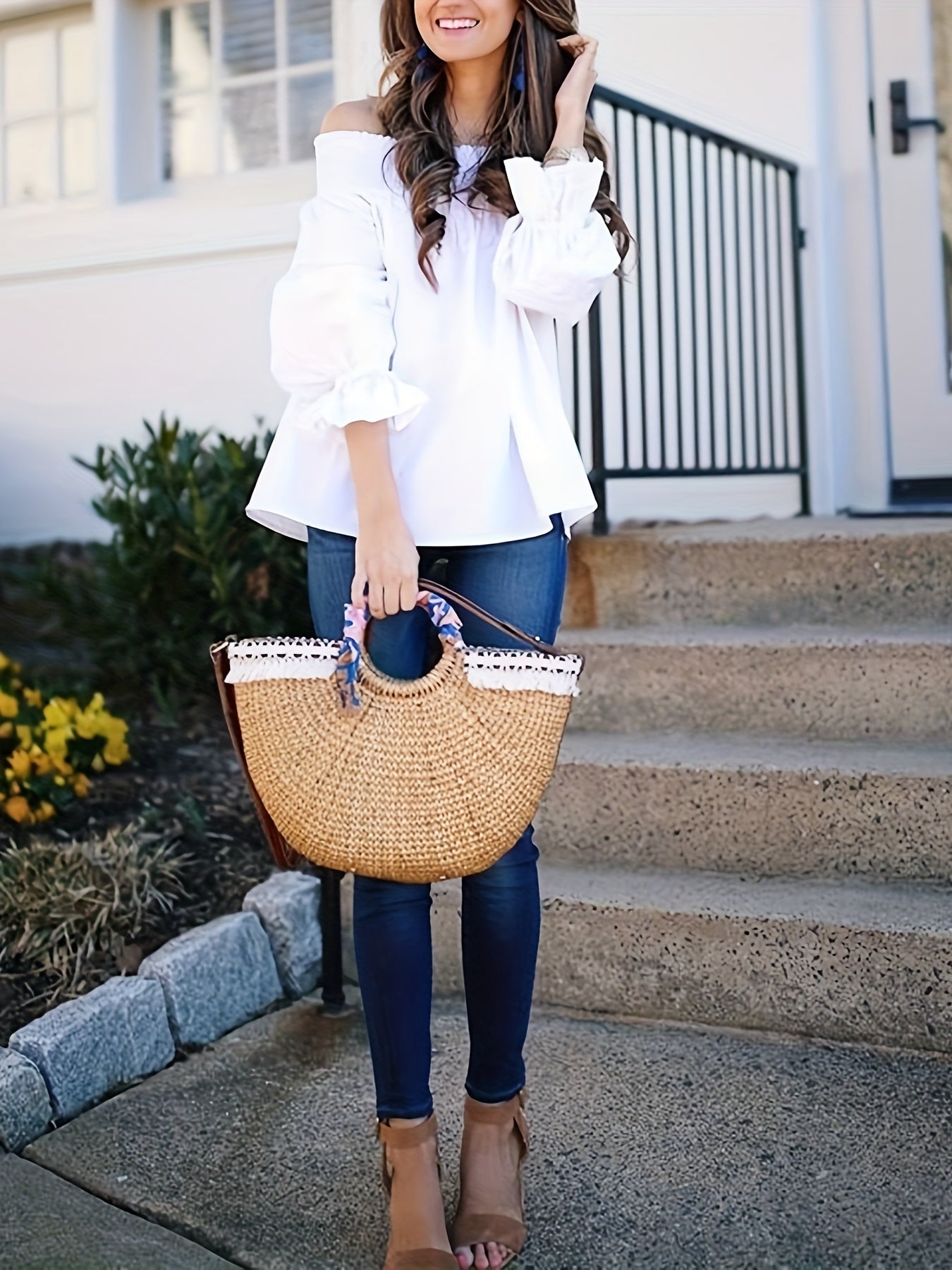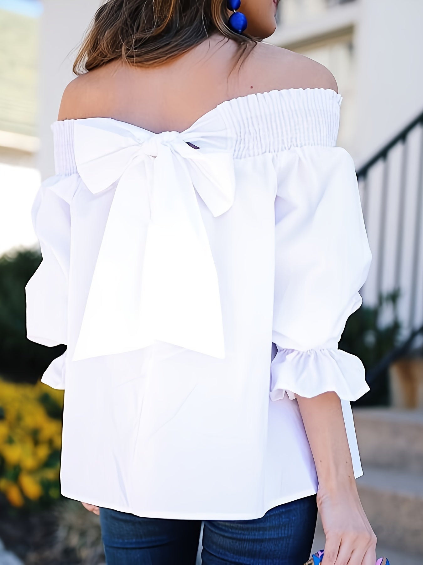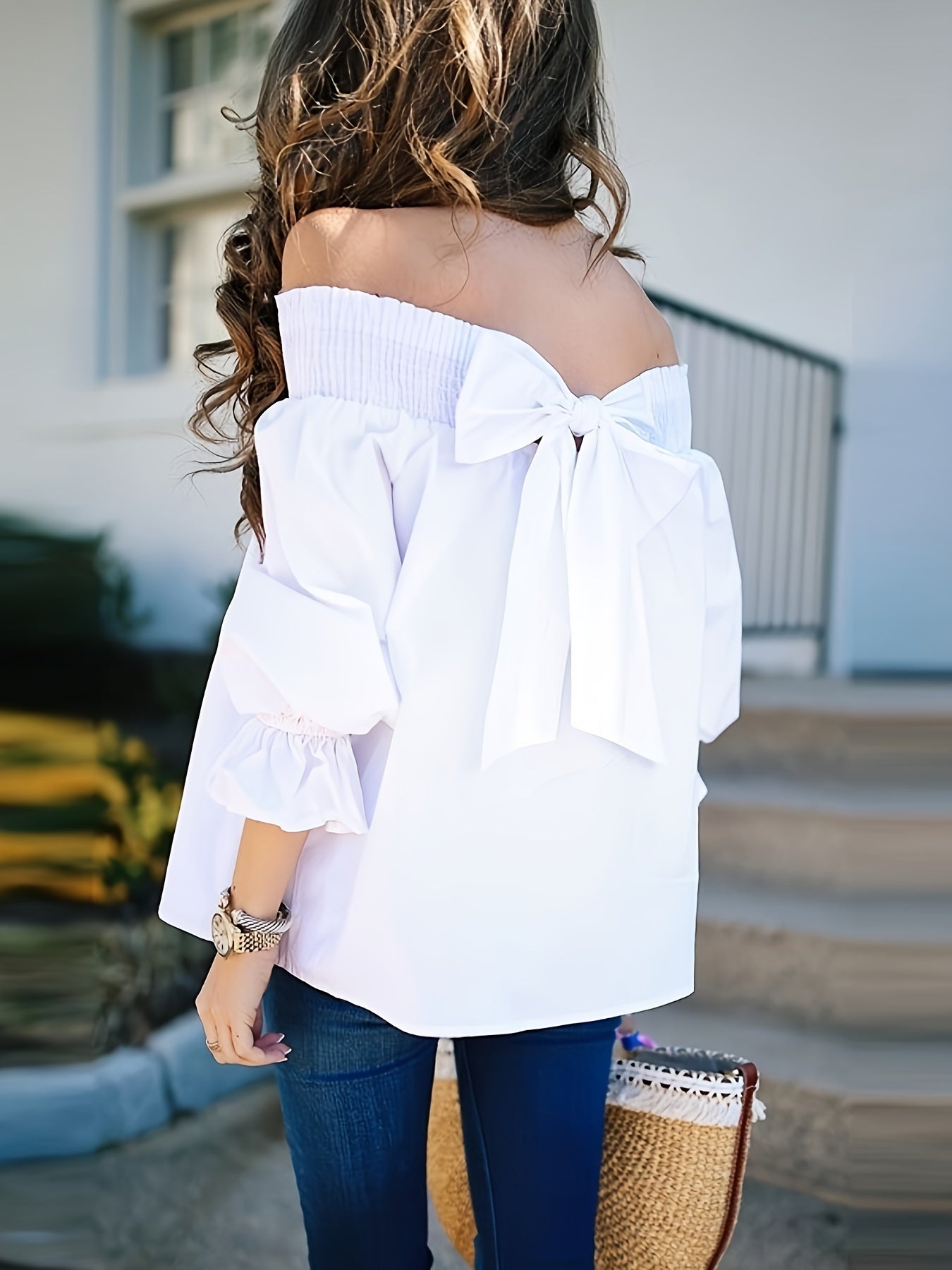 Yelka ochiq bluzka, bog'ichli orqa qismi, to'rtburchakli yarmi yenglar, bahor va yoz uchun mukammal, katta o'lchamdagi ayollar kiyimlari.