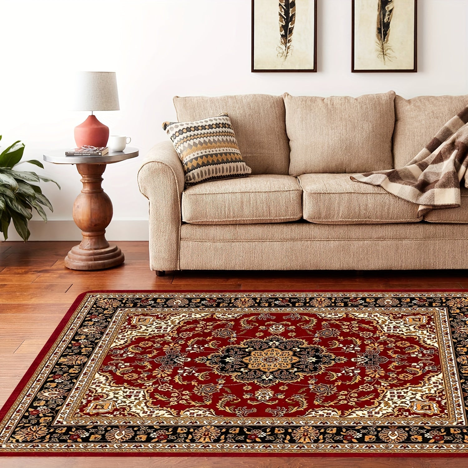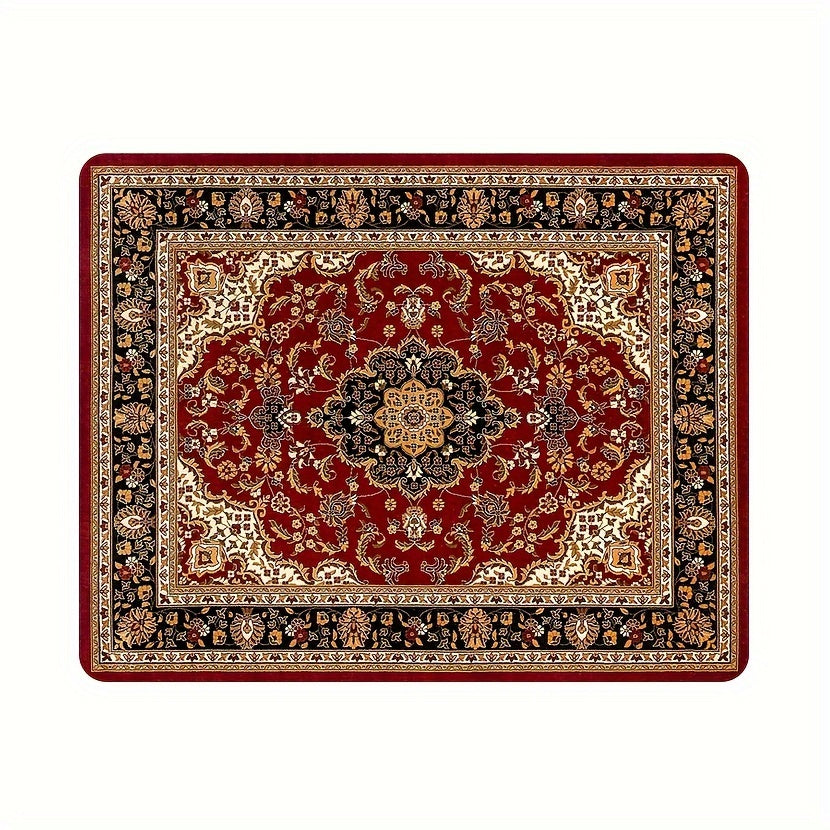 Bir dona qizil vintage naqshli yumshoq flanel non-slip pol matozi oshxona va hammom uchun. Kvadrat shaklida, 480g vaznida va 1 sm qalinlikda.