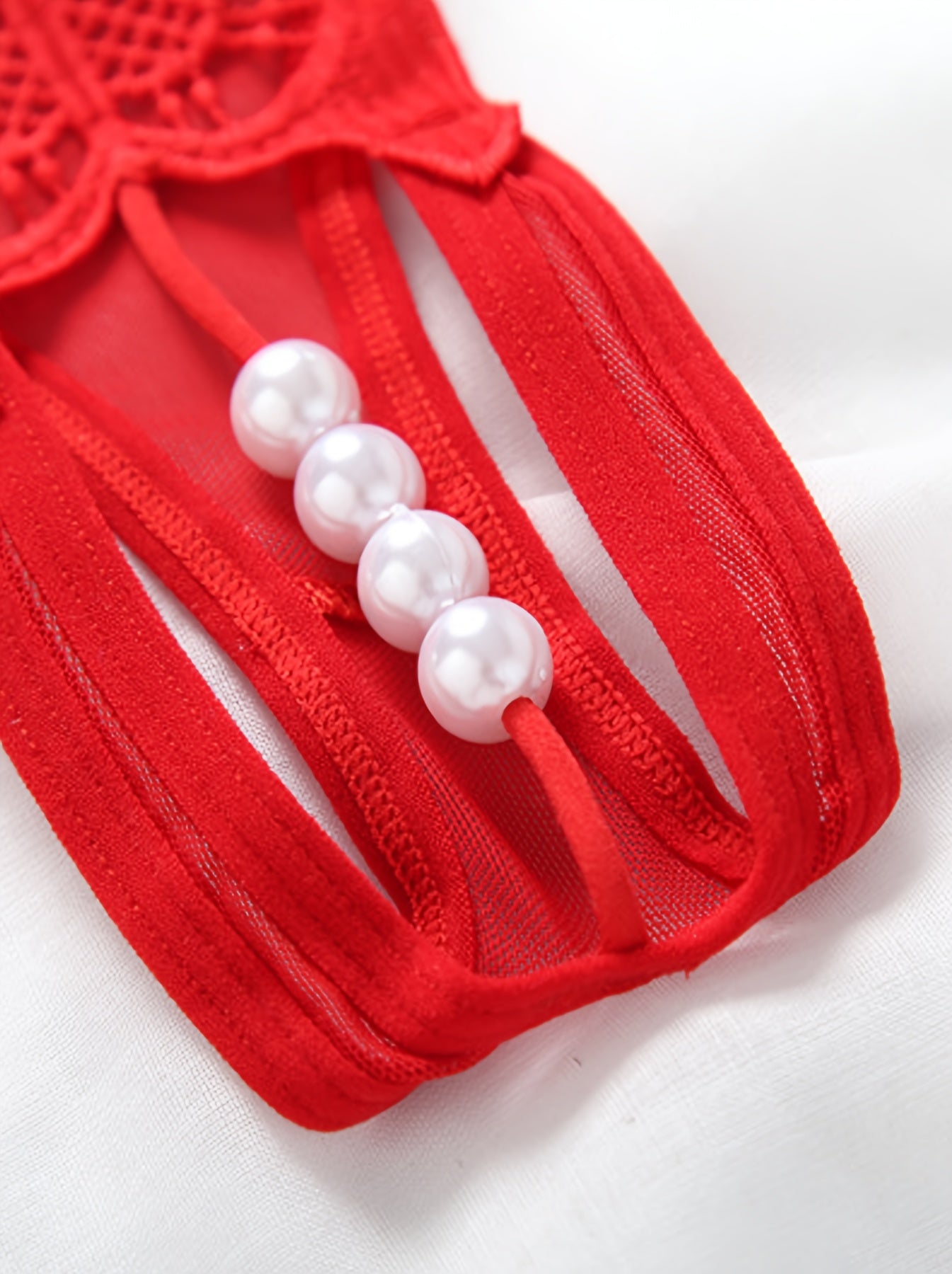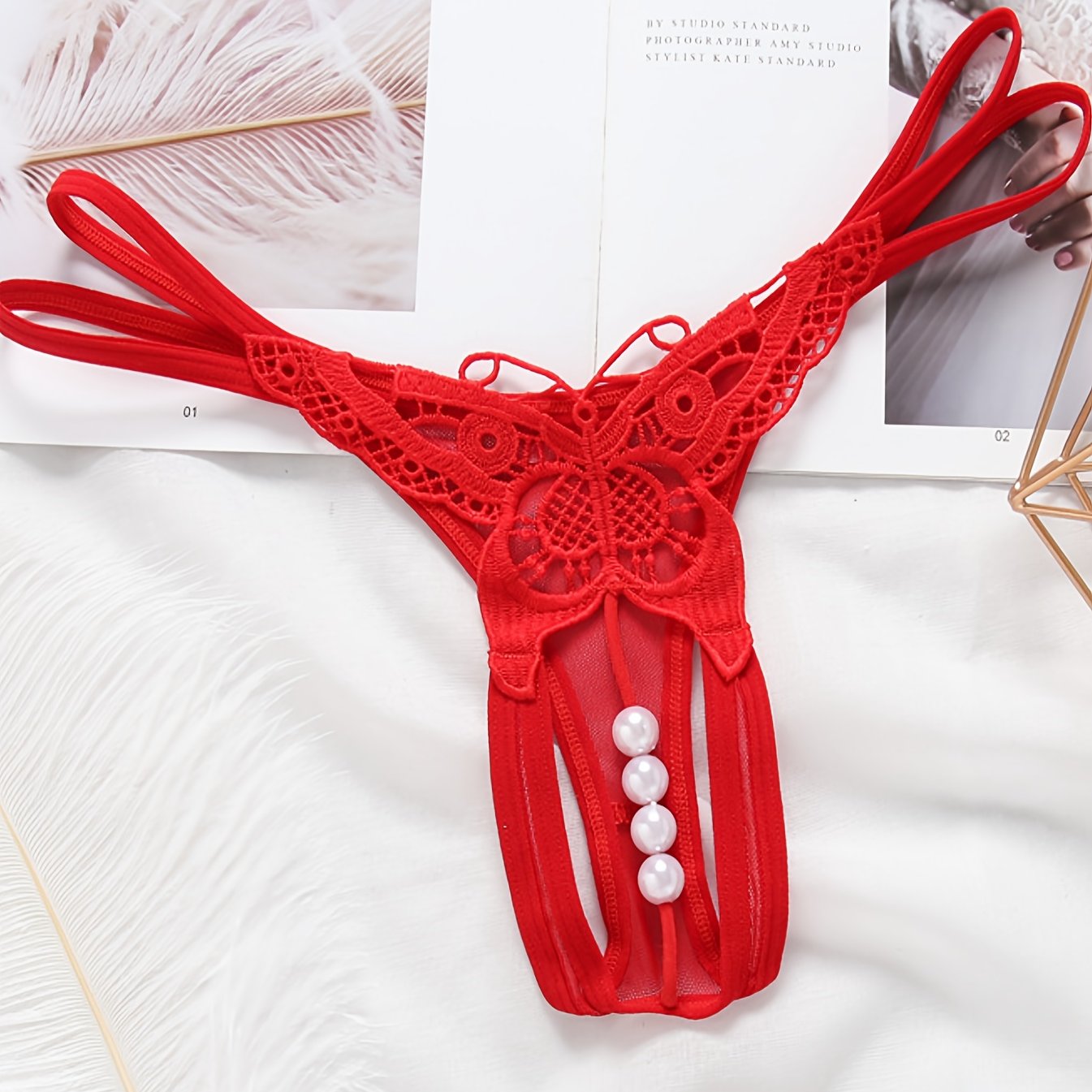 Bir sexy tikilgan shaffof thong, marvaridlar bilan, hayvon naqshidagi beadlar va nafas oladigan polyester to'qima mato bilan.