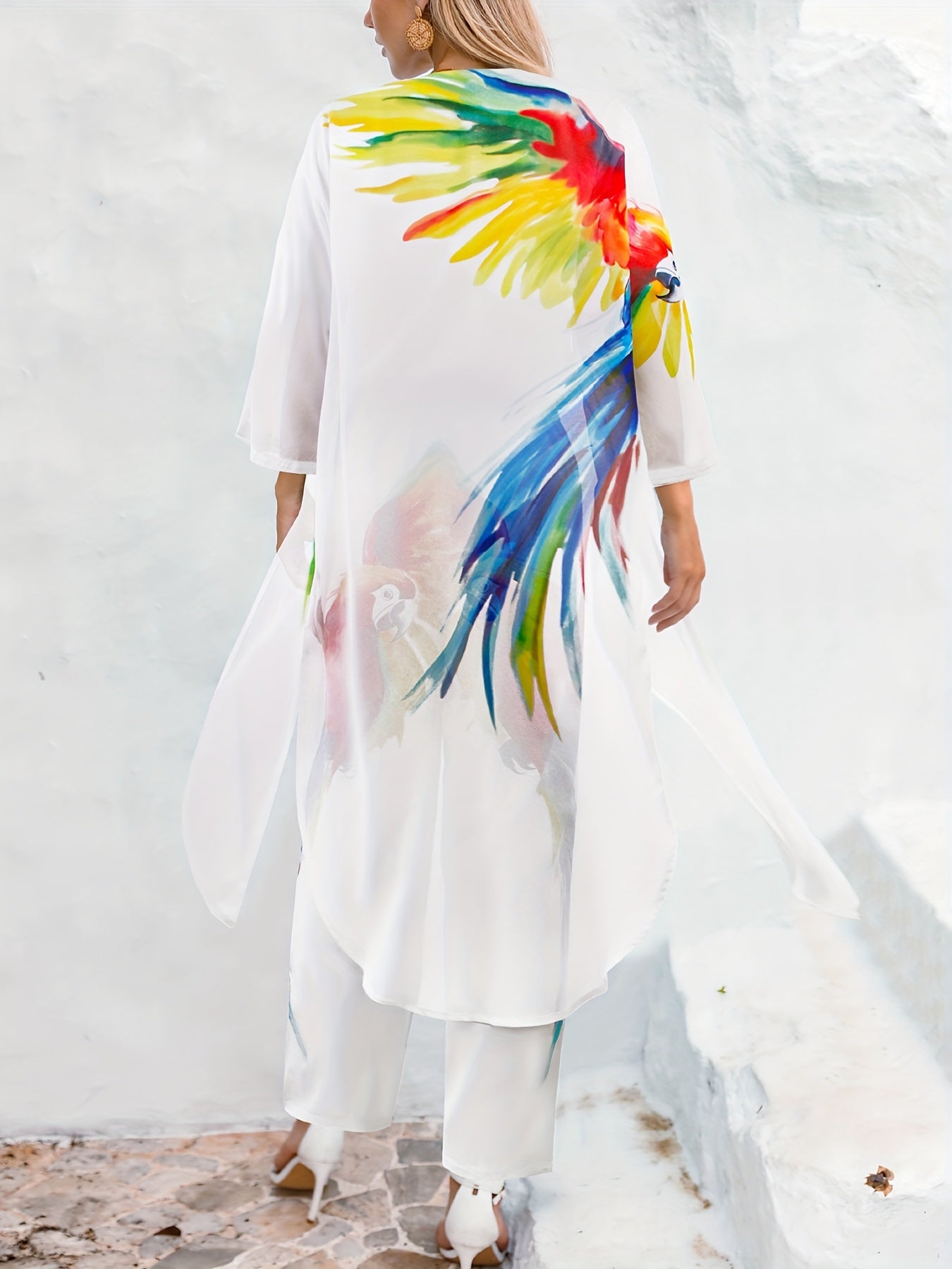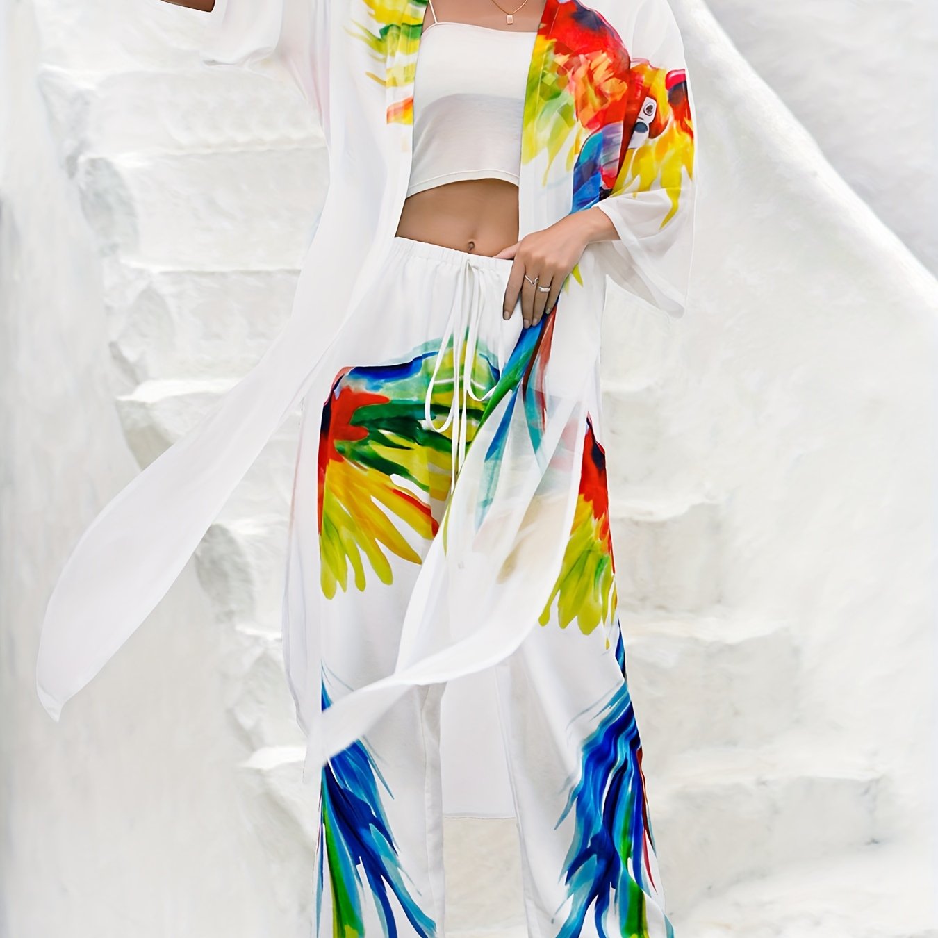 "Parrot Print Vacay 2 qismli ayollar uchun suzish kiyimlari, uzun yengli kimono va keng kesimli qoplama shimni o'z ichiga oladi."
