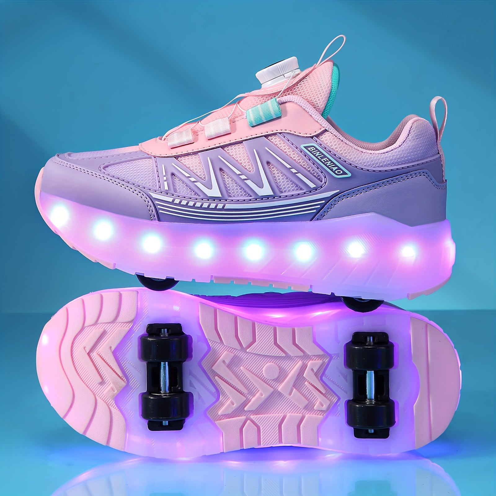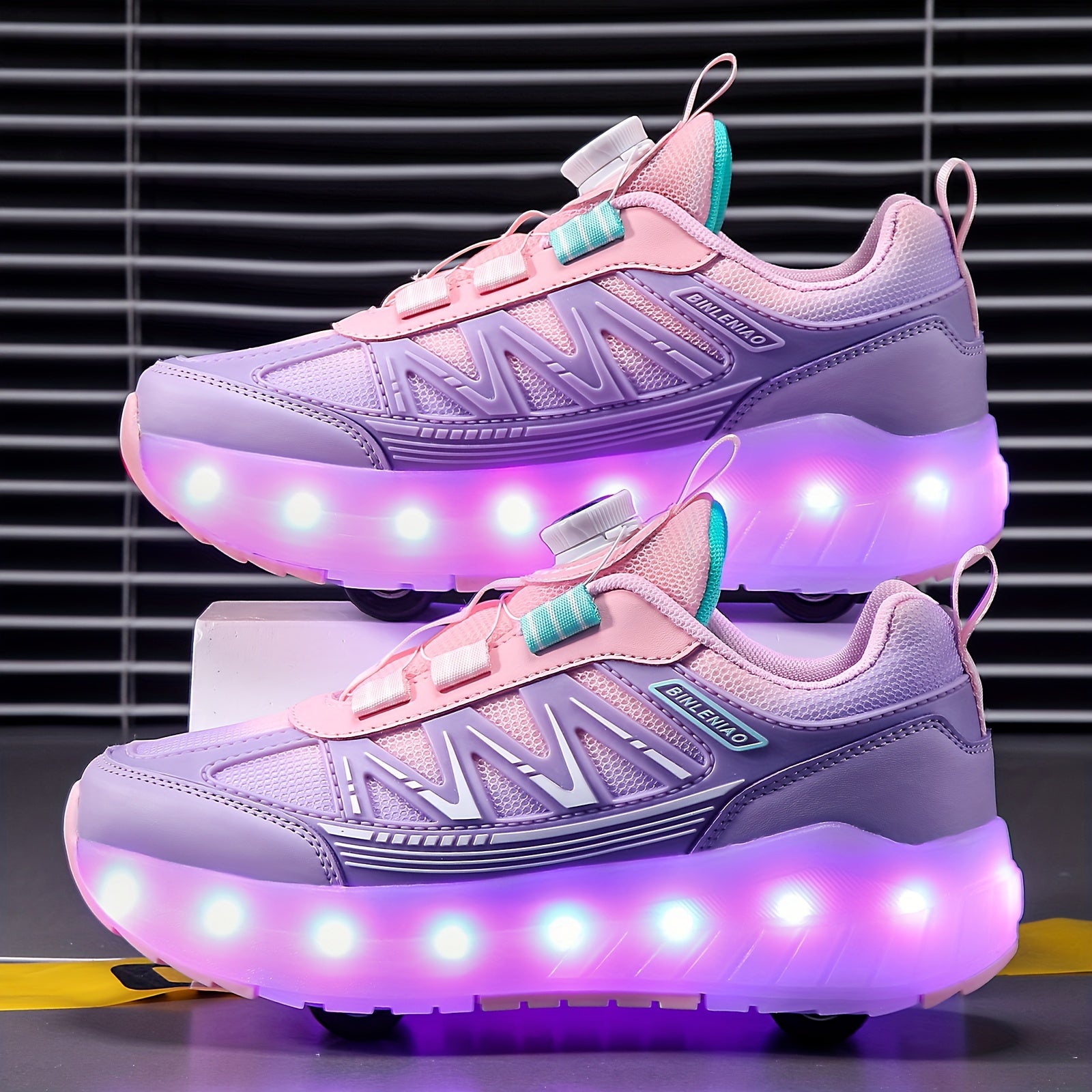 Qizlar uchun 8 g'ildirakli va 16 ta yoritish rejimiga ega pushti va binafsha LED yoritilgan skeytbord poyafzallari. Havo o'tkazuvchi va engil, mato astar, EVA taglik va aylanuvchi tugma bilan. Mos keladi