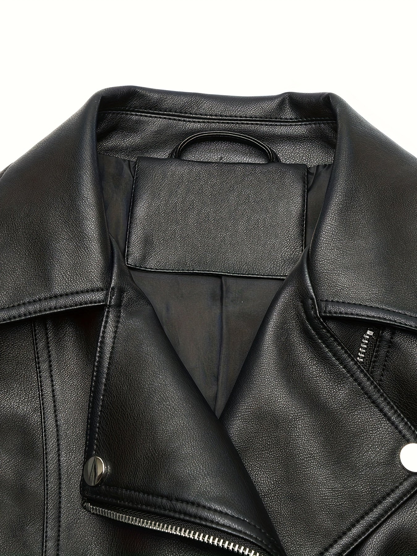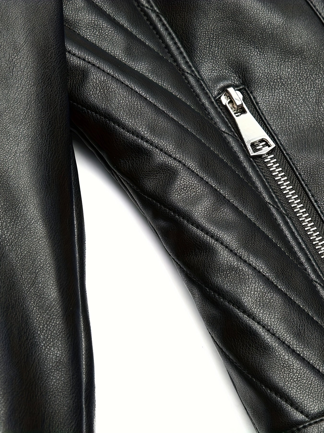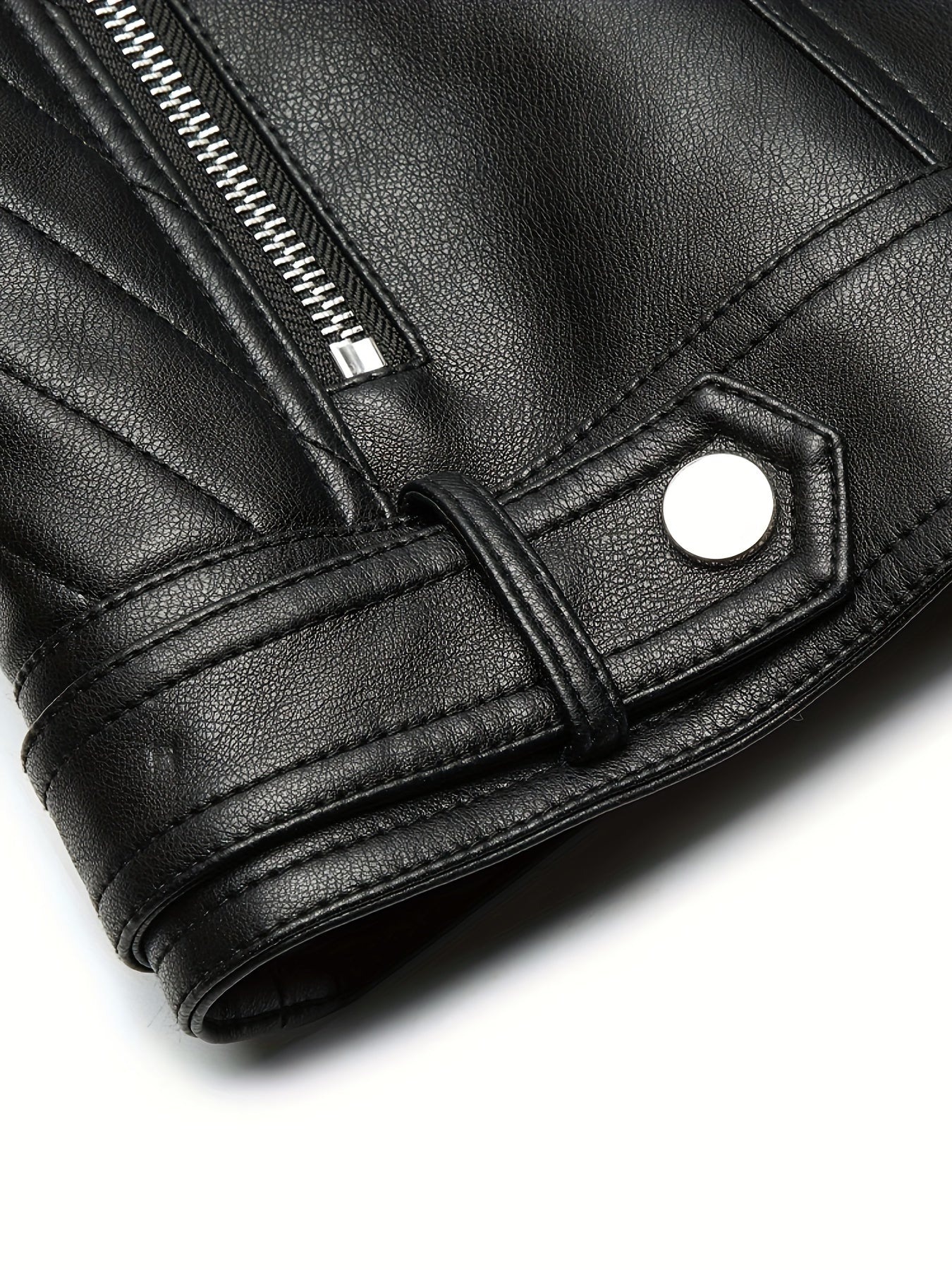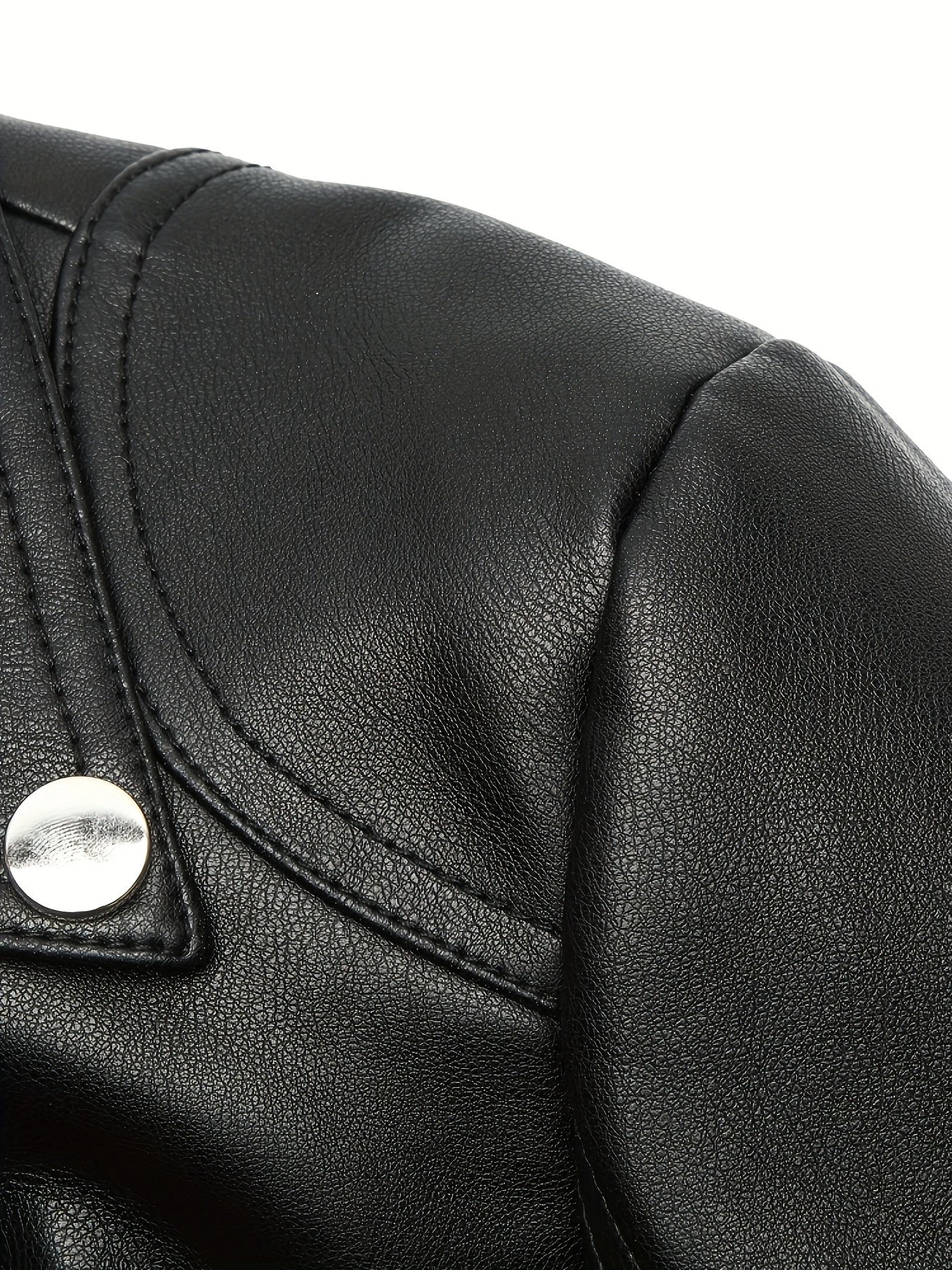 Katta o'lchamdagi qora PU charm moto kurtka, uzun yenglar, zip-up old qismi va tugmachali bilaklar bilan, ko'p qirrali kuz/qish uslubi uchun.