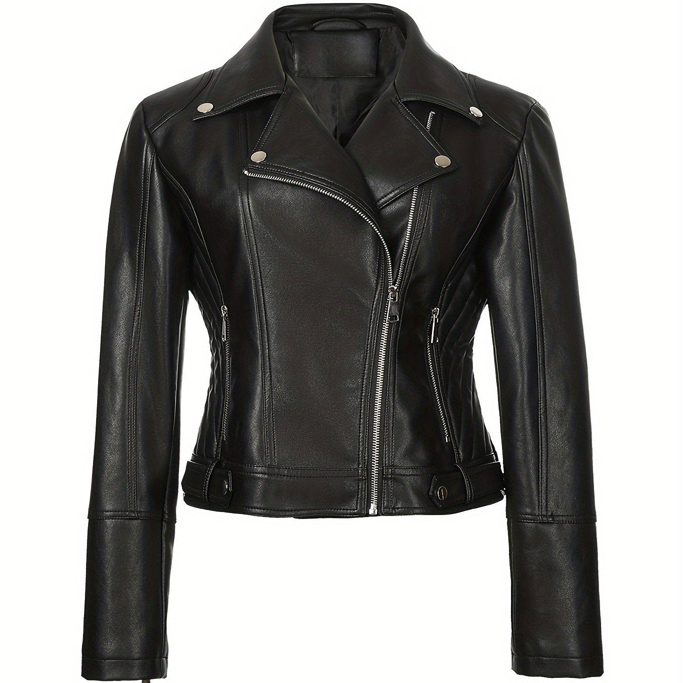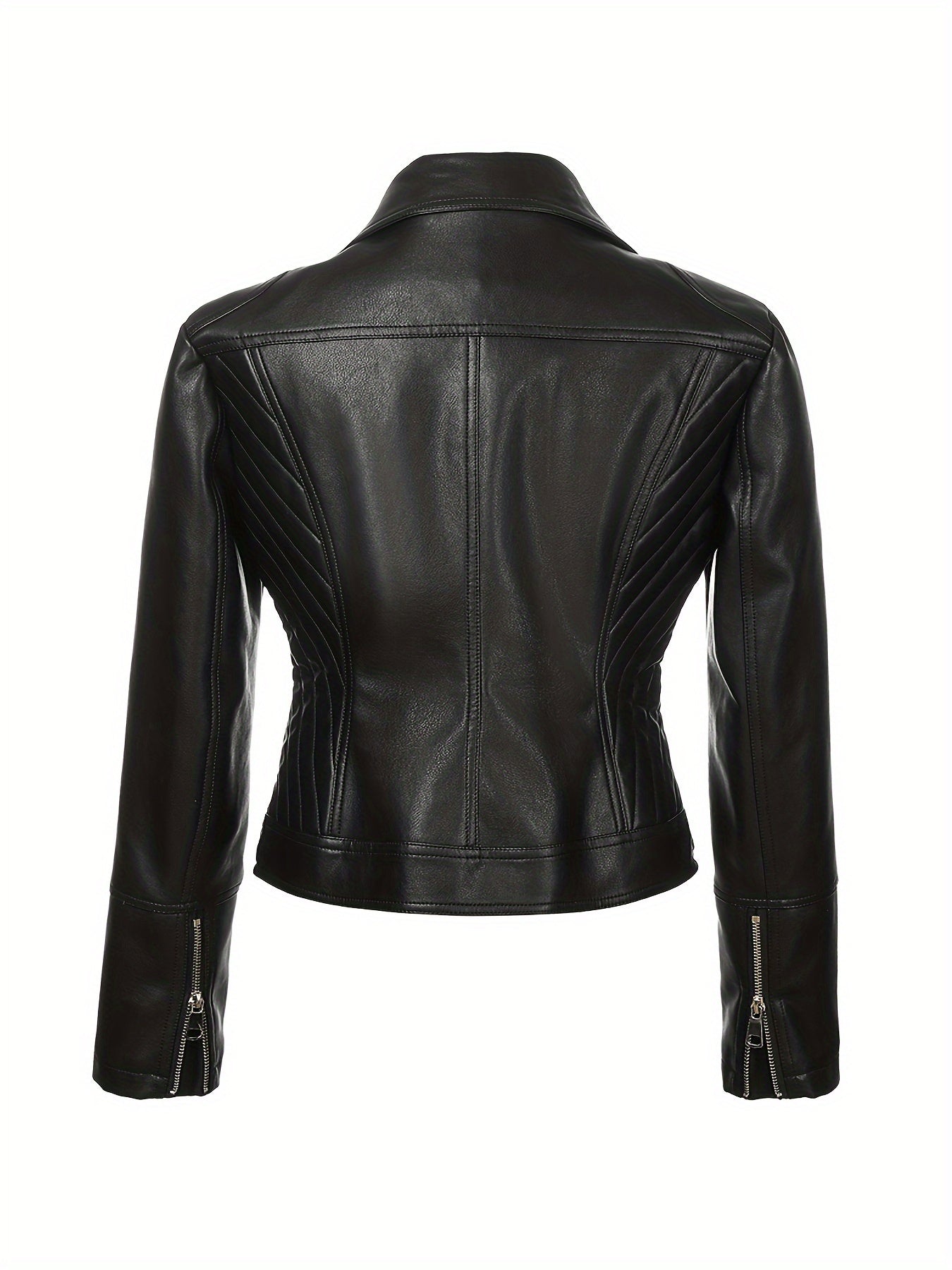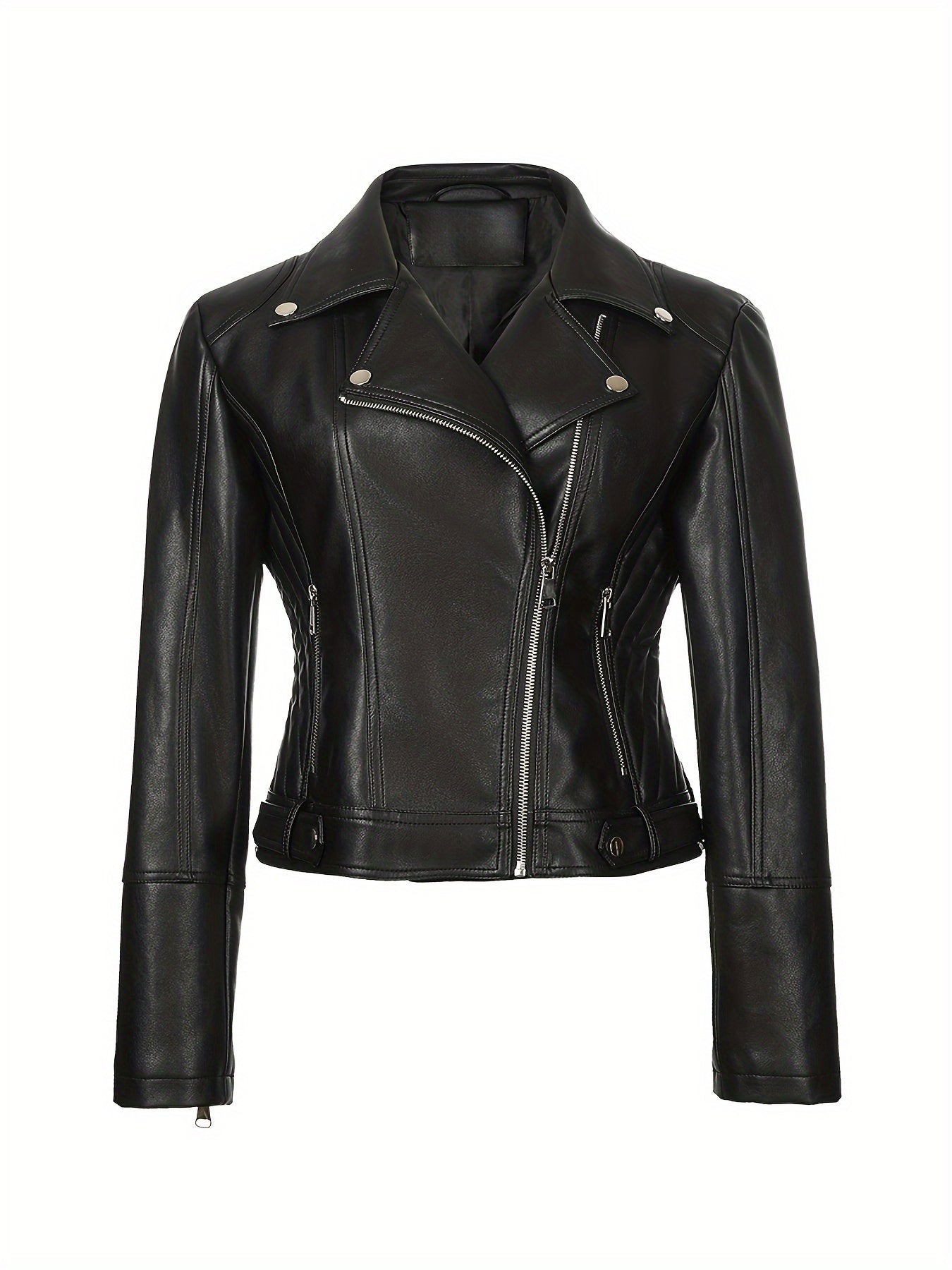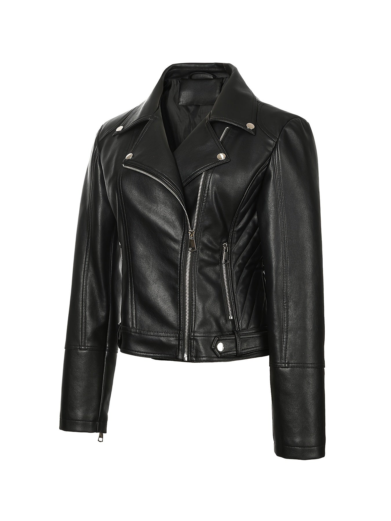 Katta o'lchamdagi qora PU charm moto kurtka, uzun yenglar, zip-up old qismi va tugmachali bilaklar bilan, ko'p qirrali kuz/qish uslubi uchun.