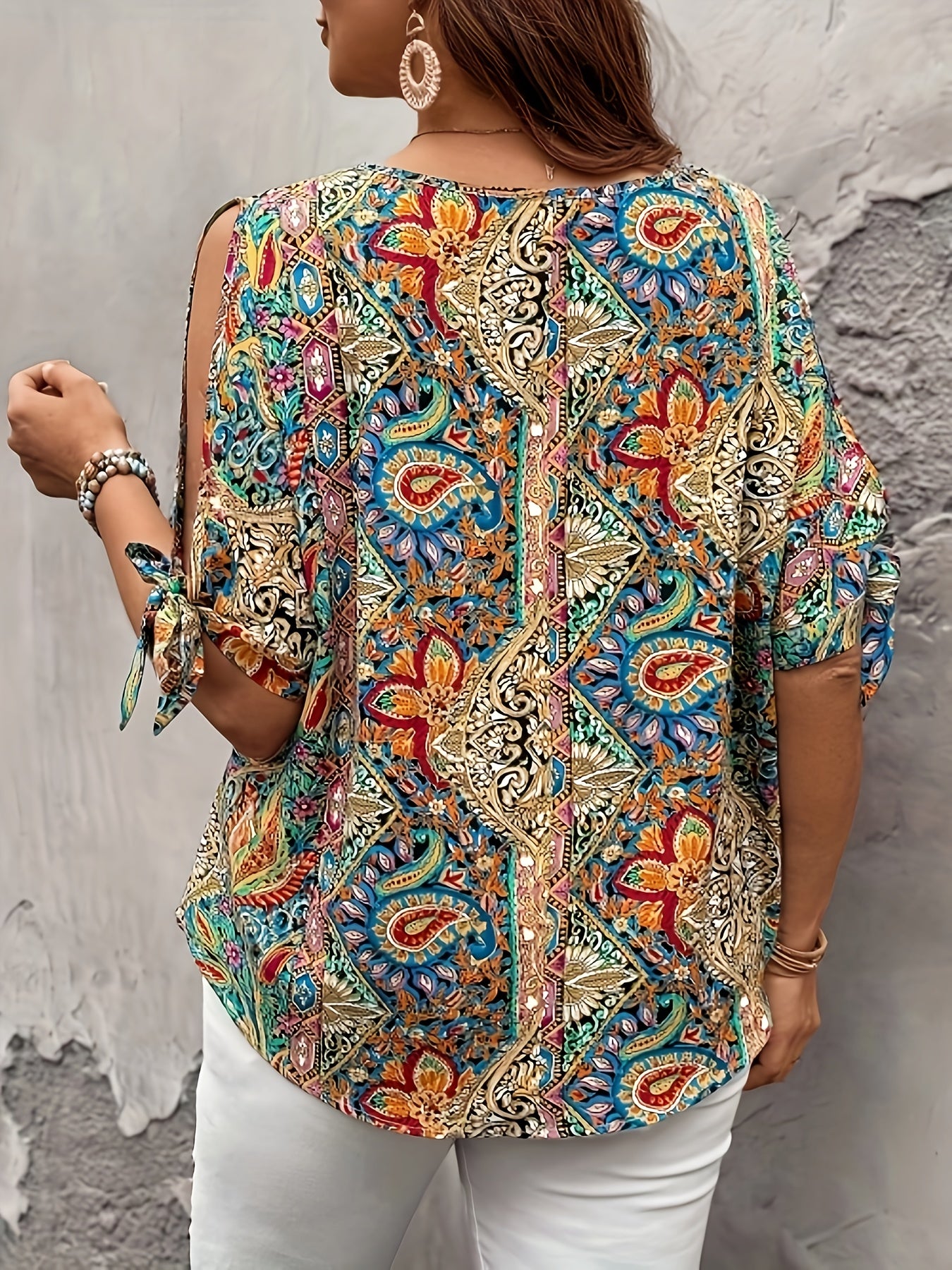 Plus Size Bohemian Paisley Print Blouse with Knot V-Neck Off Shoulder