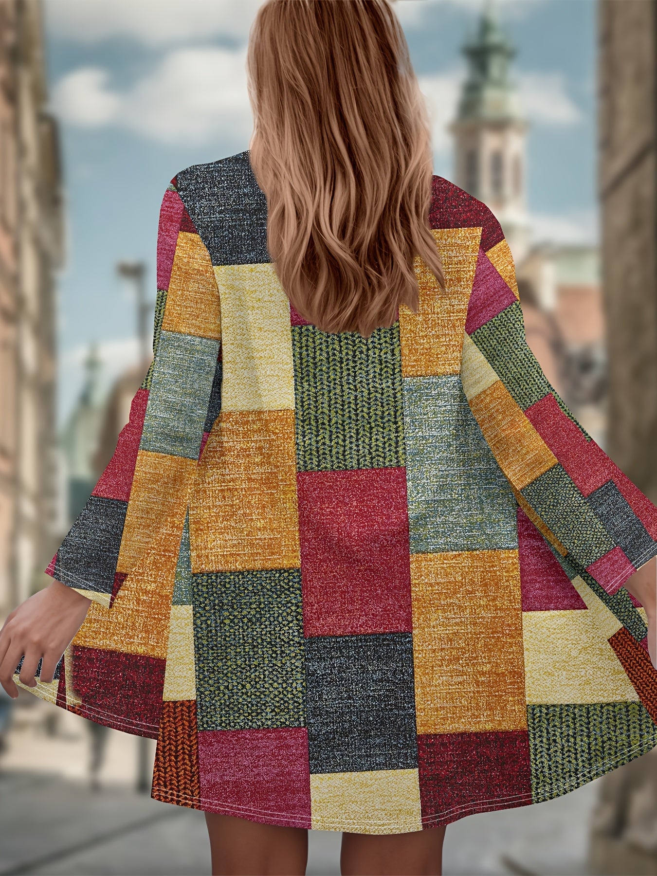 Ayollar uchun uzun yengli, lapel yaka, patchwork 3D bosma, ozgina cho'ziladigan, 180g/m² mato og'irligi, bahor/kovak mavsumi uchun mos keladigan plussayz tasodifiy kardigan.