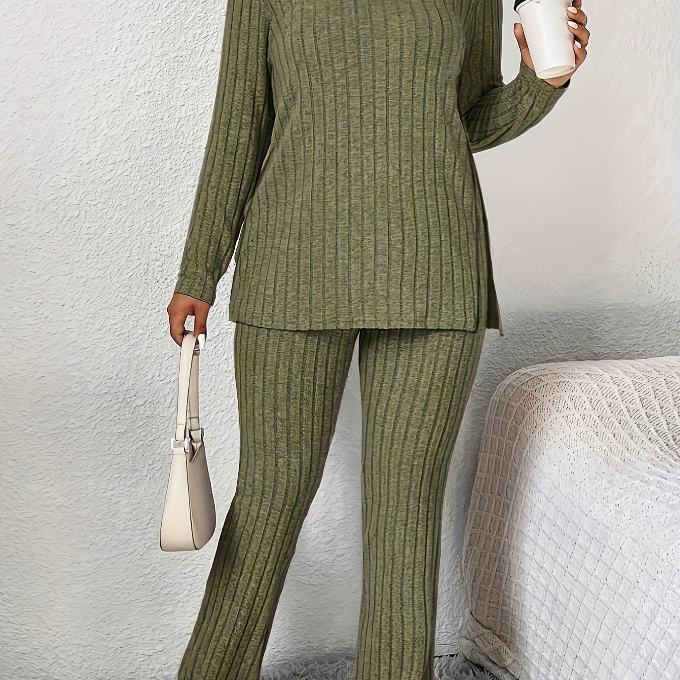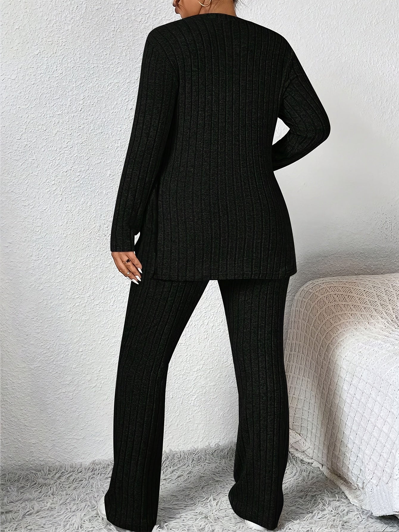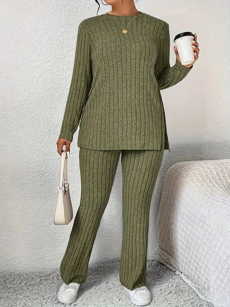 Katta o'lchamdagi tasodifiy bir rangli shimlar to'plami, yon yirtilishi bilan, krujka bo'yinli uzun yengli bluzka va shimlar, ayollar uchun katta o'lchamdagi kiyimlar.