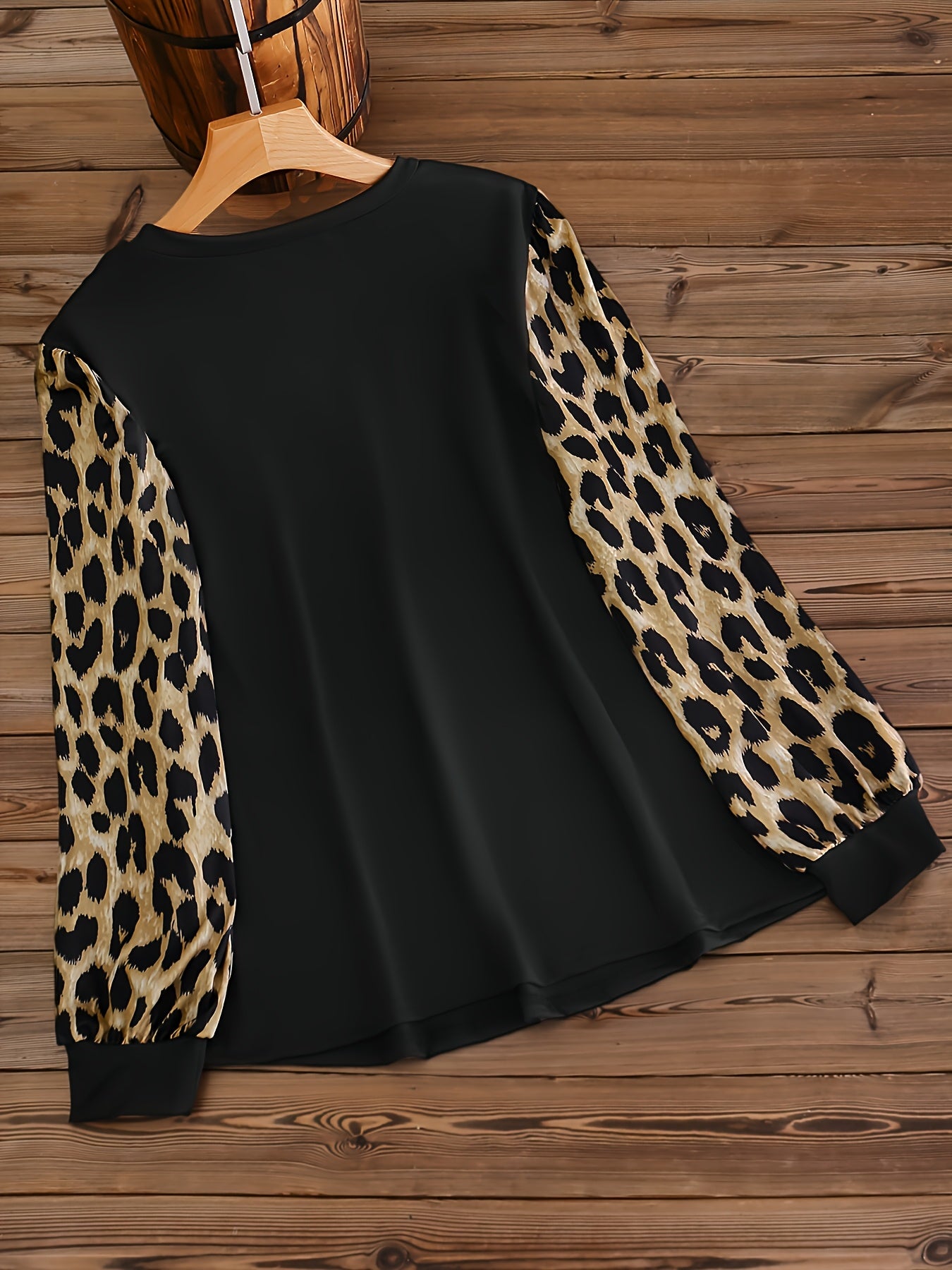 Klassik polyester to'qima matodan tayyorlangan, o'rtacha cho'zilishga ega bo'lgan, bahor/kovak uchun mo'ljallangan, plus o'lchamdagi rangli blok leopard naqshli crew neck futbolka.