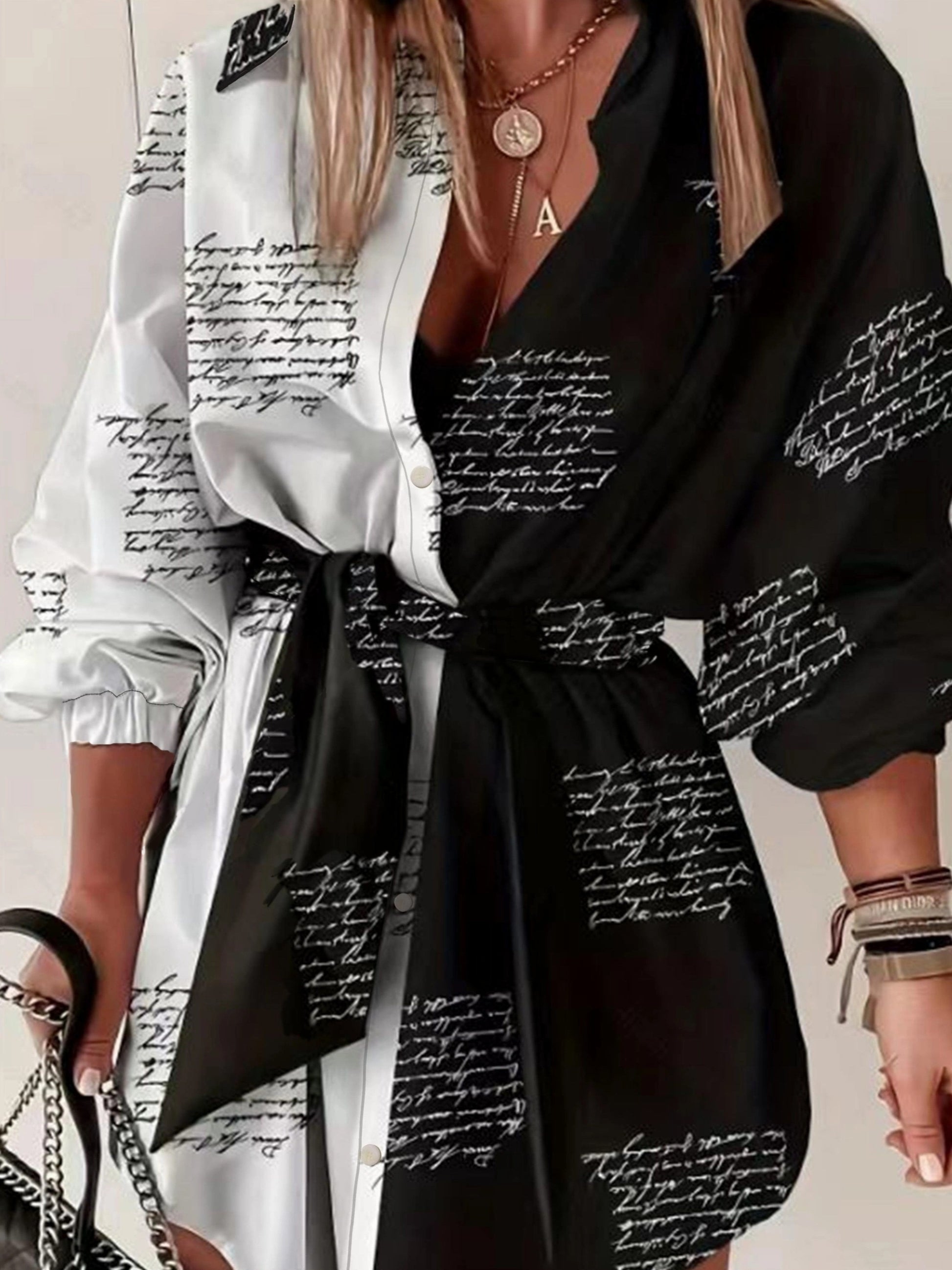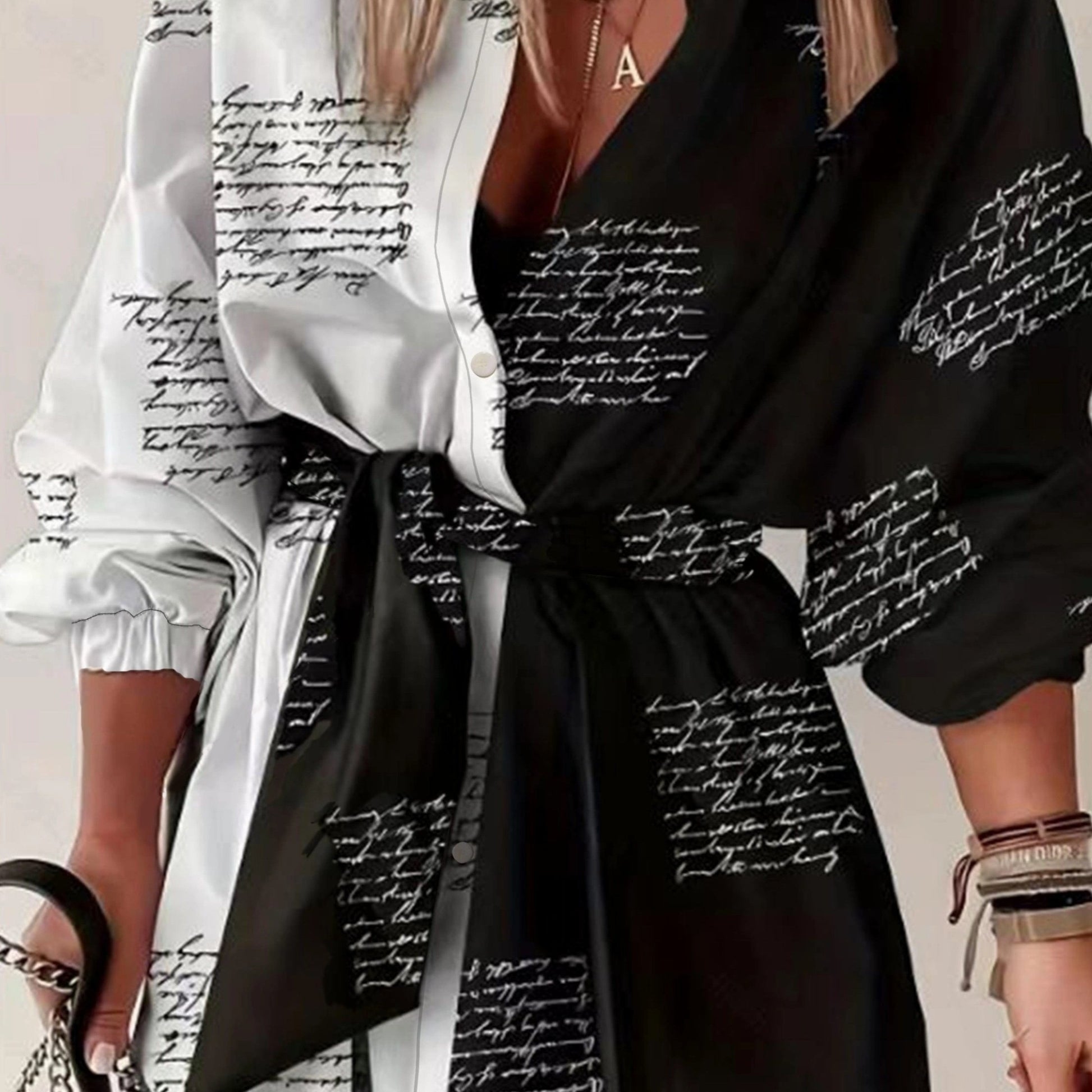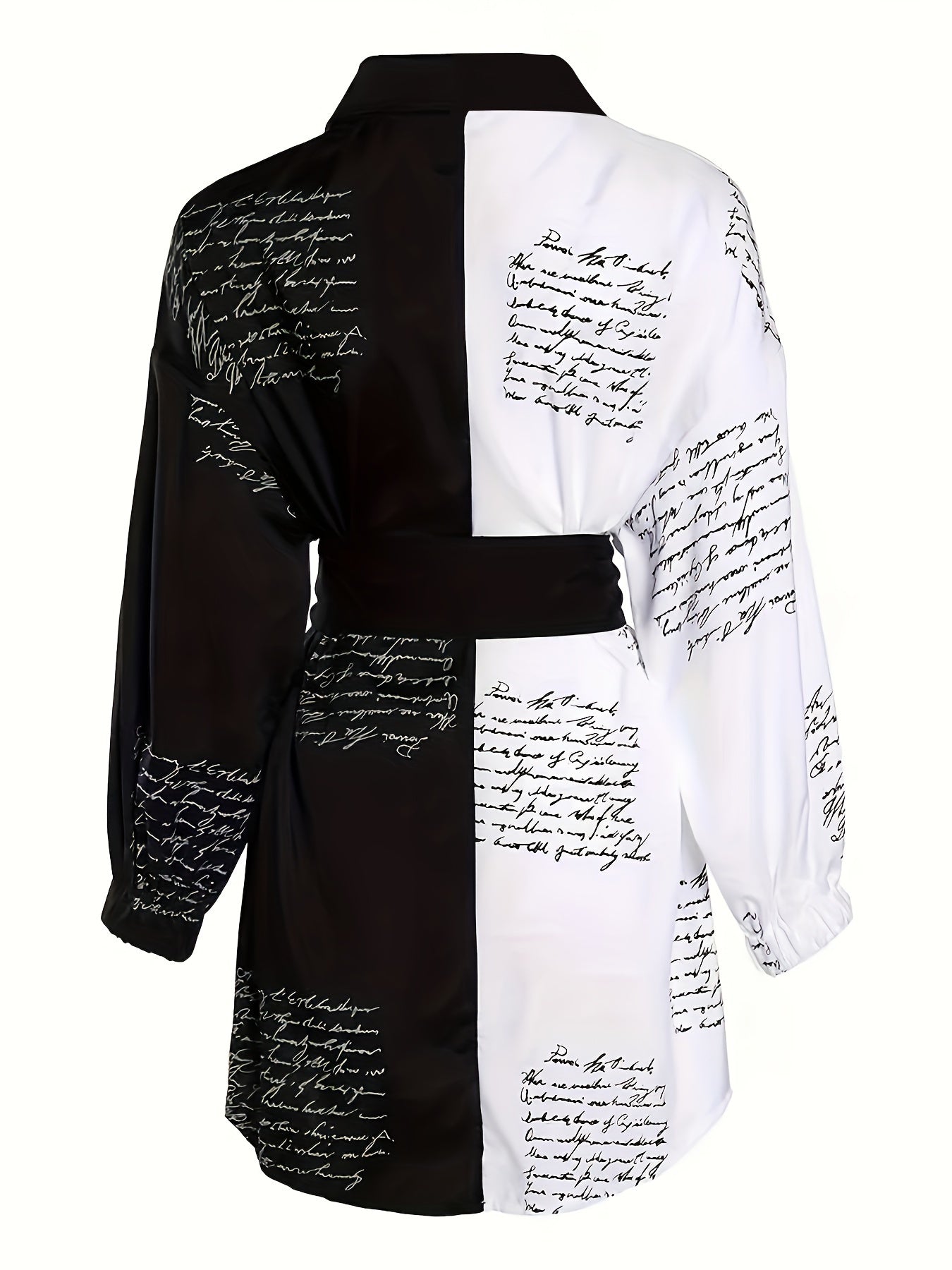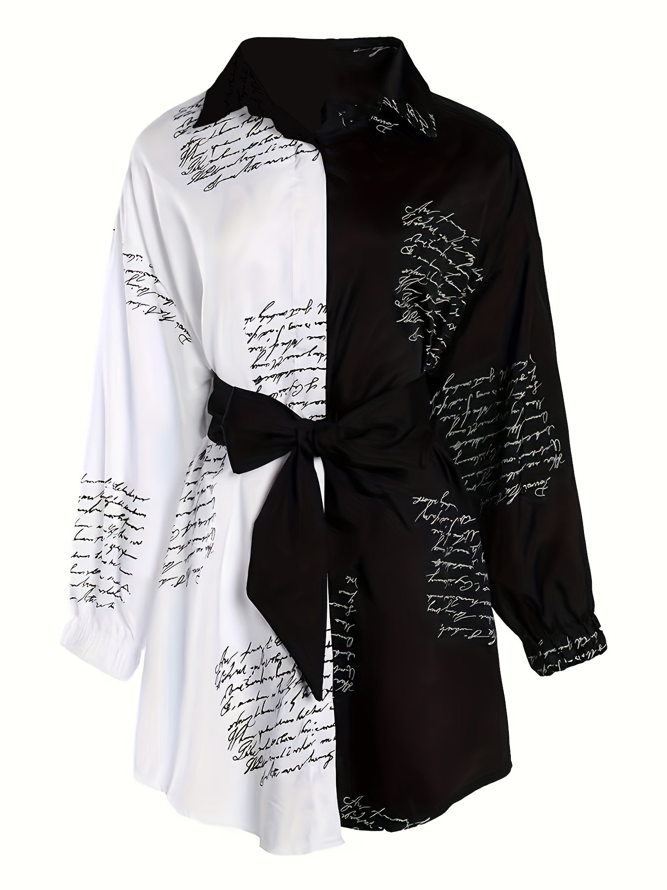 Ayollar uchun belbog'li plussayz rangli blokli ko'ylak. V-yuqori, uzun yeng, harf bosma. Mashinada yuvish mumkin, polyesterdan tayyorlangan. Norasmiy uslub.