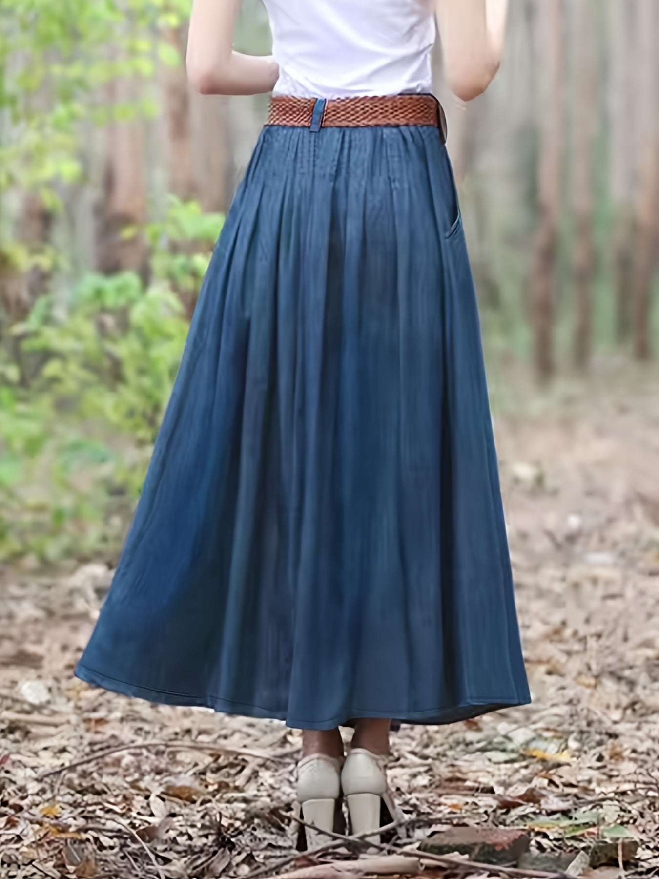 Kichik tugmachali cho'ntaklari bilan bezatilgan, qora ko'k rangdagi, tasodifiy bohem uslubidagi plashli denim midi yubka. Cho'zilmaydigan, mashinada yuvish mumkin, soxta tugma tafsiloti bilan. Bahor/yoz/kuz uchun mukammal.