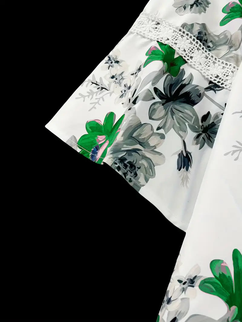 Plus Size Floral Print Blouse Lace Ruffle Neck Casual Top