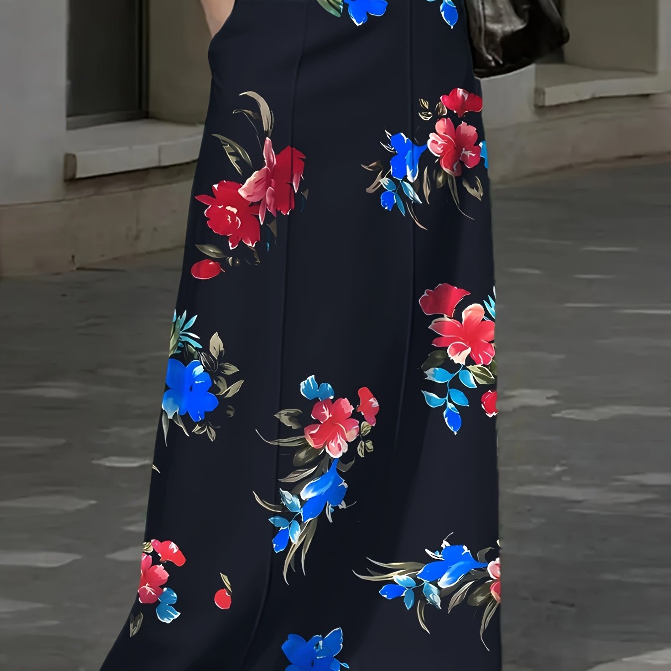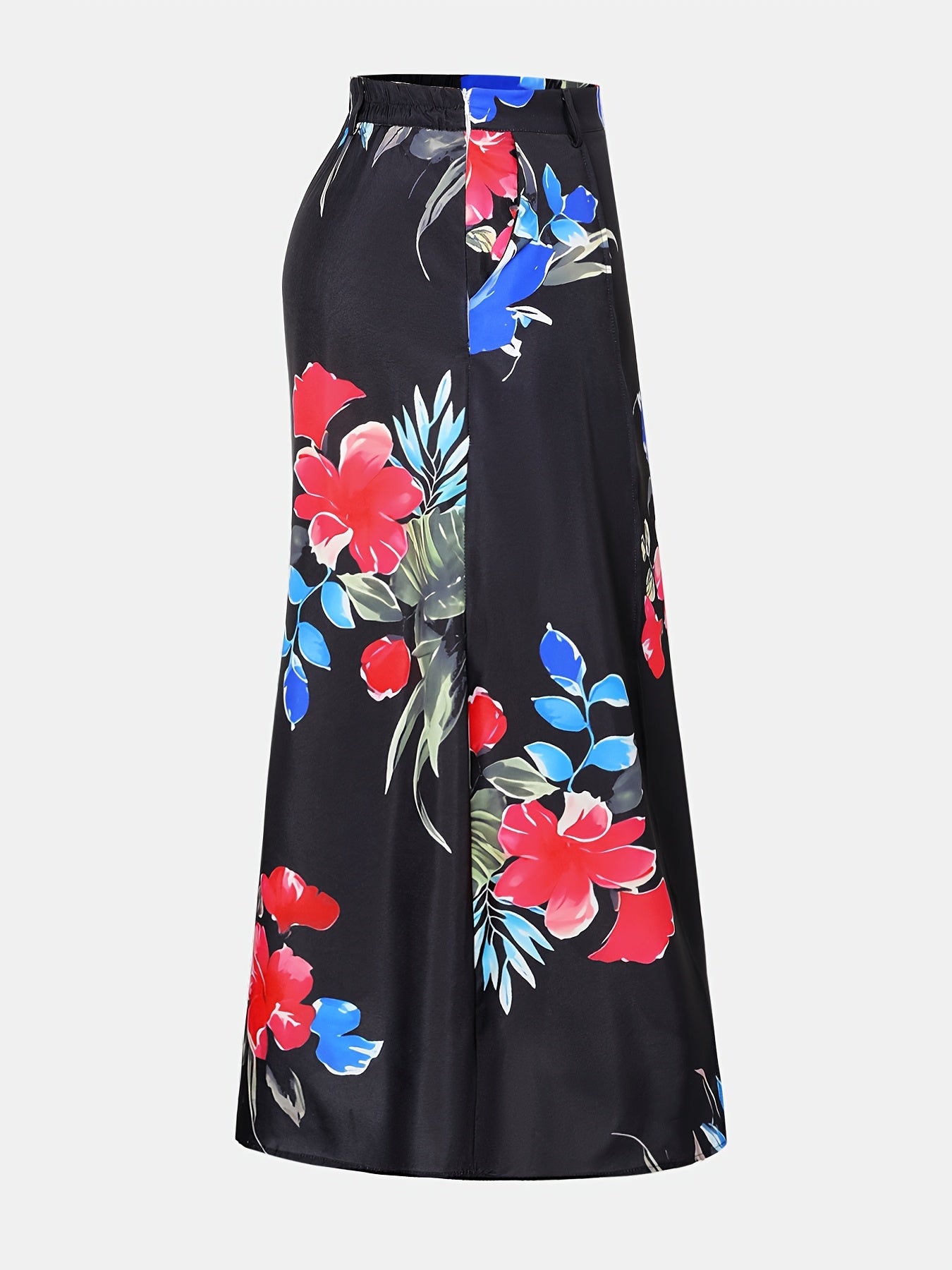 Plus o'lchamli gul bosma bilan cho'ntakli yuqori bel polyester barcha mavsumlar uchun skjørt