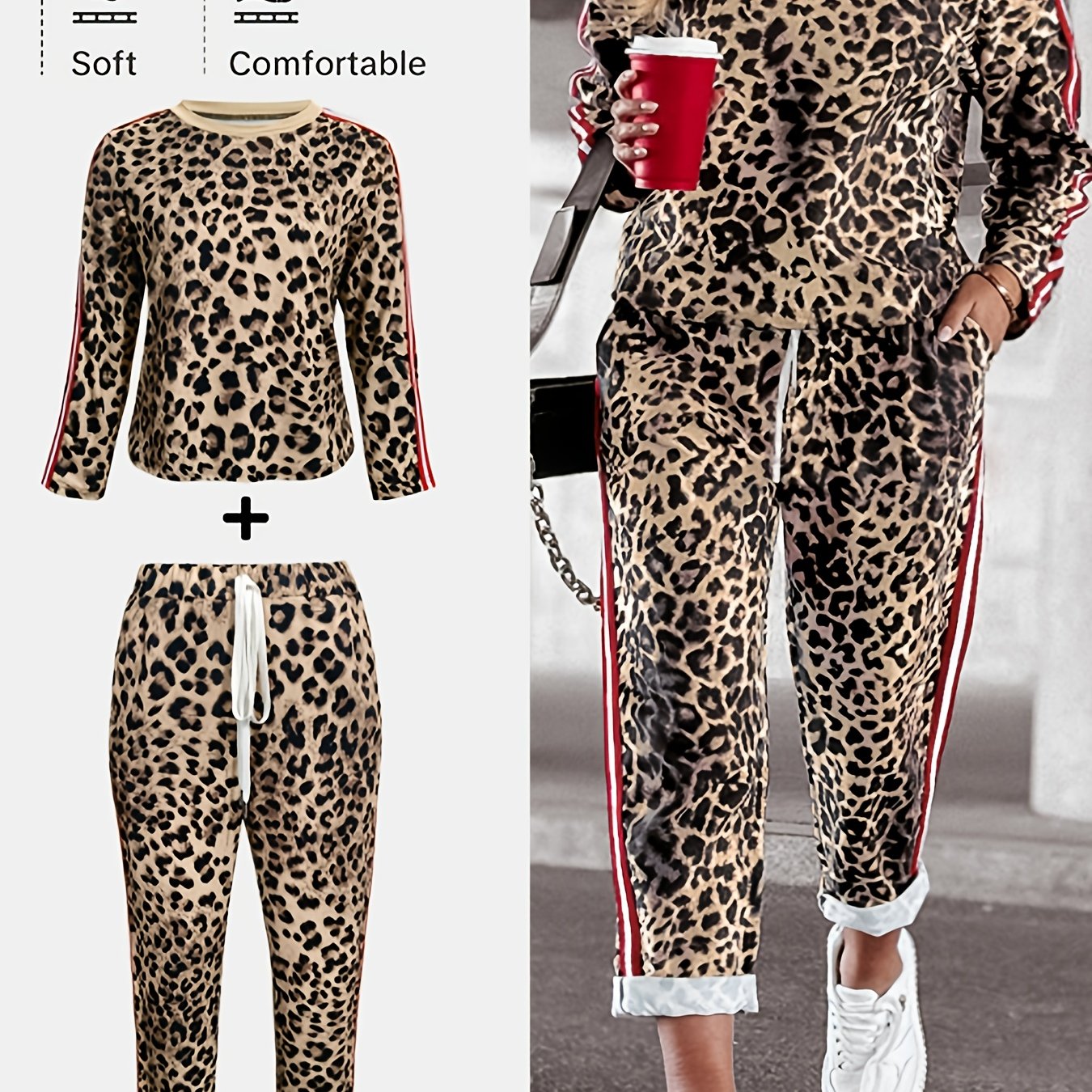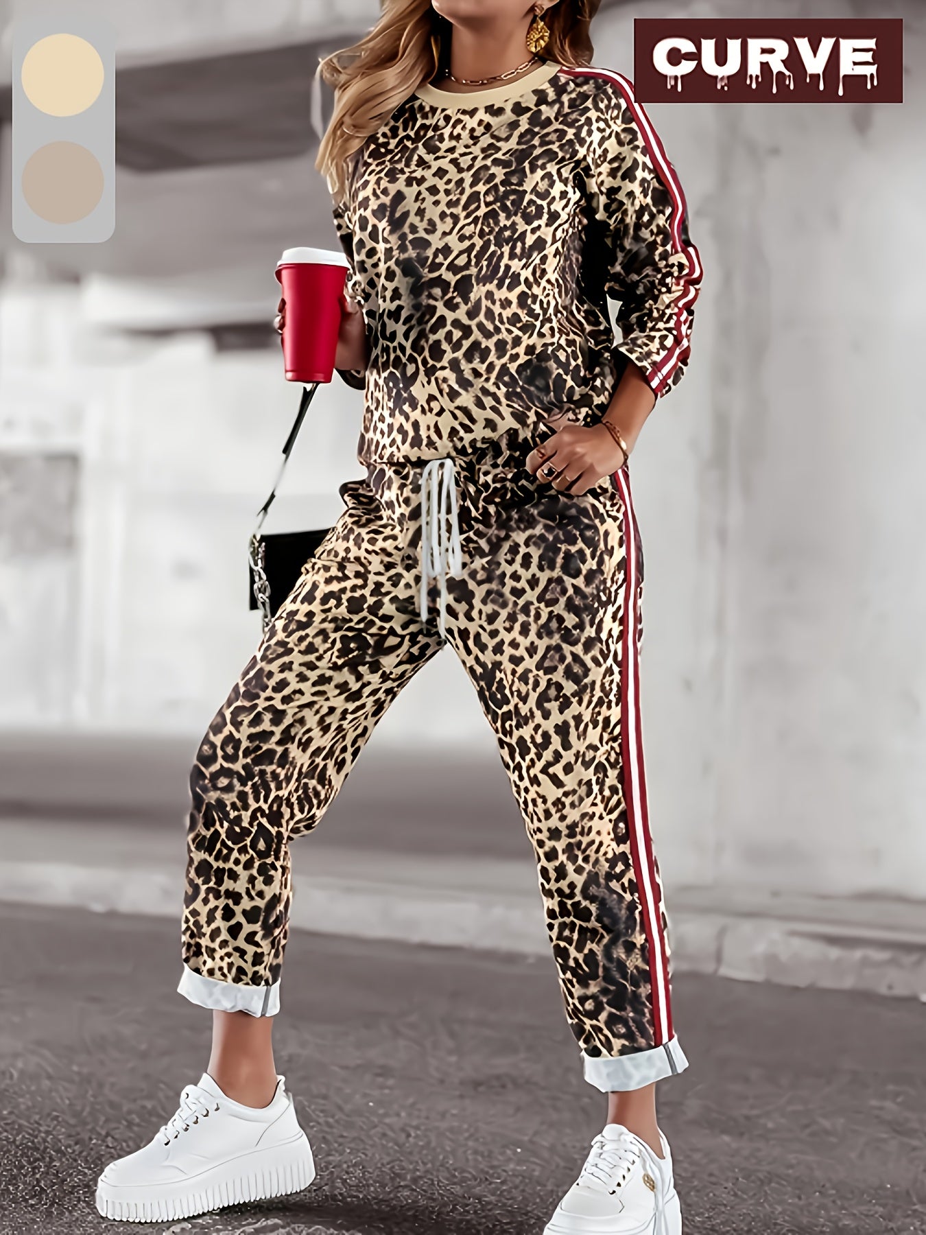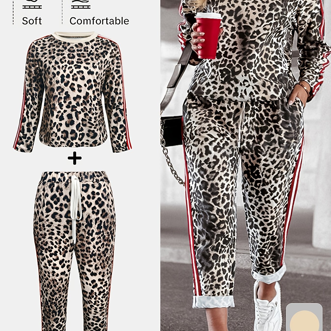 Katta o'lchamdagi leopard naqshli ikki qismli to'plam, yumshoq to'qilgan yuqori qismi va shimlar, tortish bel, tasodifiy uslub, cho'ziluvchan mato.