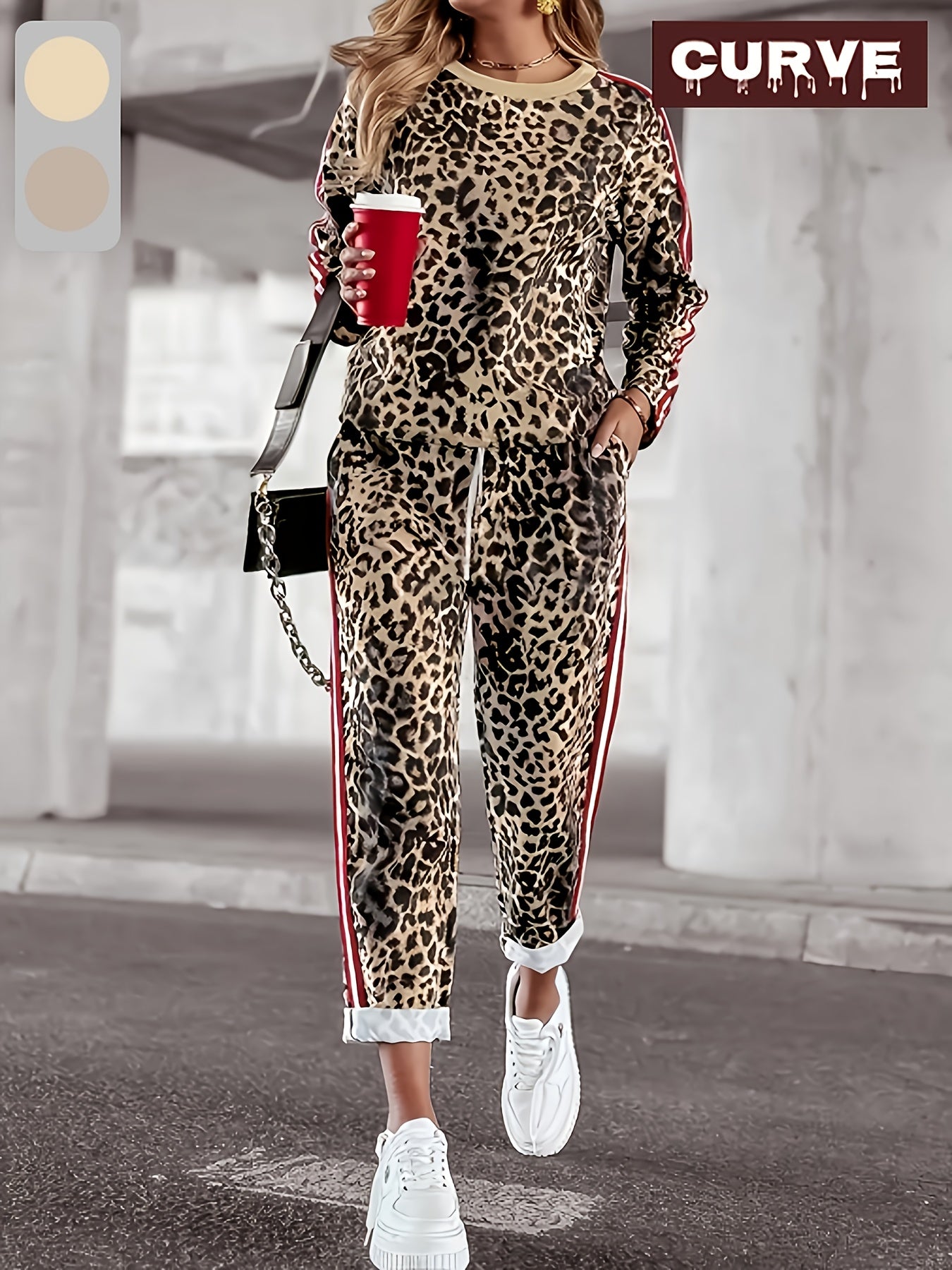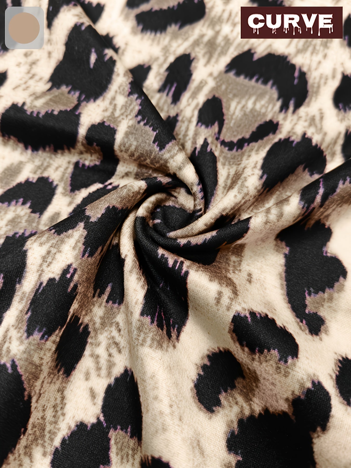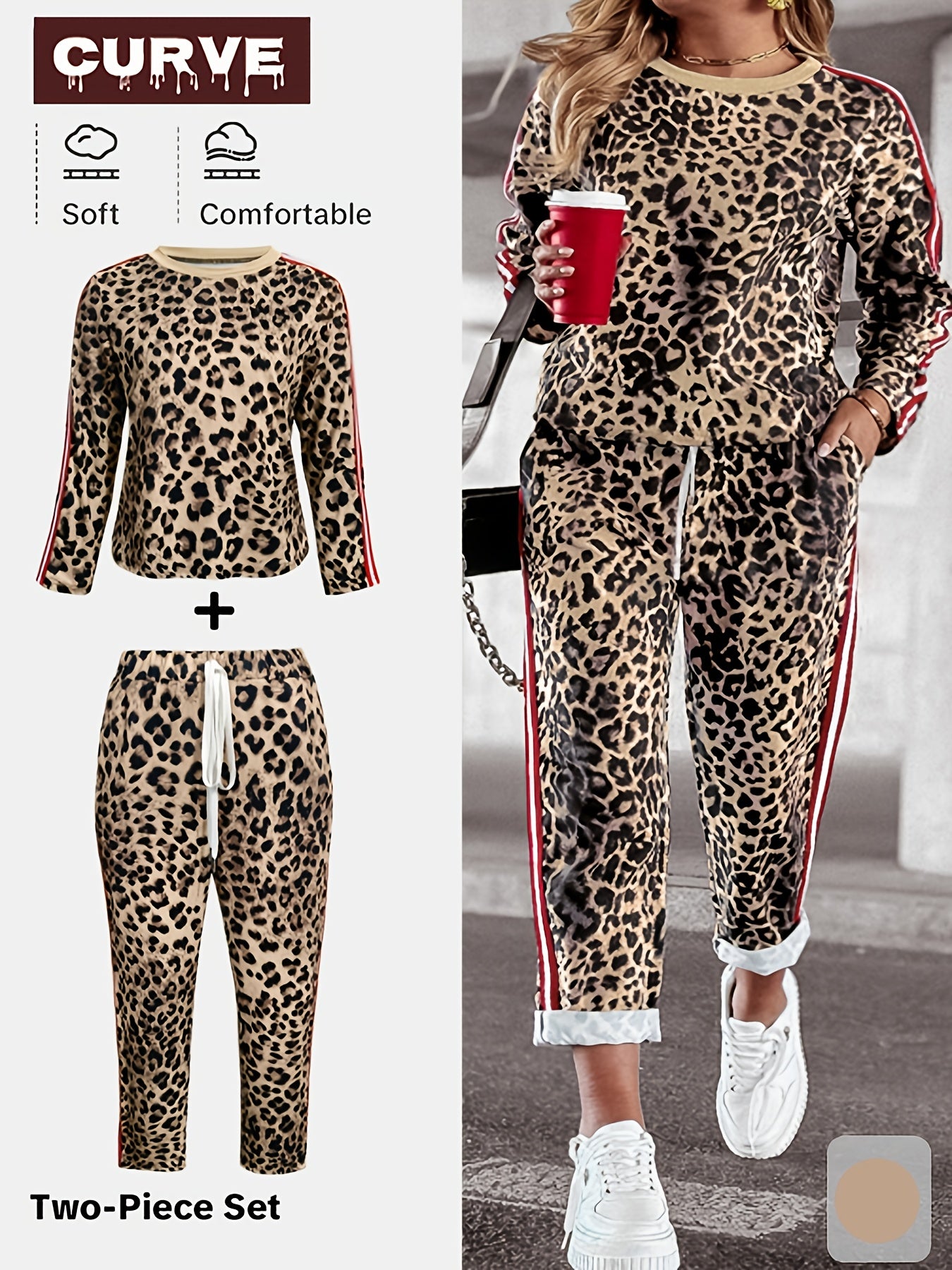 Katta o'lchamdagi leopard naqshli ikki qismli to'plam, yumshoq to'qilgan yuqori qismi va shimlar, tortish bel, tasodifiy uslub, cho'ziluvchan mato.