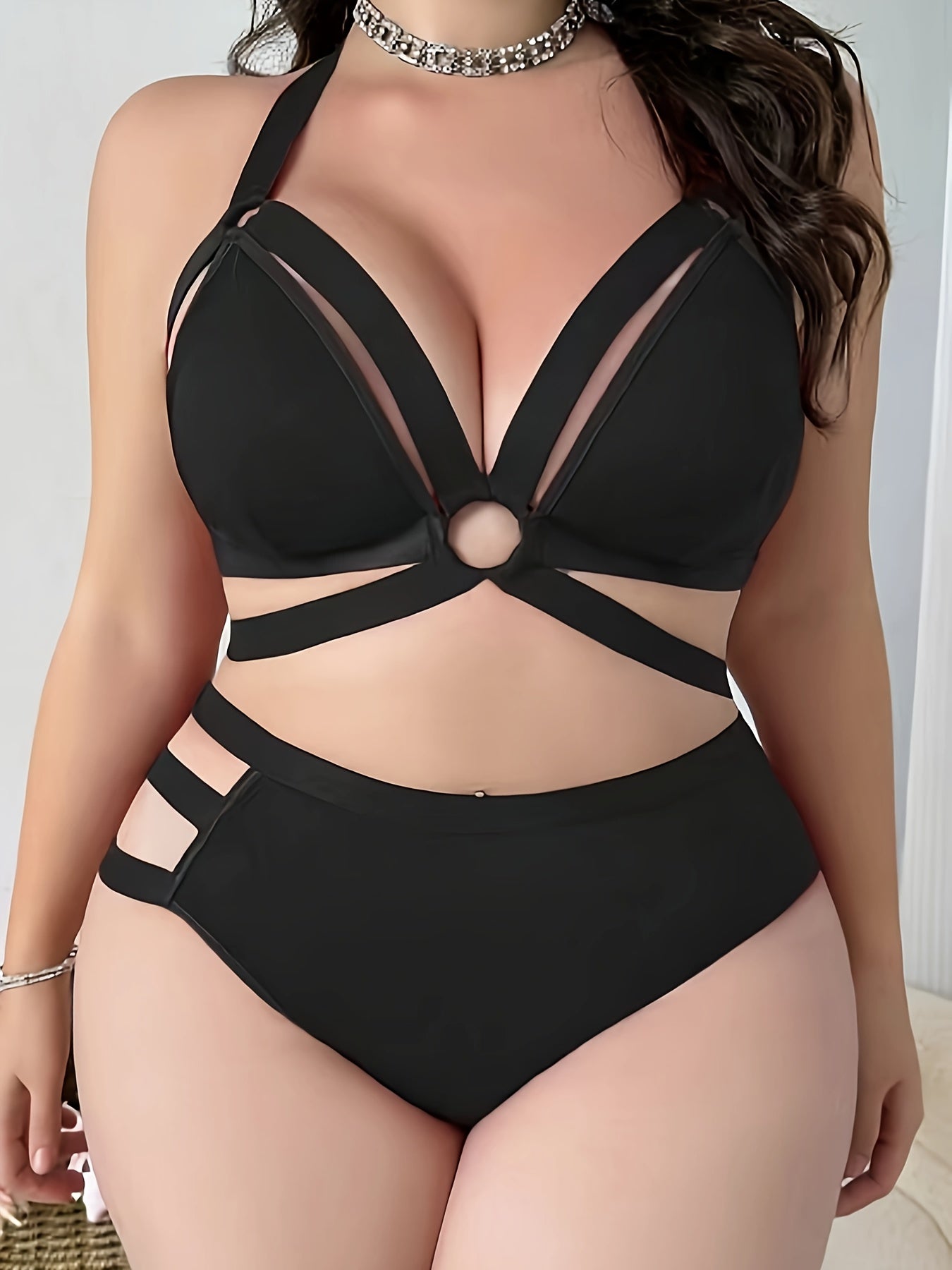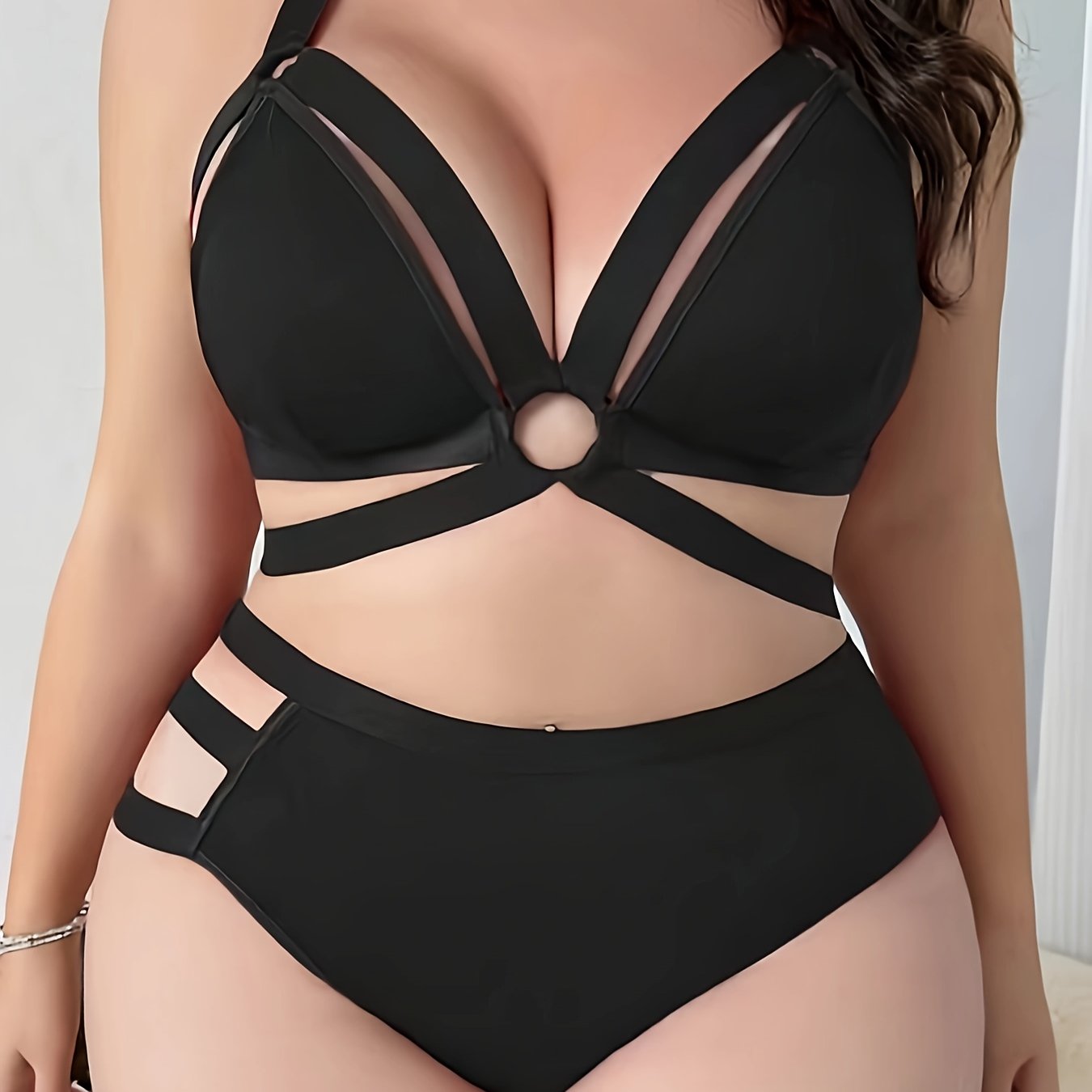 Kross tafsilotlari bilan plussayz ichki kiyim to'plami, o'rtacha cho'ziluvchan trikotaj mato, qulay bustier va korset kostyumi.