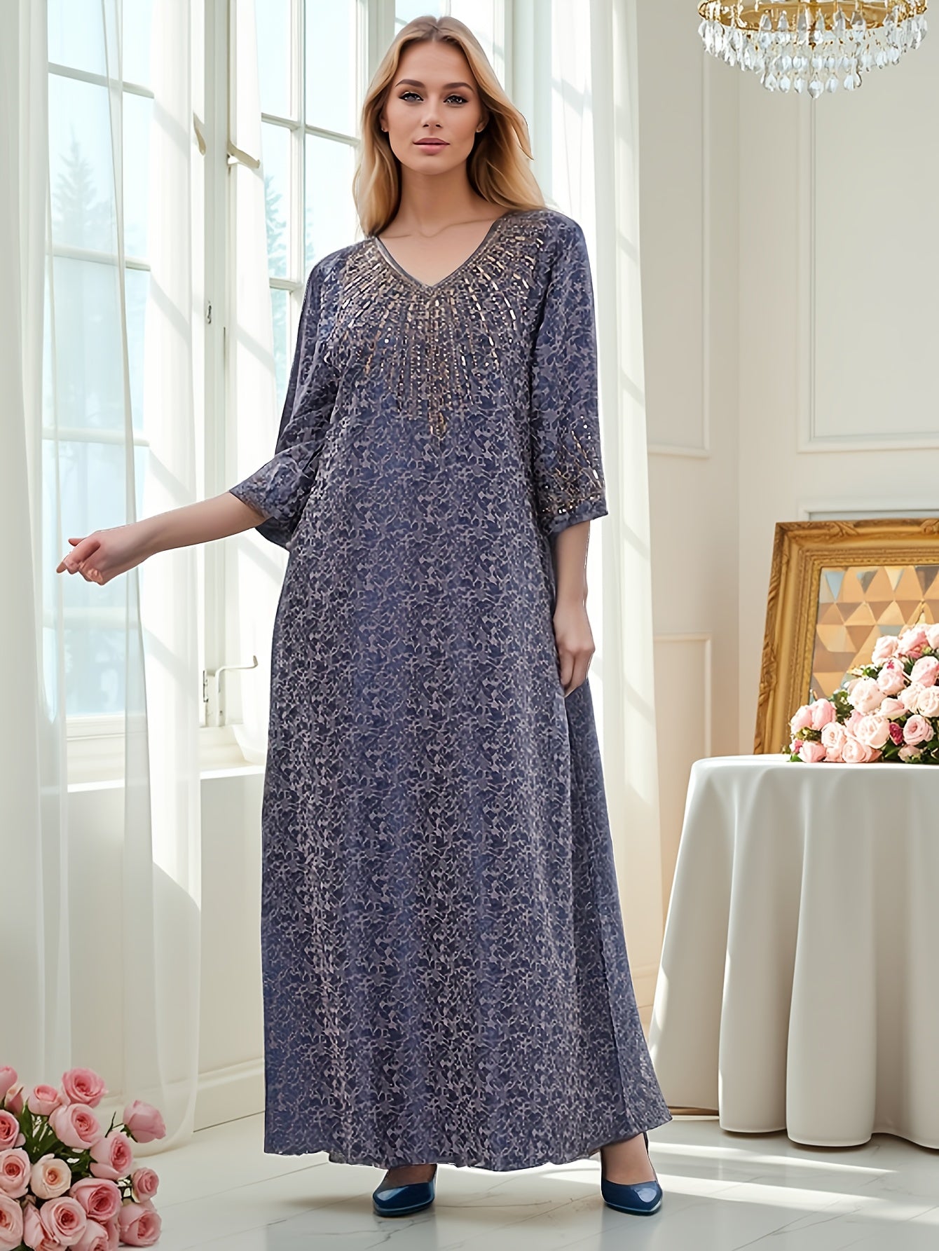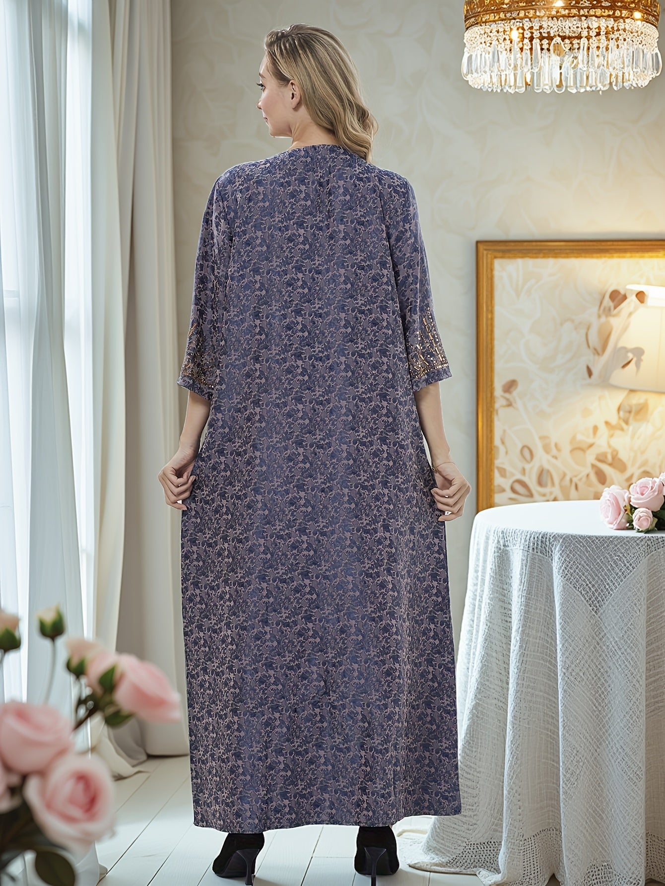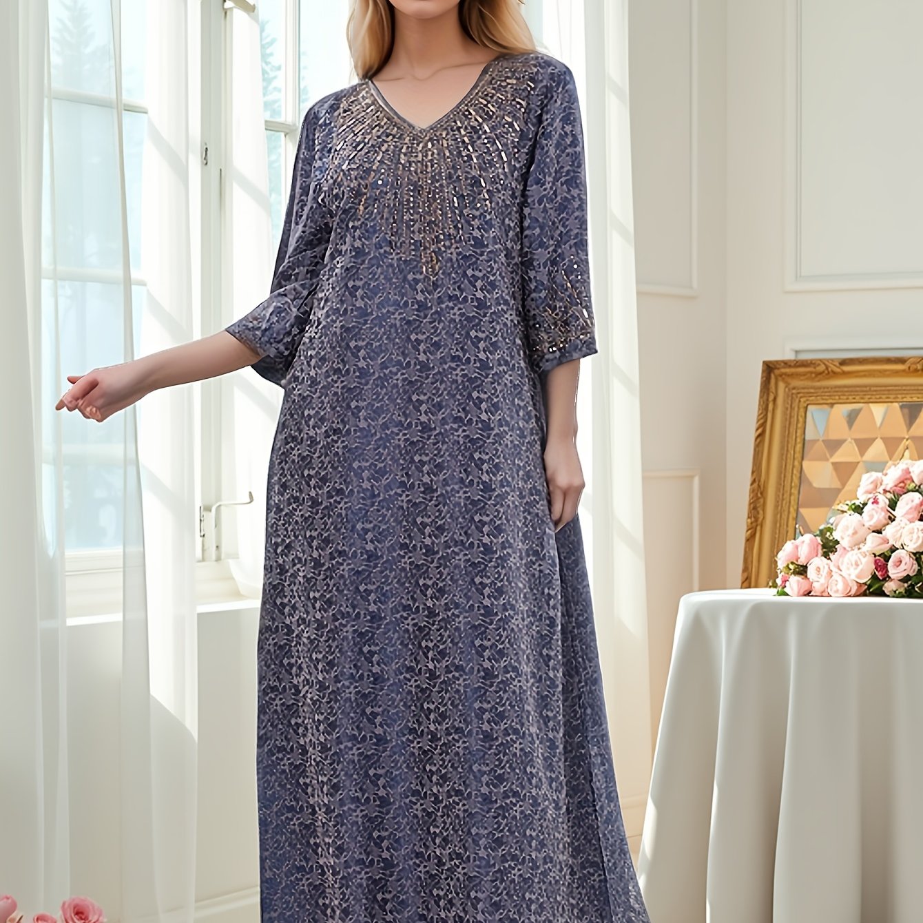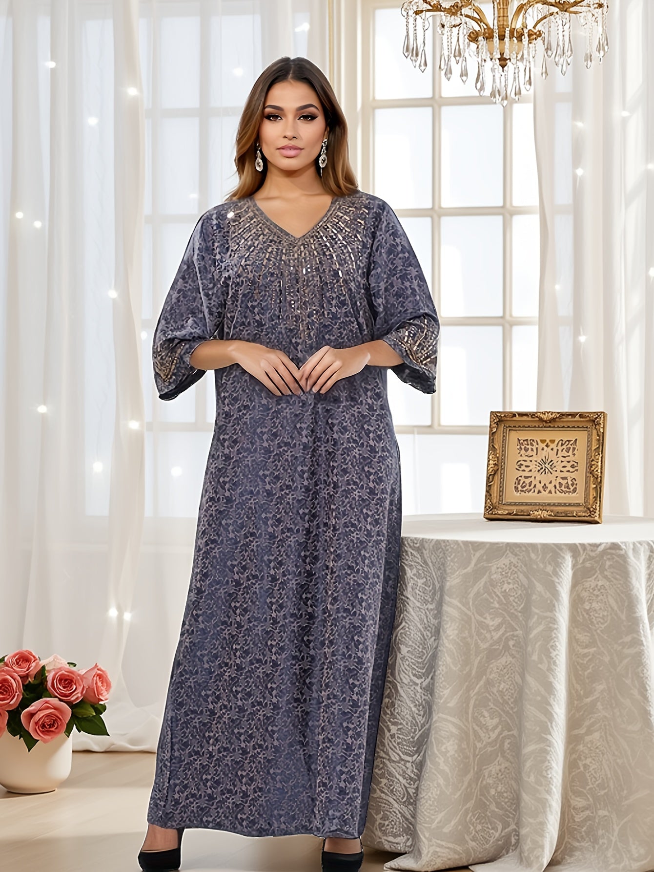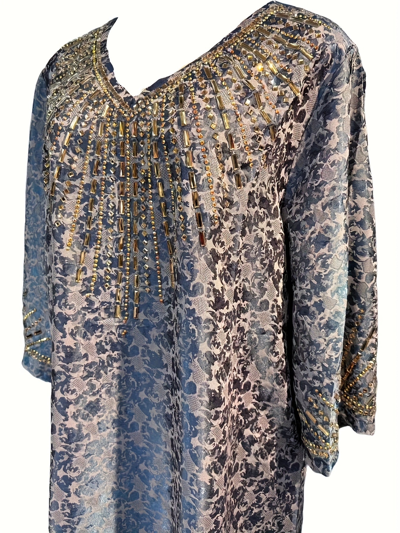 Plus o'lcham, erkin fit, modest turk kaftan kiyimi, qulay 3/4 uzunlikdagi qo'l dizayni bilan. Nafas oladigan, yengil mato bilan tayyorlangan, kundalik kiyim, partiyalar va oddiy tashriflar uchun bahor, yoz va kuz mavsumlarida qulaylik taqdim etadi. Kiyim rhinestone bezaklar va tasodifiy bosma bilan bezatilgan, bu esa unga ozgina nafislik qo'shadi. Uzun bo'lib, turli vaziyatlar uchun mos, mashina bilan yuviladi va shaffof bo'lmagan materialdan tayyorlangan, ishonch bilan kiyish uchun.
