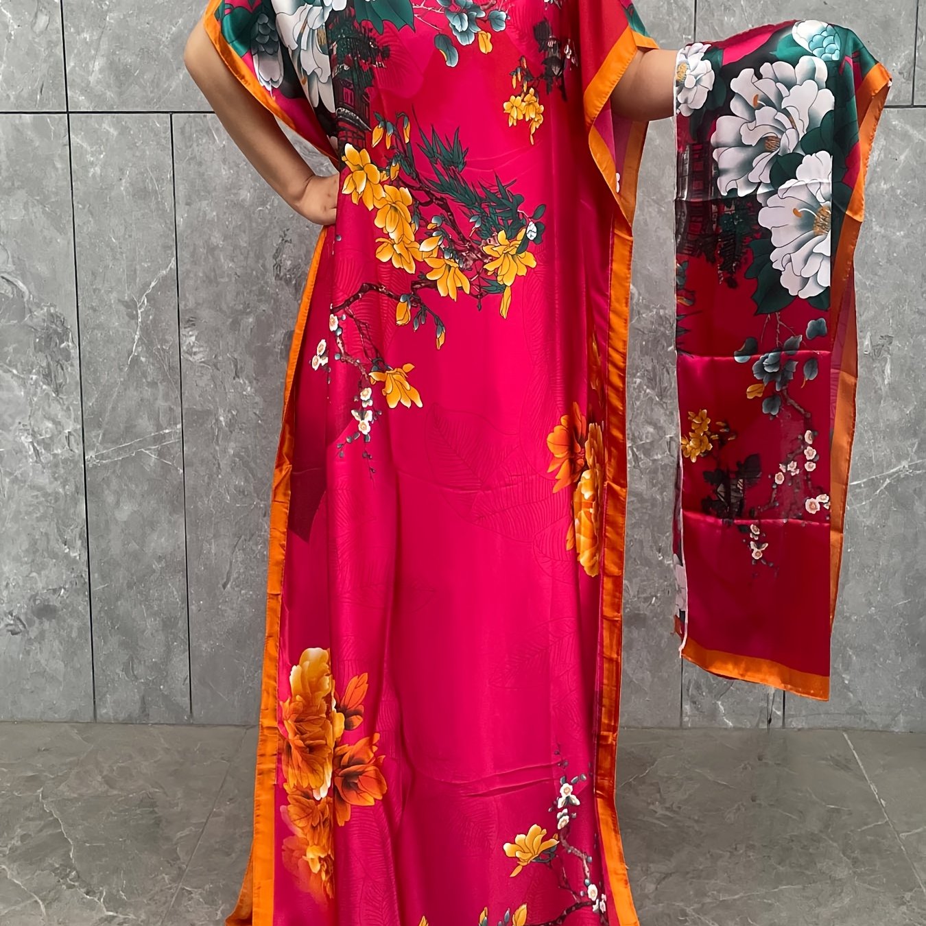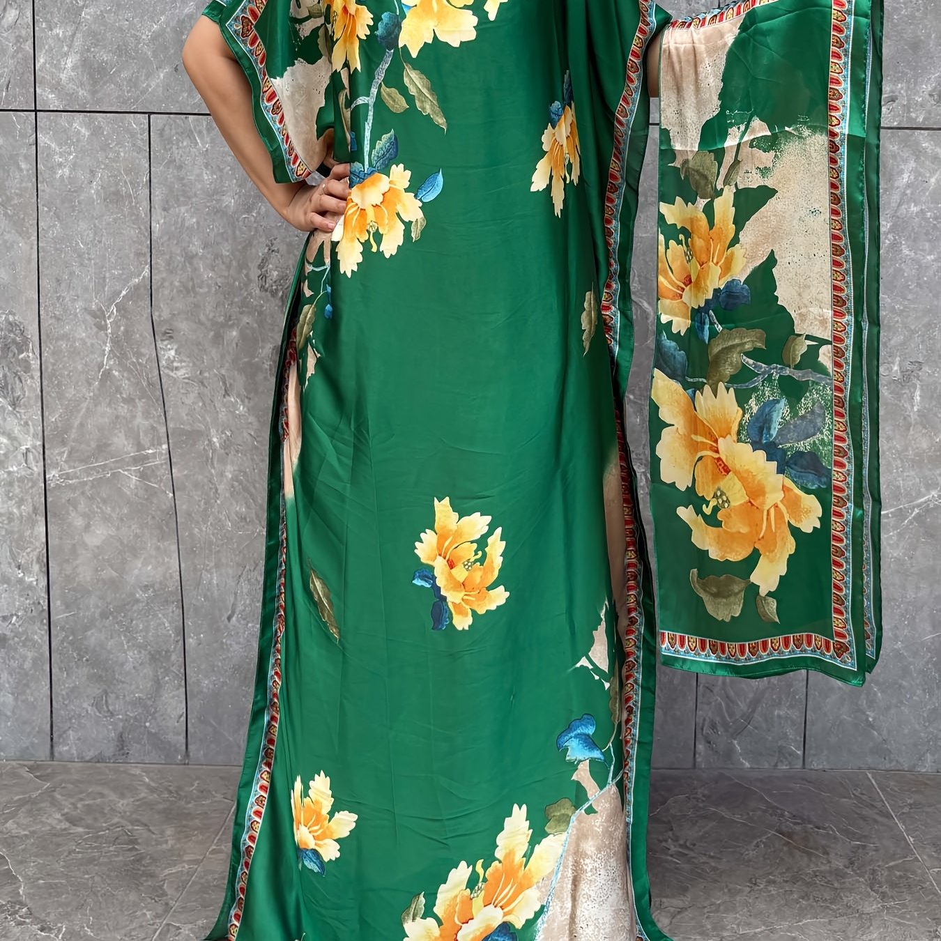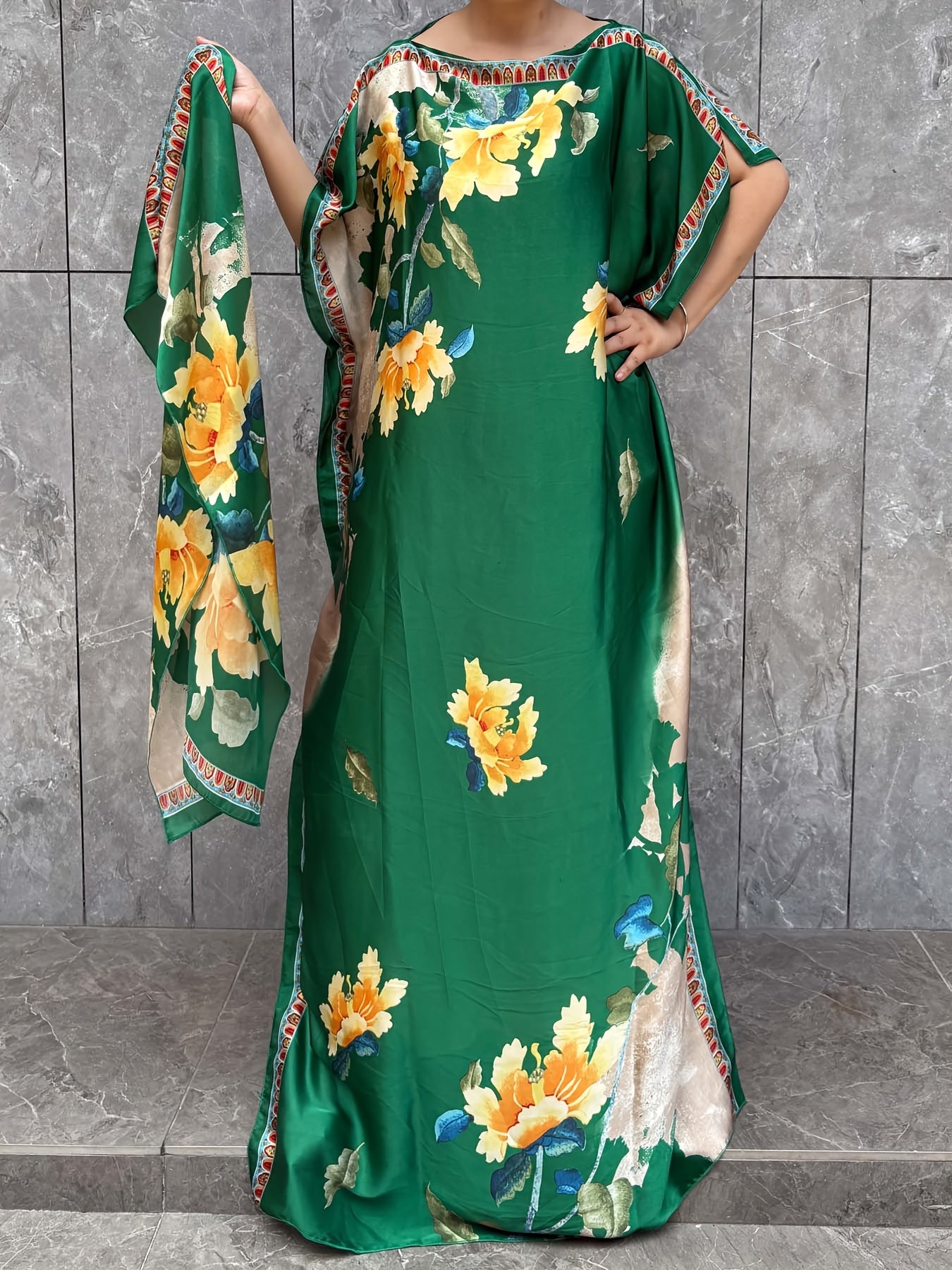 Plus o'lchamli maxi kaftan kiyi gullar bilan bosilgan, oqimli va qulay ayollar uchun