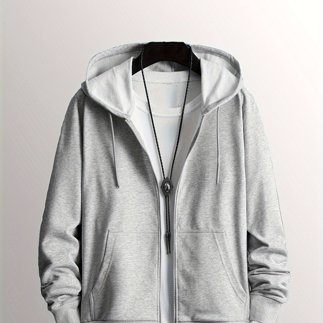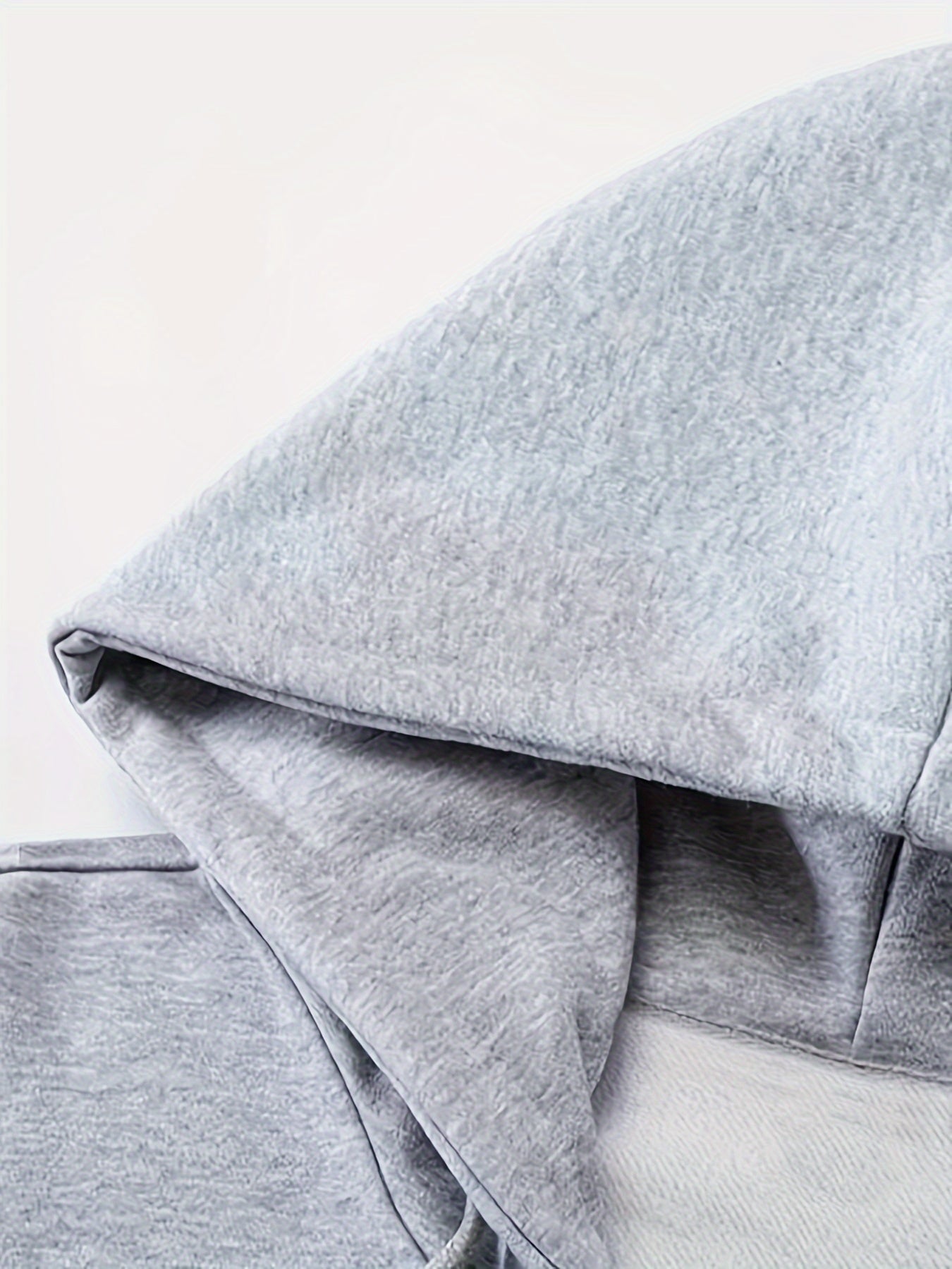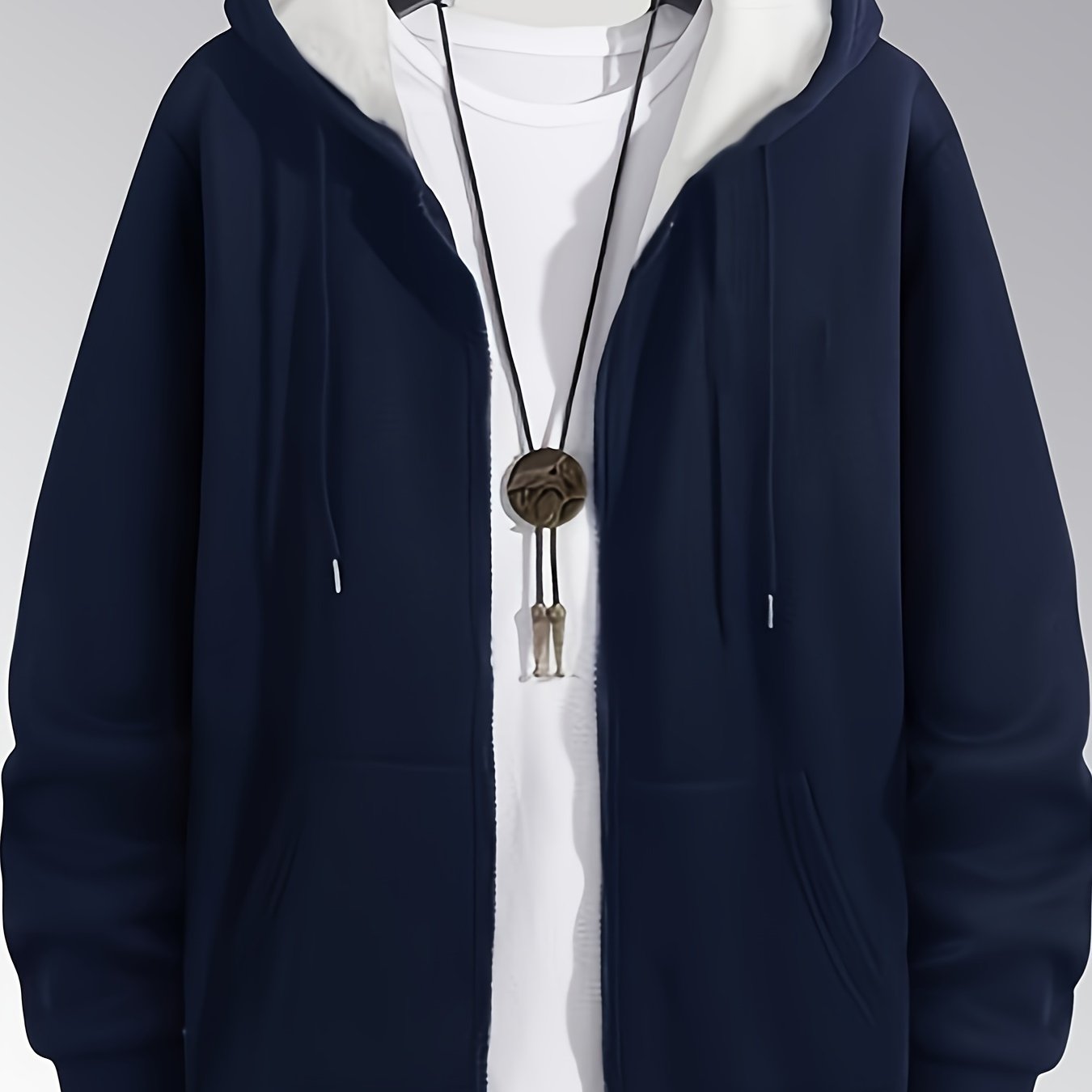 Katta o'lchamdagi erkaklar uchun tasodifiy kapüşonli sviter, qish uchun mustahkam rangli polyester to'qima, fermuar yopilishi va cho'ntak tafsilotlari bilan.