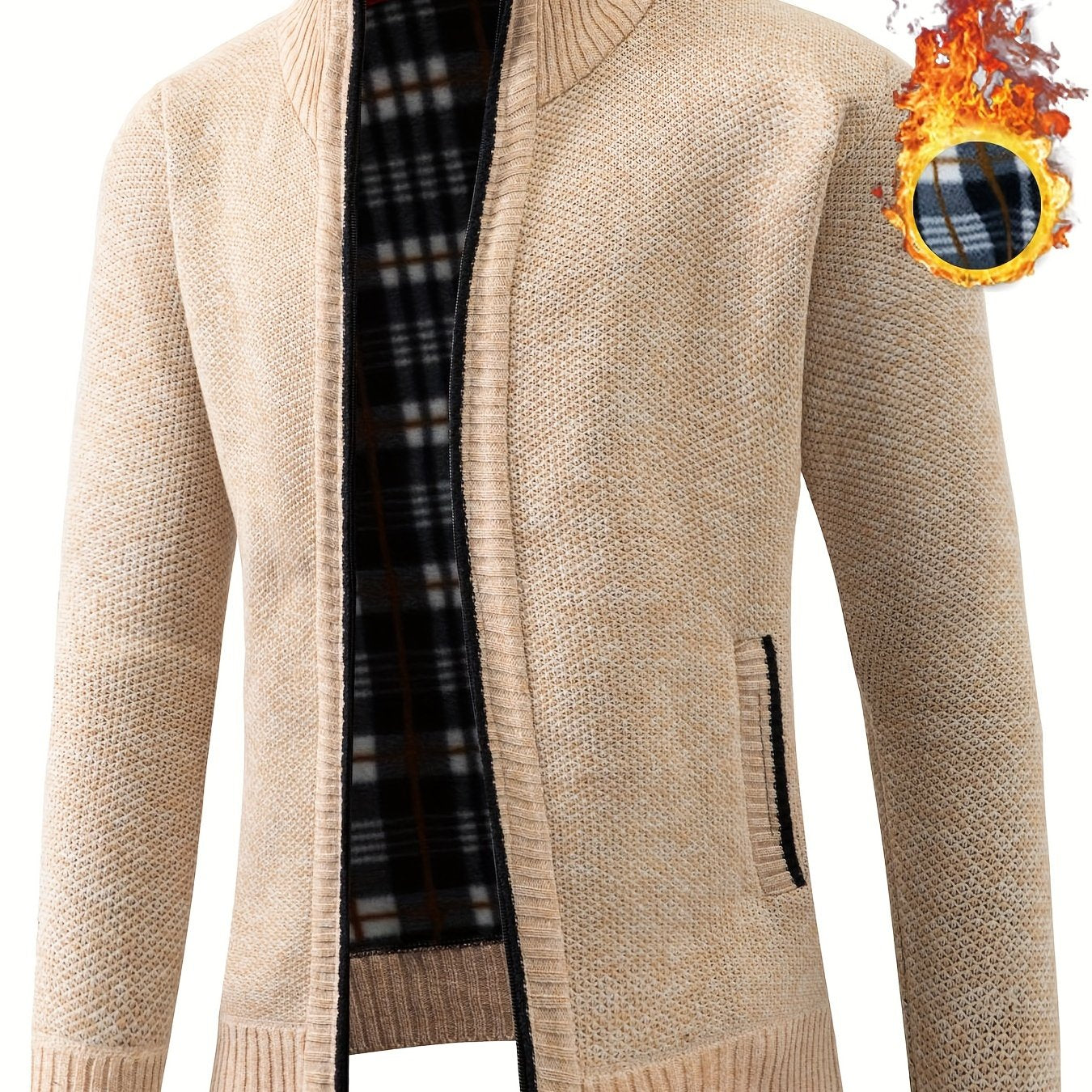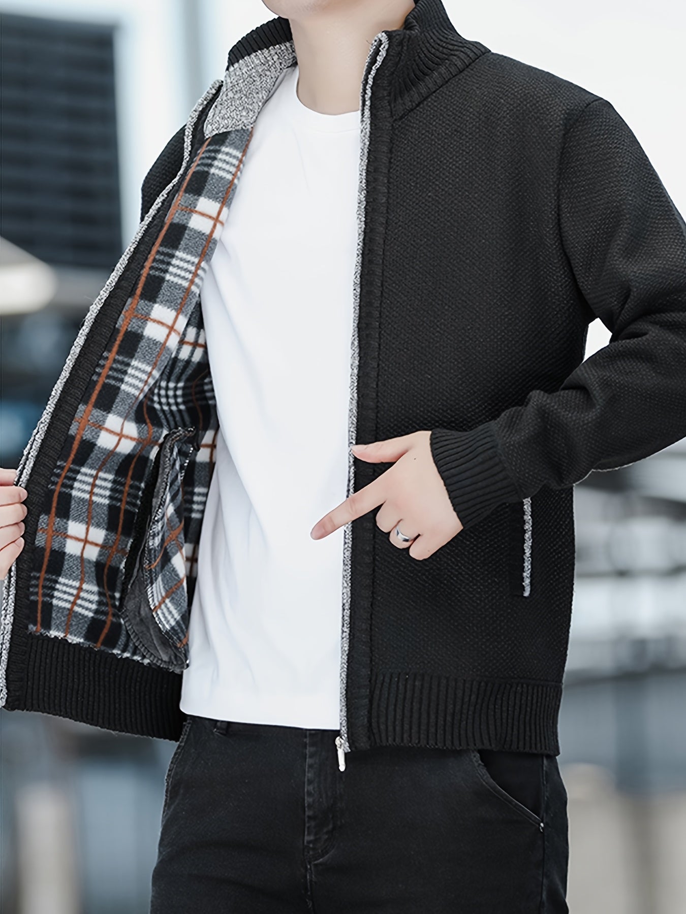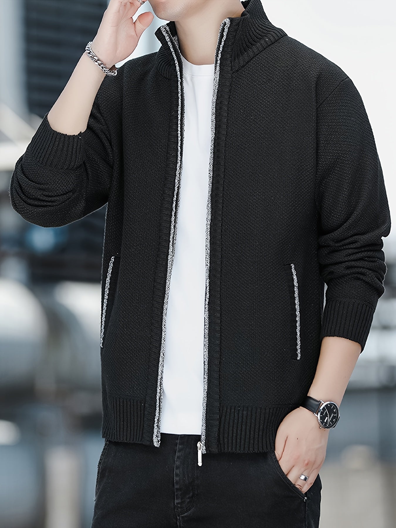 Katta o'lchamdagi erkaklar uchun krujka bo'yinli kardigan sviter 100% polyester to'qima matodan tayyorlangan. Mustahkam rang, uzun yenglar, oddiy moslik, cho'ntaklar va zipper tafsilotlari mavjud. Kuz/qish uchun ideal.