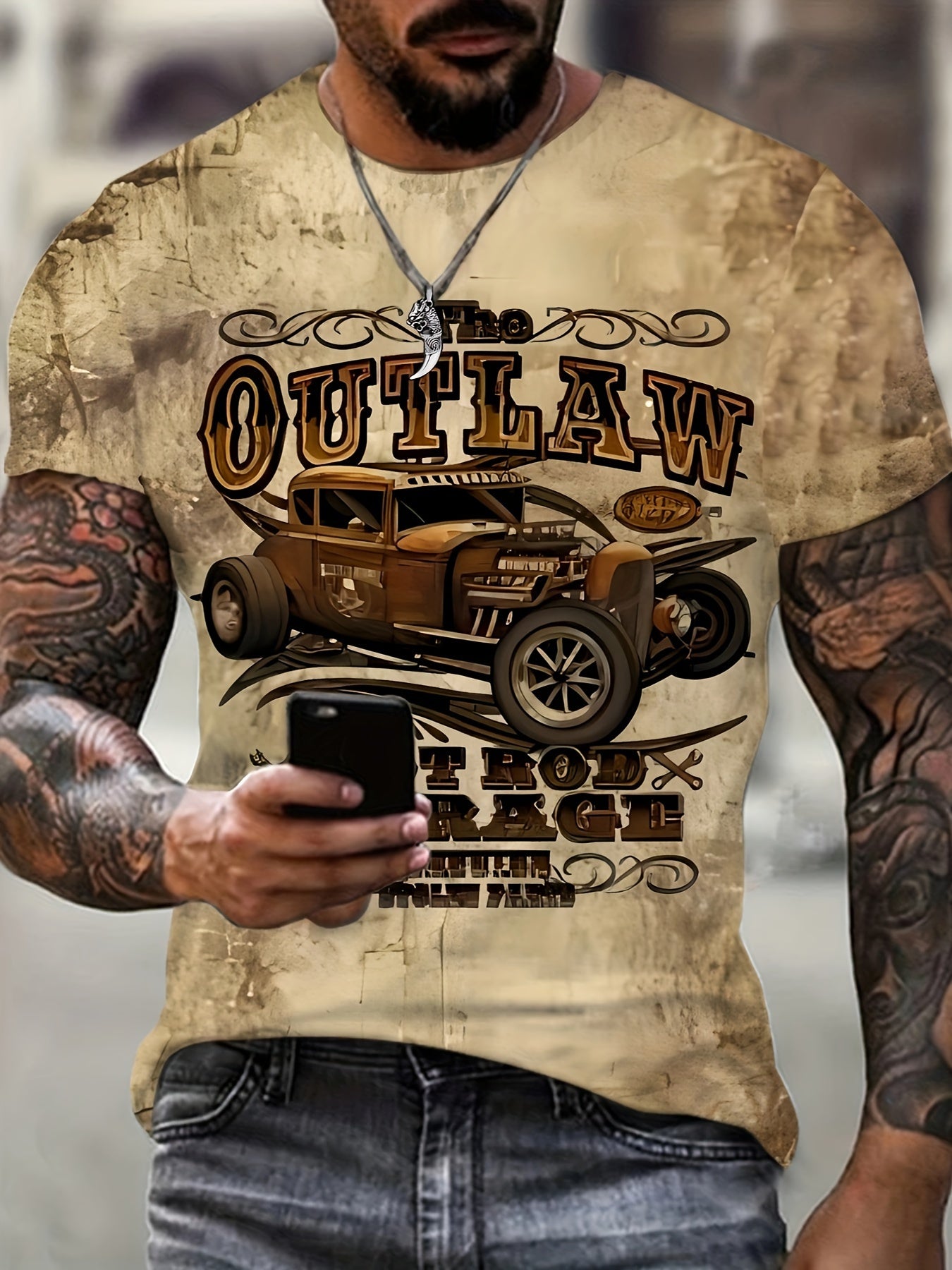Katta o'lchamdagi erkaklar futbolkasi, vintage avtomobil printi, retro uslubida.