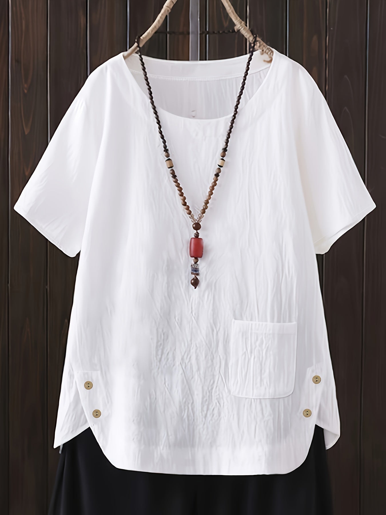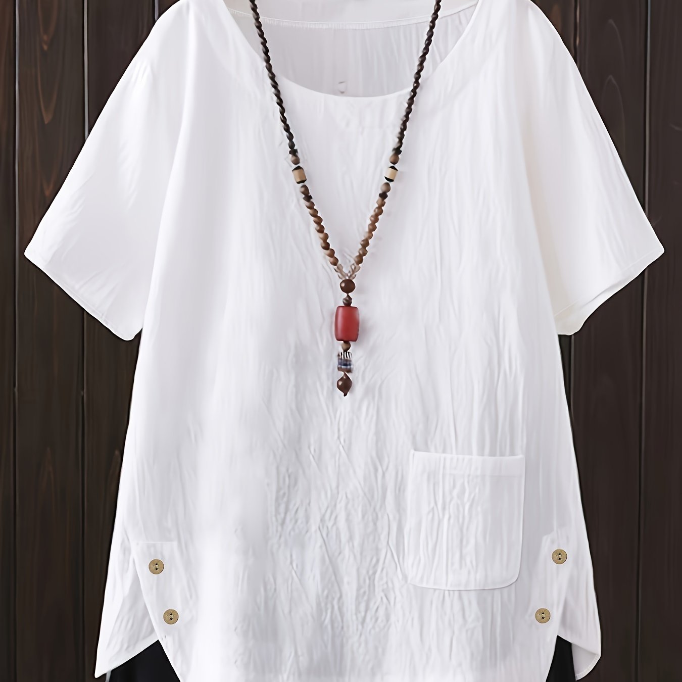 Katta o'lchamdagi O'rta Sharq uslubidagi cho'ntakli, yumshoq bo'yinli va cho'zilmaydigan matodan tayyorlangan bluzka, barcha fasllar uchun mos keladi.
