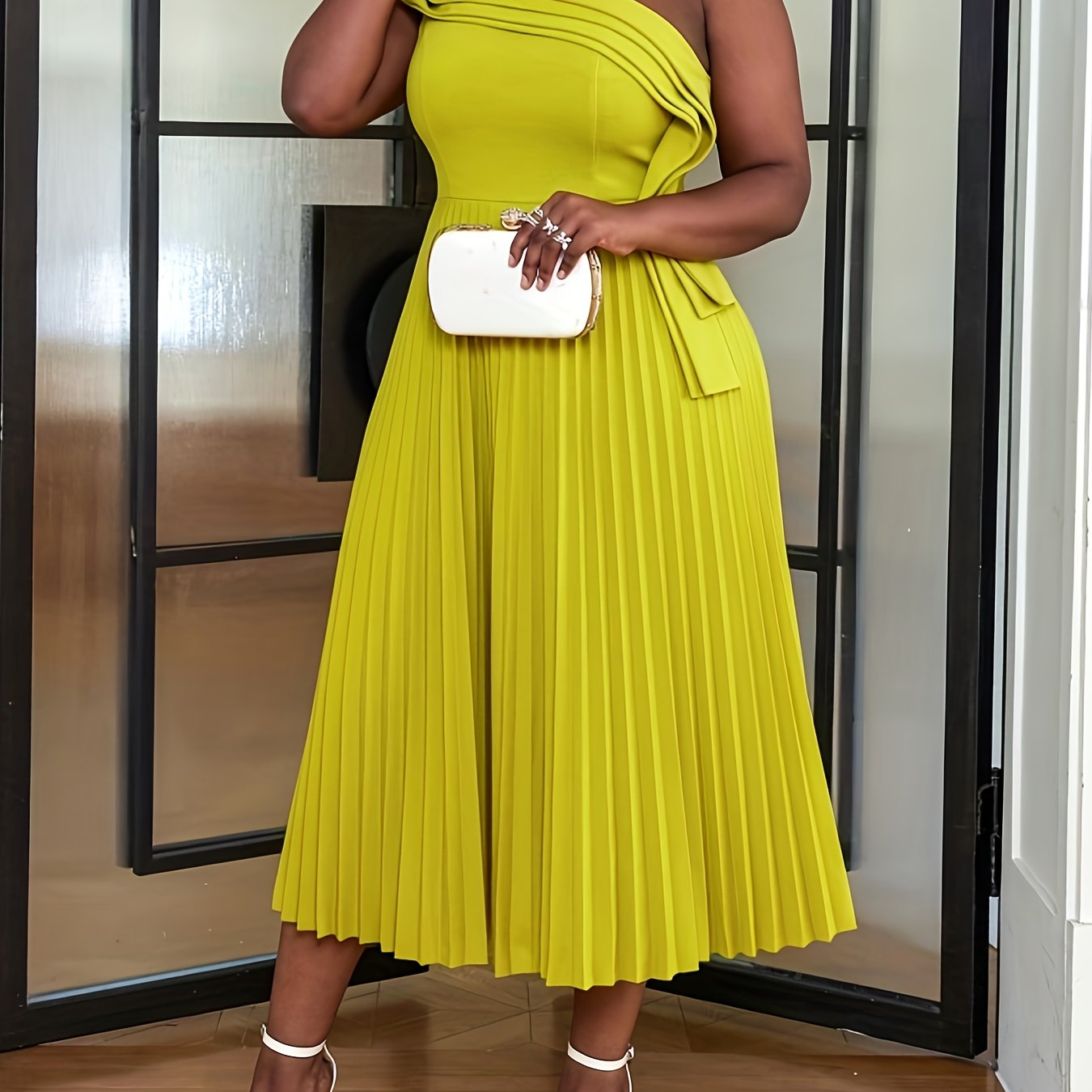 Plus o'lchamli bitta yengli pleated midi kiyim polyester elastan to'liq rangli kengaytirish barcha fasllar uchun mos