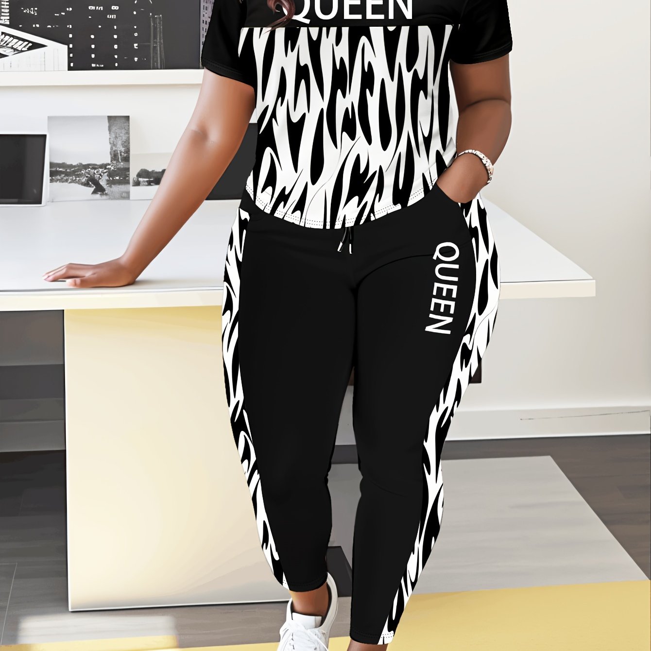 Katta O'lchamli Qirolicha Harfli Ikki Qismli To'plam, Yengsiz Qisqa Yengli T-Shirt va Shimlar, Ayollar uchun Katta O'lchamli Kiyimlar
