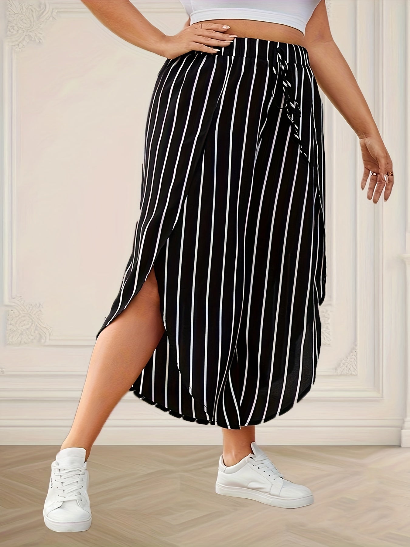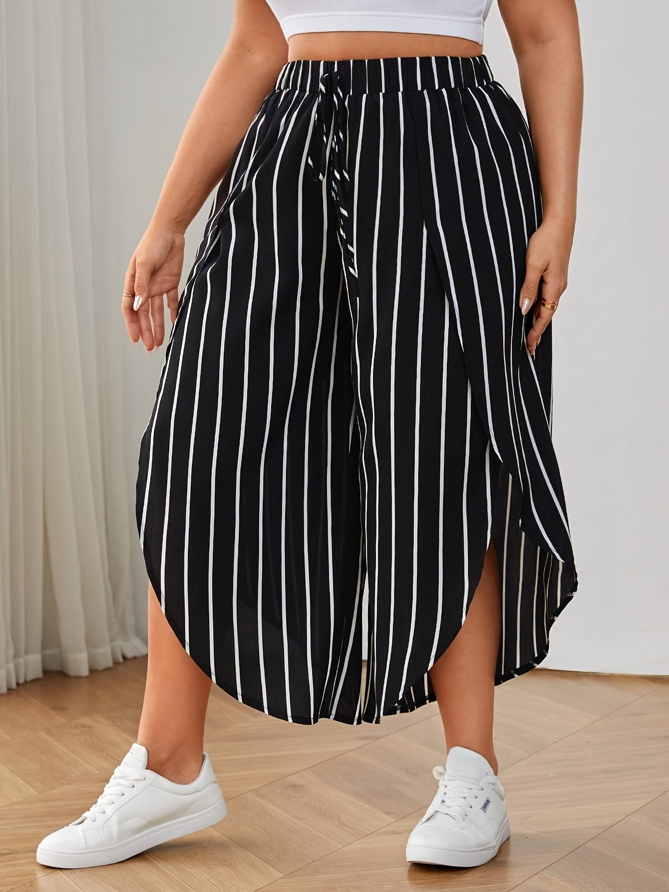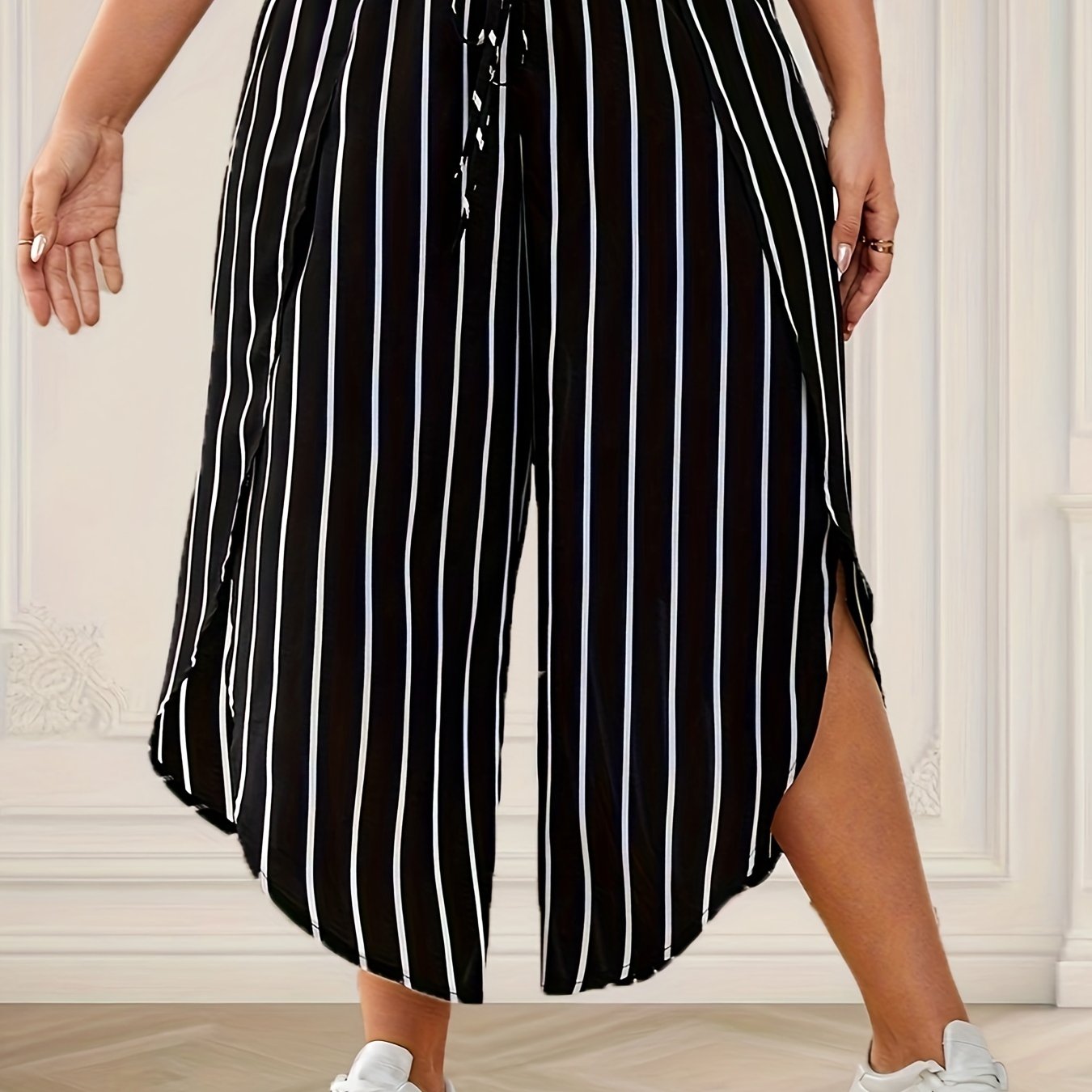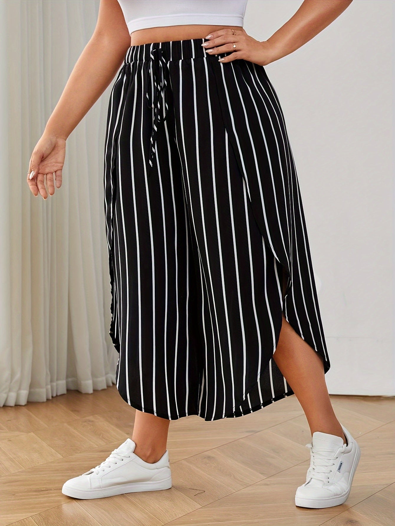 Katta o'lchamdagi chiziqli keng shimlar bahor va yoz uchun, ayollar uchun tasodifiy keng oyoqli yuqori bel shimlar