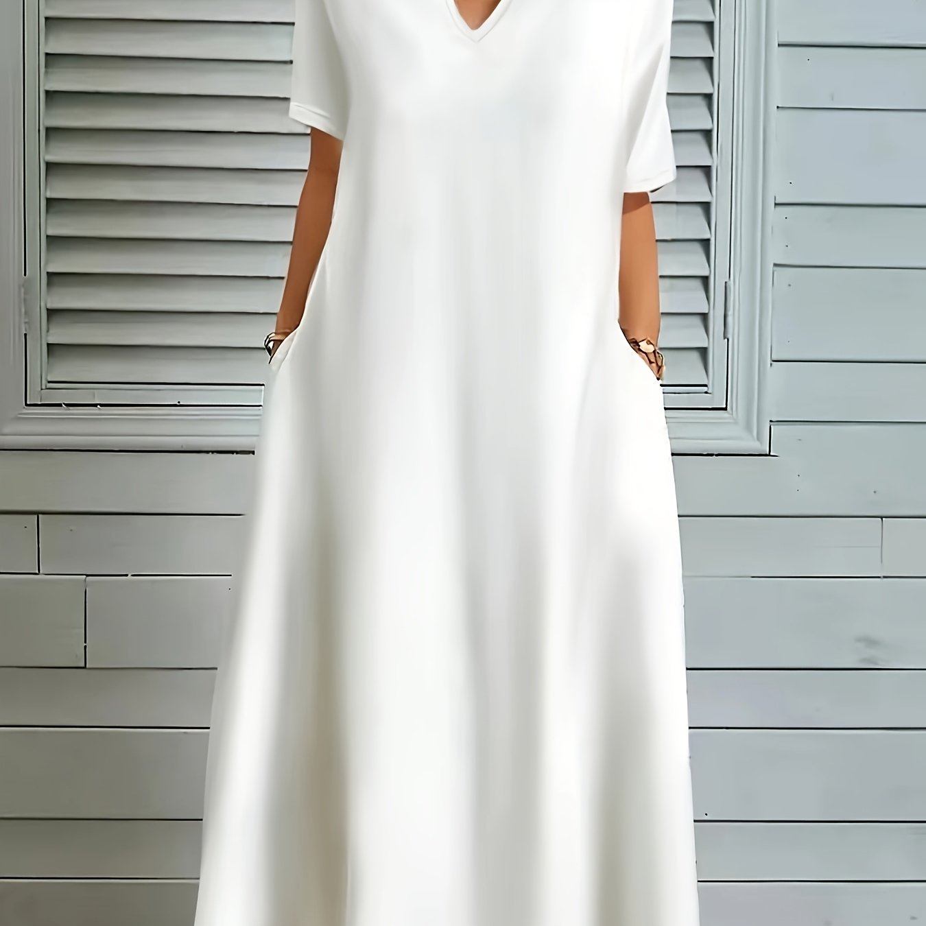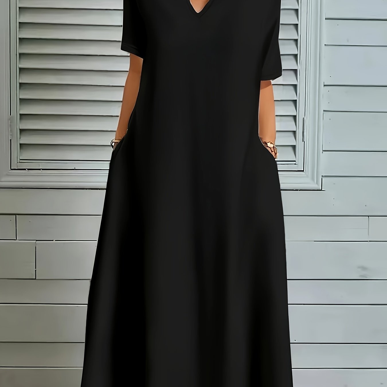 Katta o'lchamdagi V-yuqa ko'ylak, mustahkam rangdagi polyester to'qima bilan uzun kengaytirilgan pastki qismi. O'rtacha cho'zilish, pullover uslubi va tasodifiy kuz/qish kiyimlari uchun cho'ntak tafsiloti.
