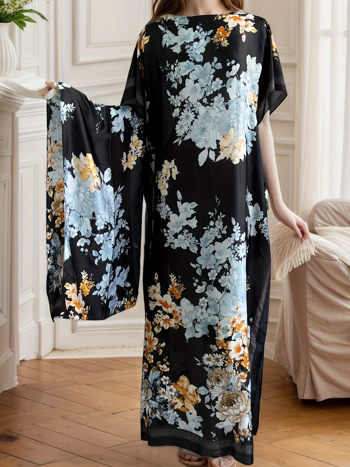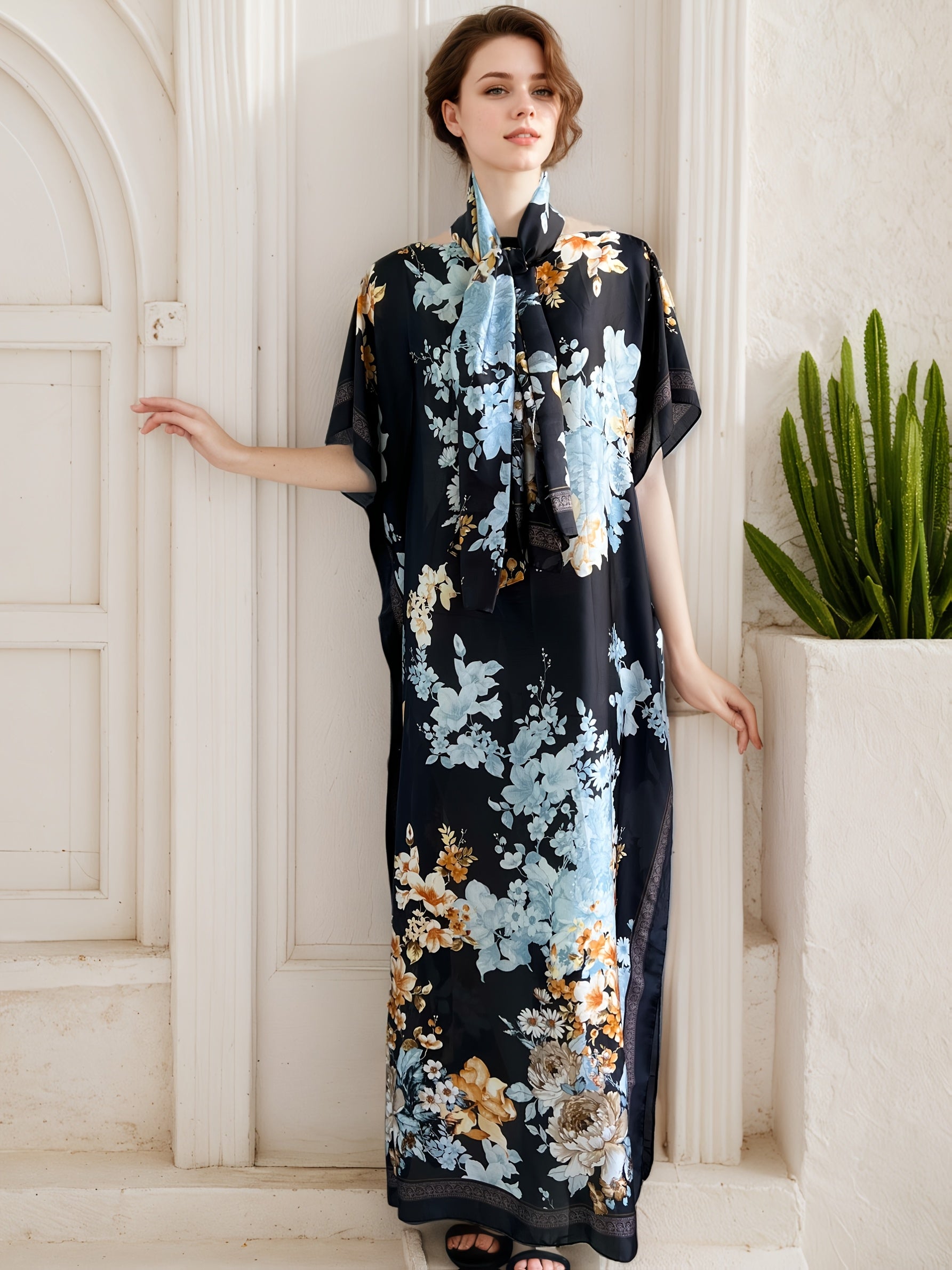 Plus o'lcham ayollar uchun qora gullik maxi kiyim va sharf, qisqa qo'l, erkin fit